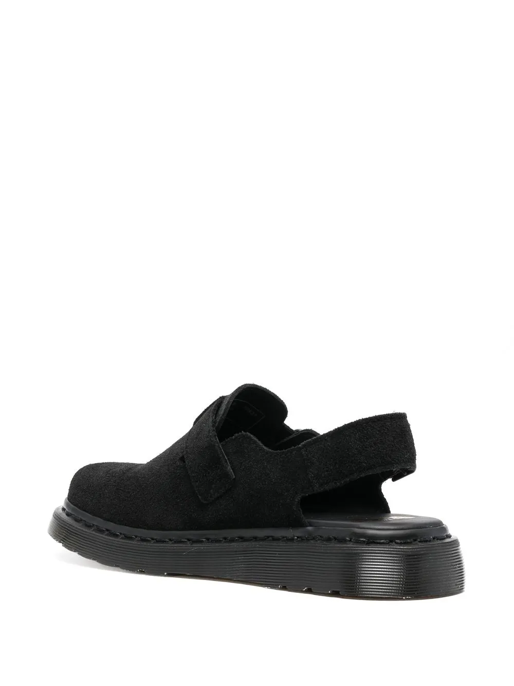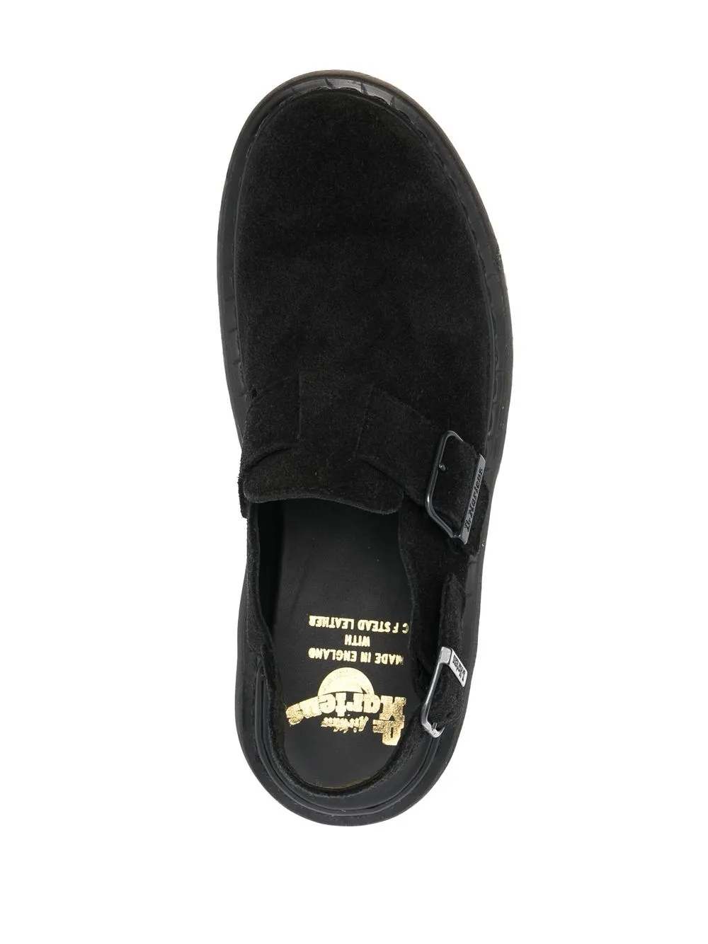 Negro, ante, puntera redonda, cierre lateral con hebilla, plantilla con logo y suela plana de goma.