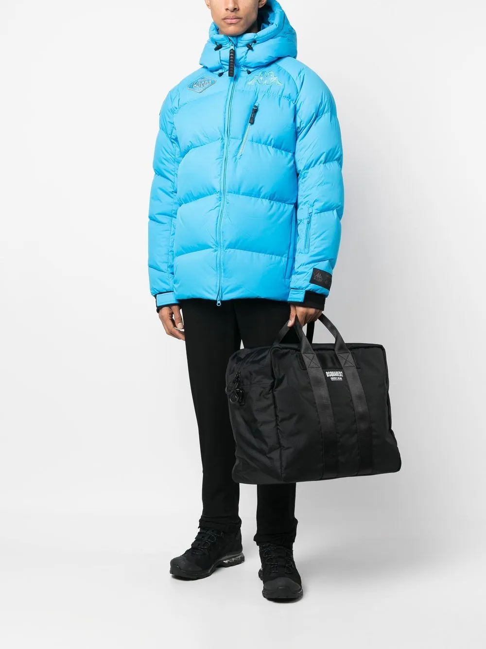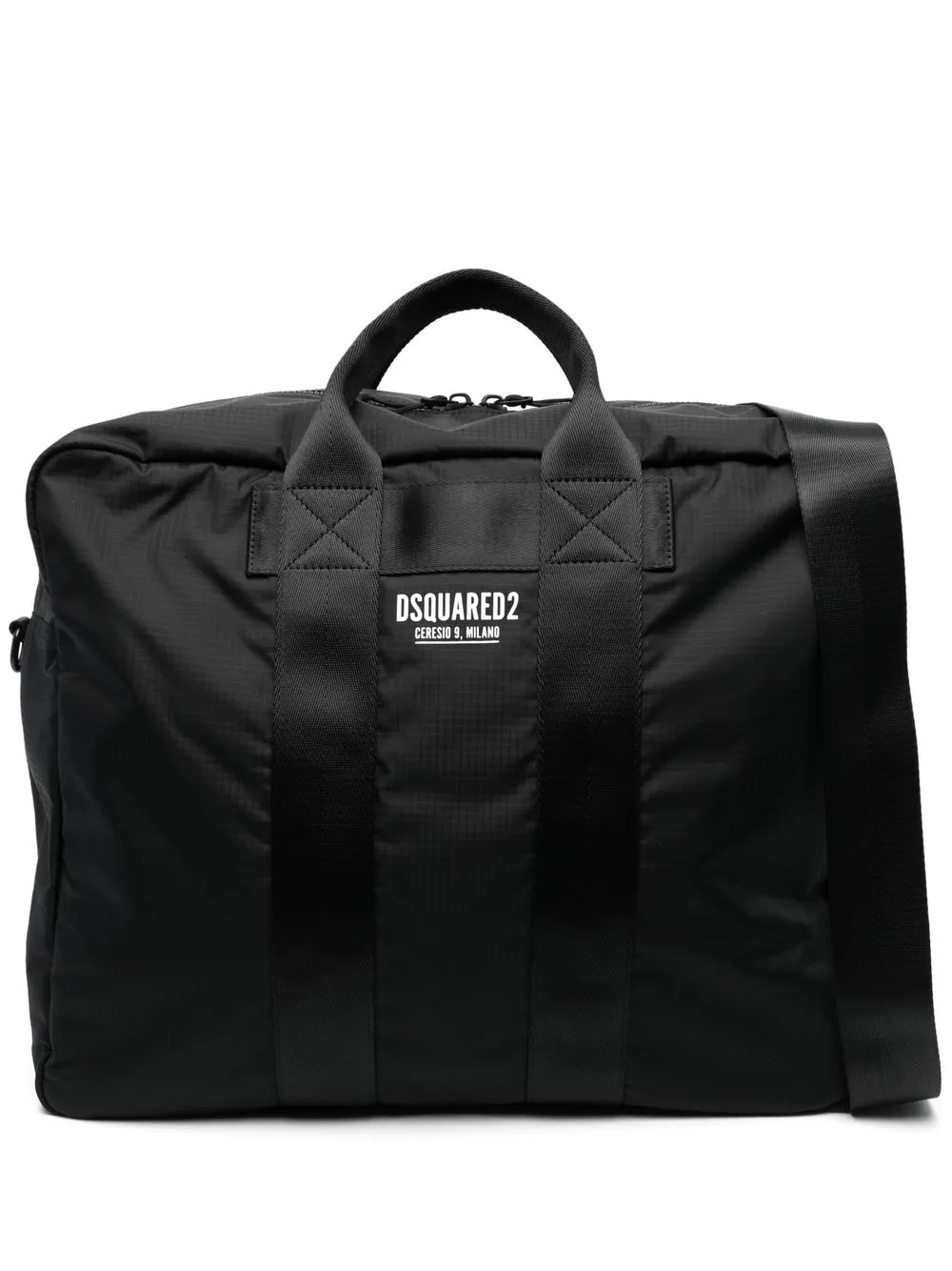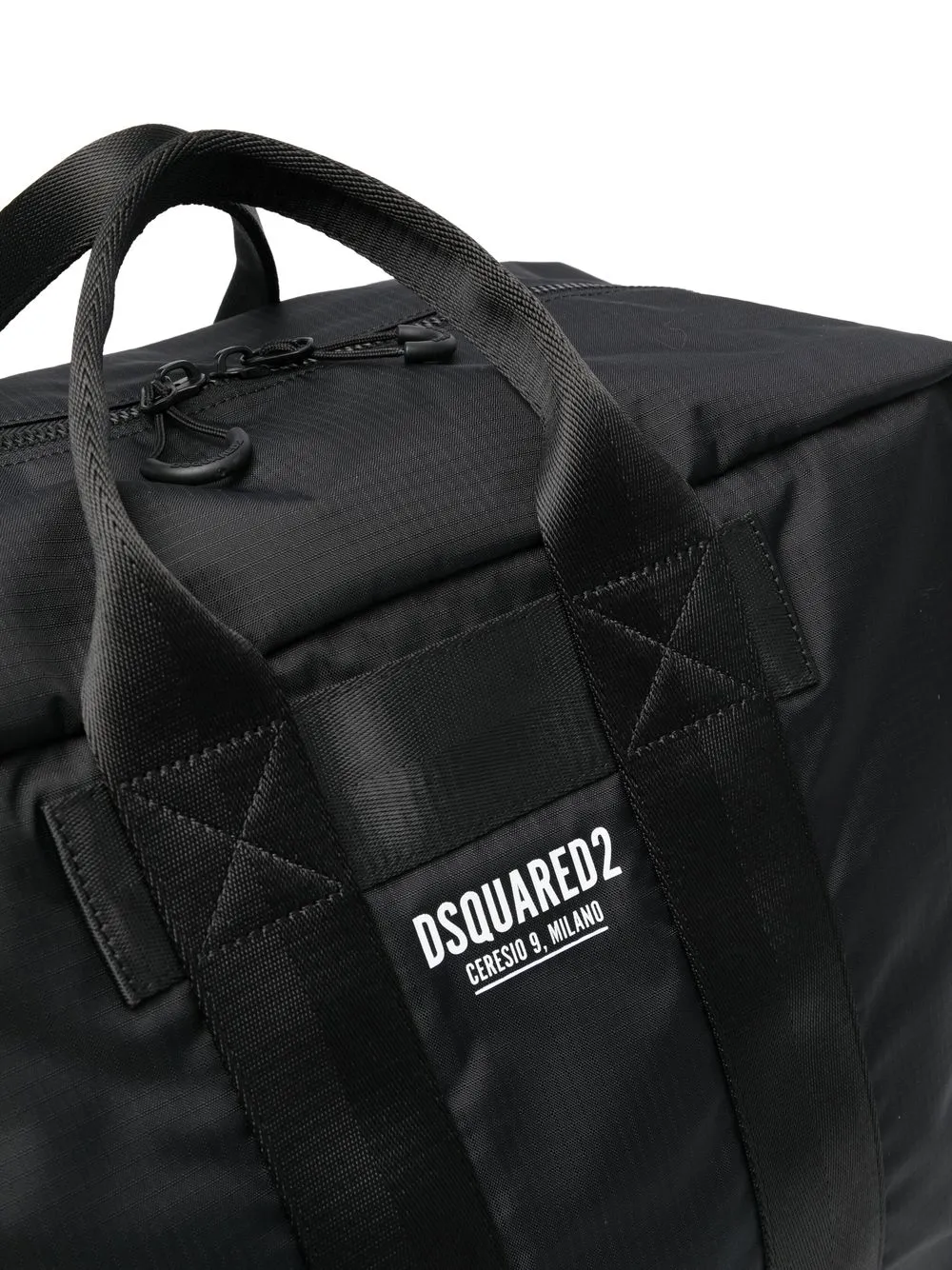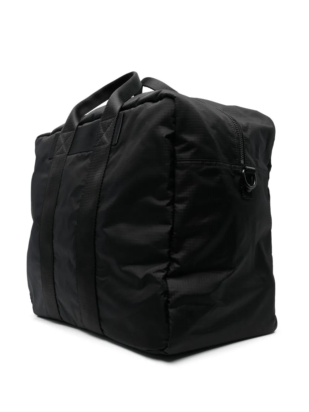 Negro, textura de ripstop, estampado del logo en la parte delantera, cierre con cremallera en el tope, compartimento principal, bolsillo interno con cremallera y dos asas planas en la parte superior.