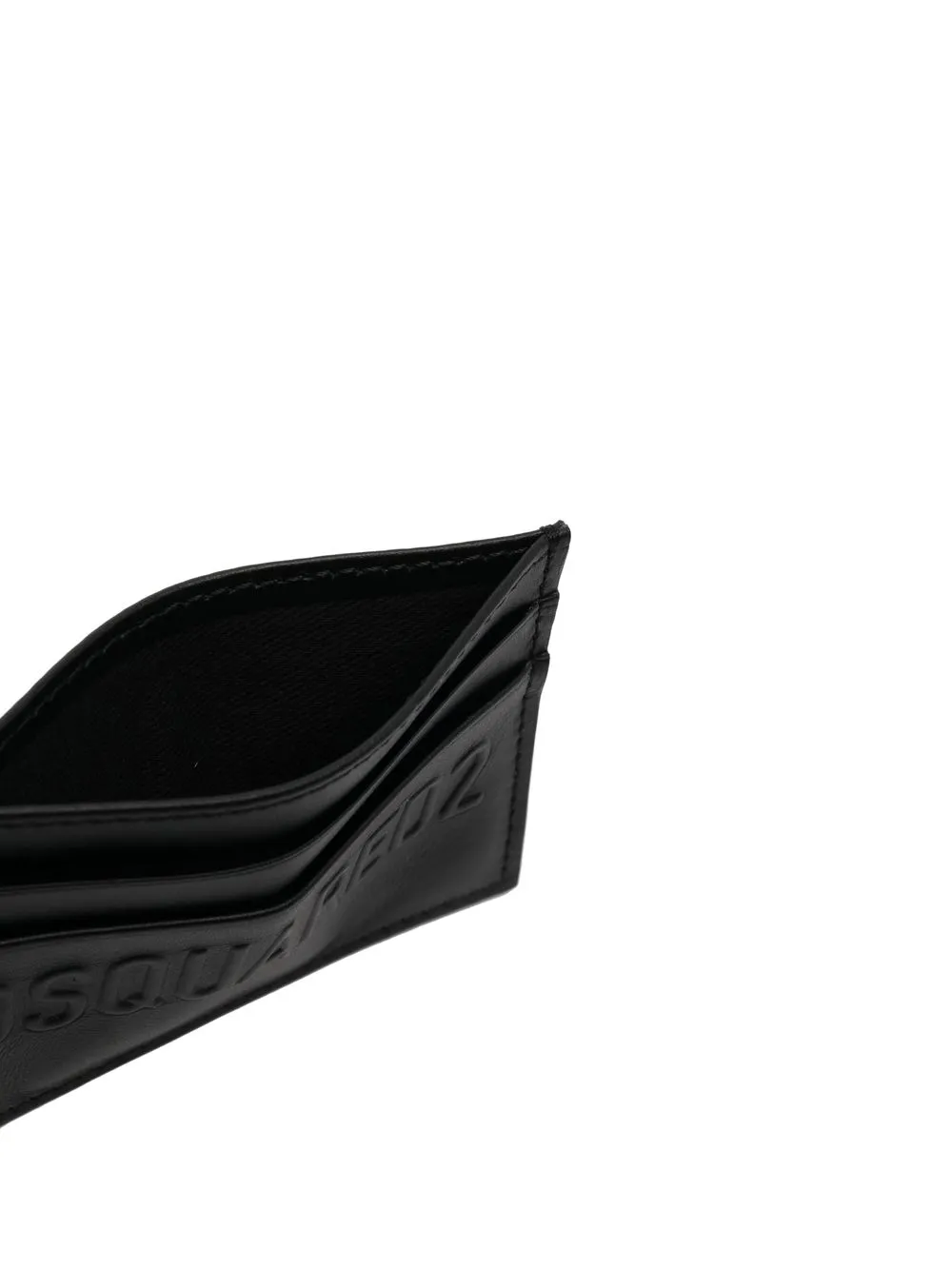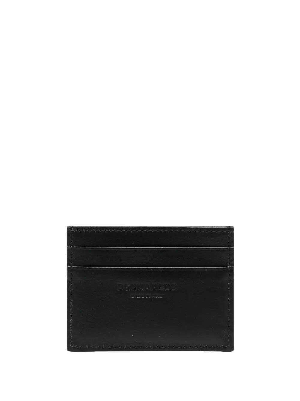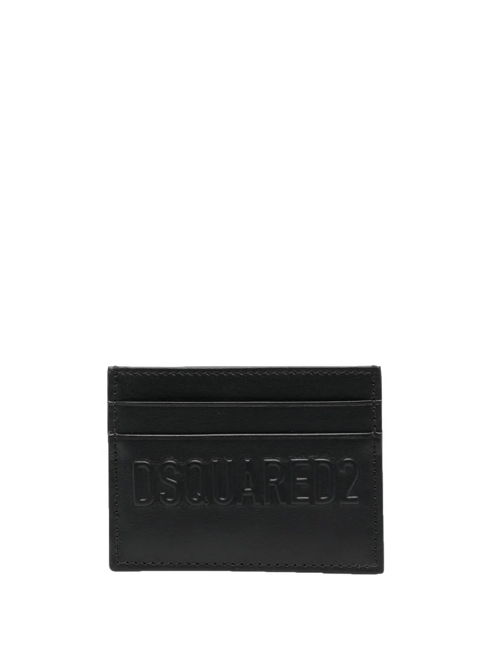 Negro, piel de becerro, logo grabado en la parte delantera, compartimentos para tarjetas y forma rectangular.