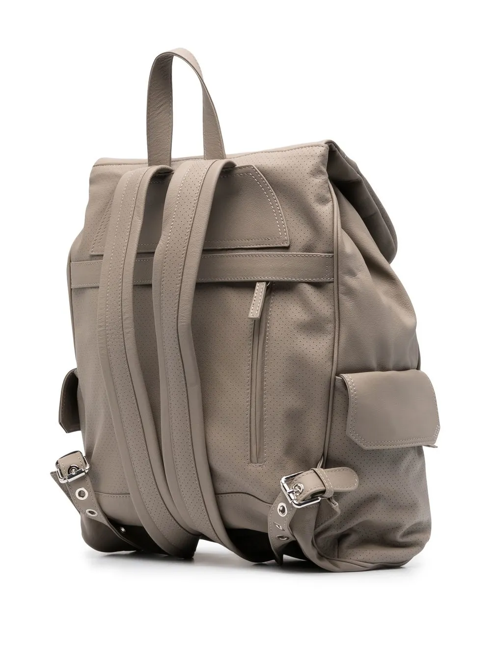 Beige, piel de becerro, detalle de perforaciones, acabado en tono plateado, dos bolsillos laterales con solapa, asa plana en la parte superior, dos correas ajustables para los hombros, parte superior plegable, cierre con cordón, compartimento principal y bolsillo interno con cremallera.