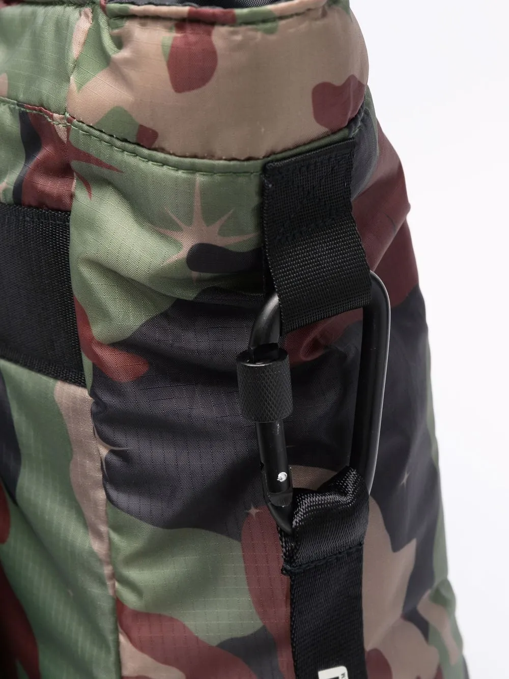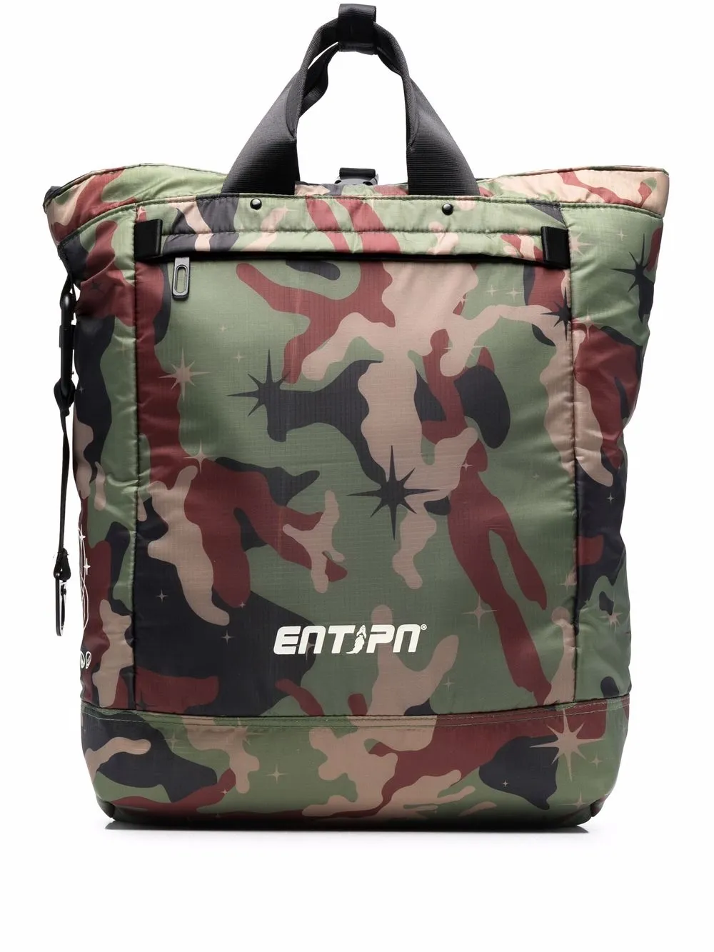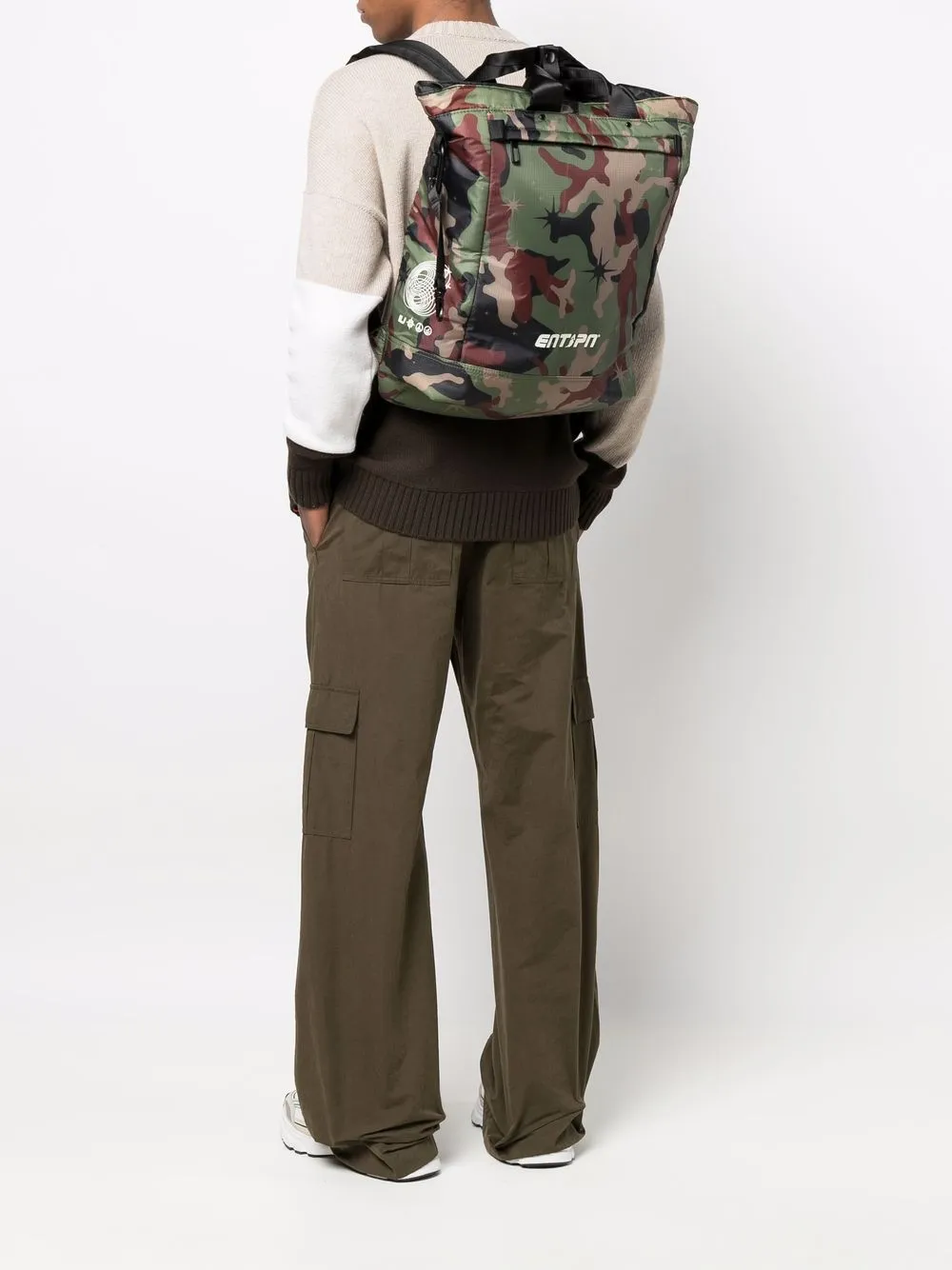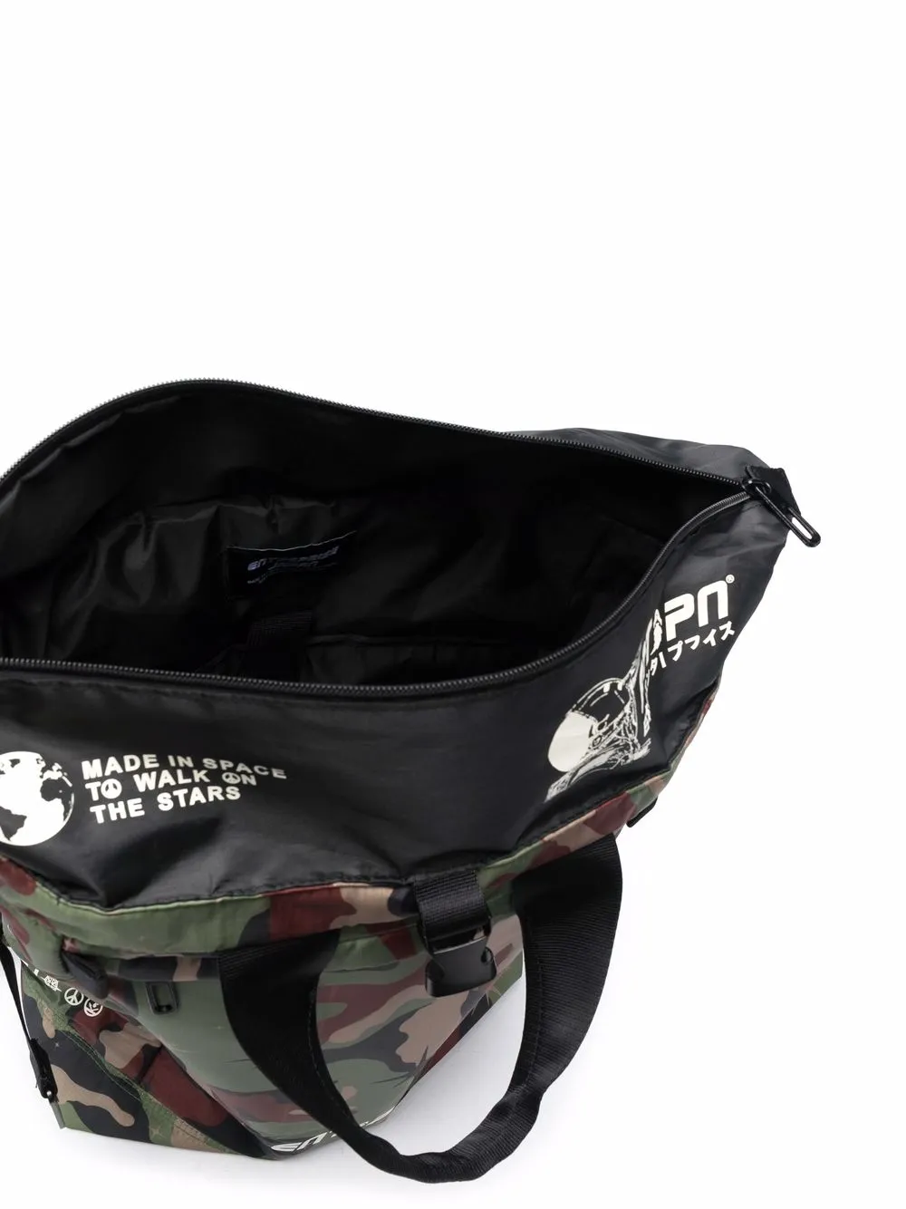 Estampado militar, estampado del logo en la parte delantera, bolsillo con cremallera en la parte delantera, cierre con cremallera en el tope, compartimento principal, correas de hombro ajustables y asa redonda en la parte superior.