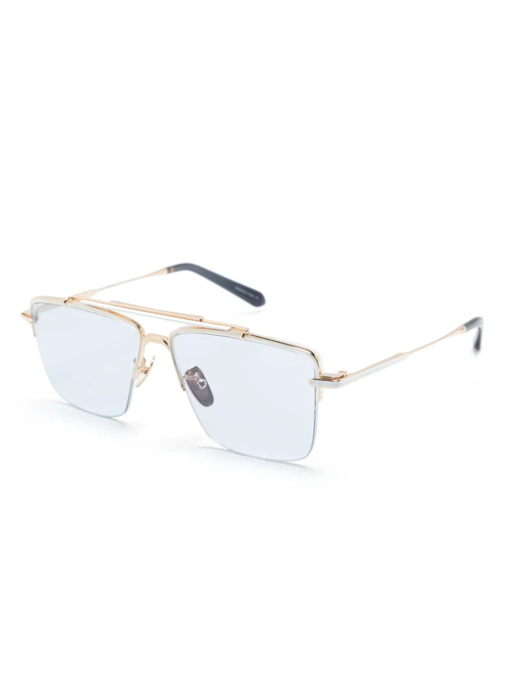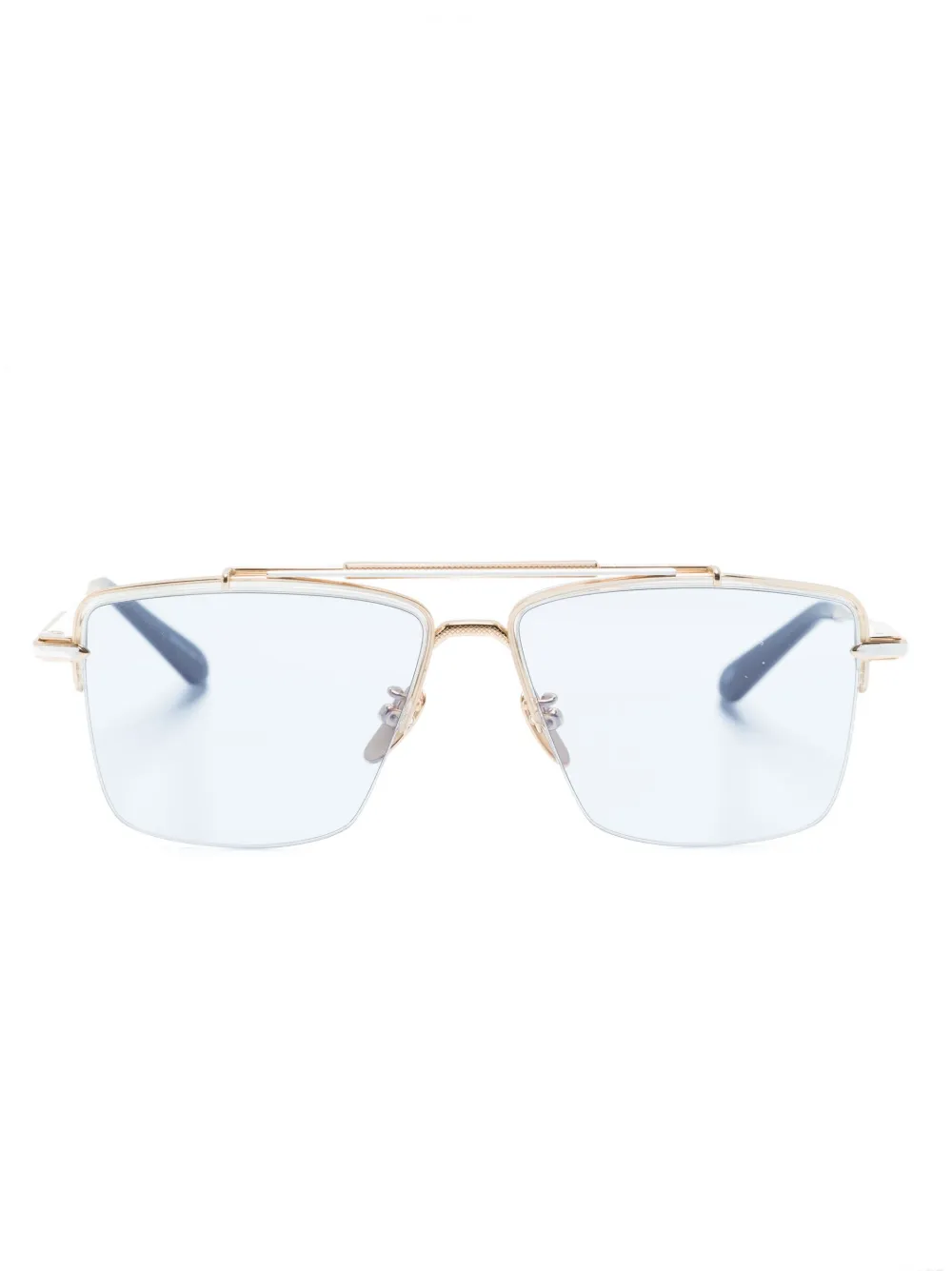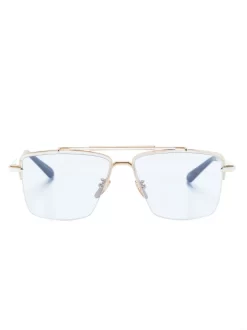 Dorado, blanco, azul marino, titanio, montura navigator, diseño de media montura, lentes de color azul, lentes con protección UV, doble puente, almohadillas para la nariz, patillas rectas y puntas curvadas. Estas gafas vienen con un estuche de protección..