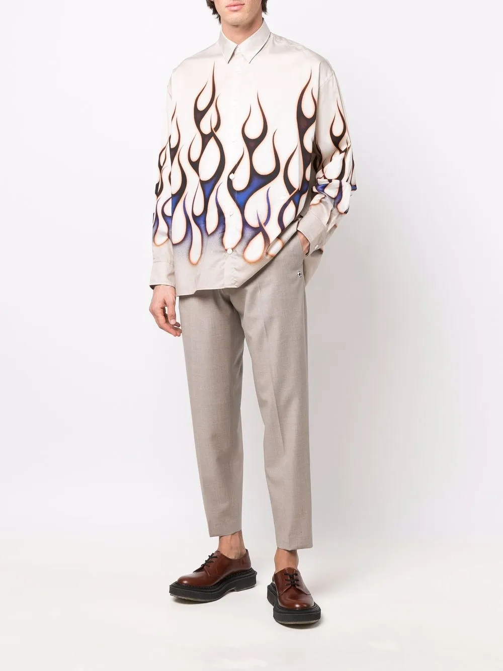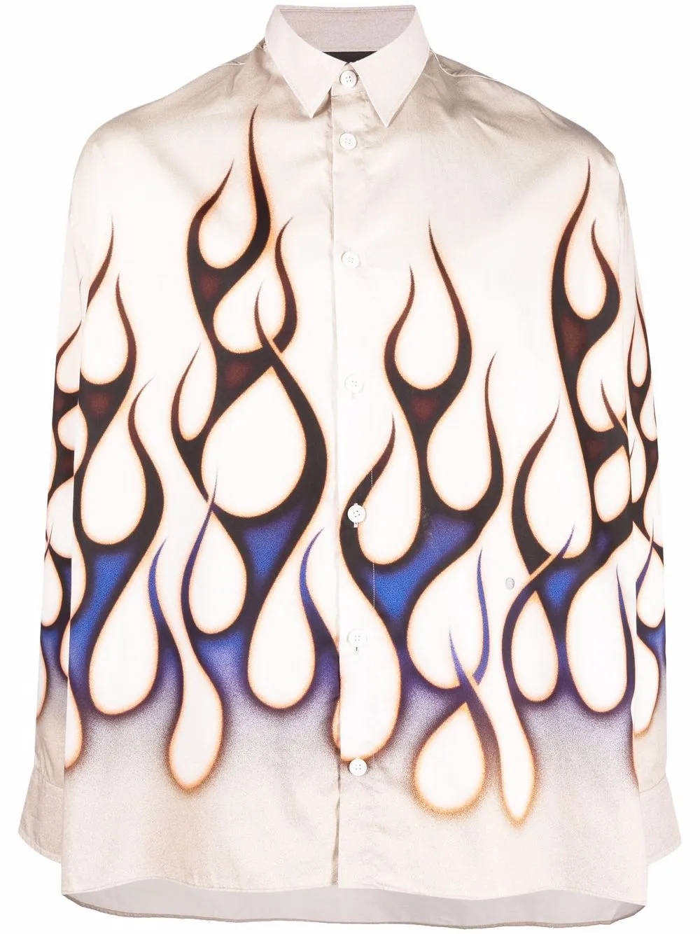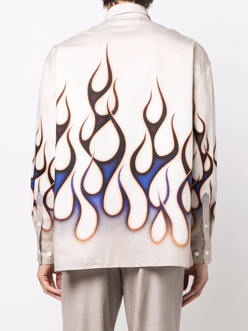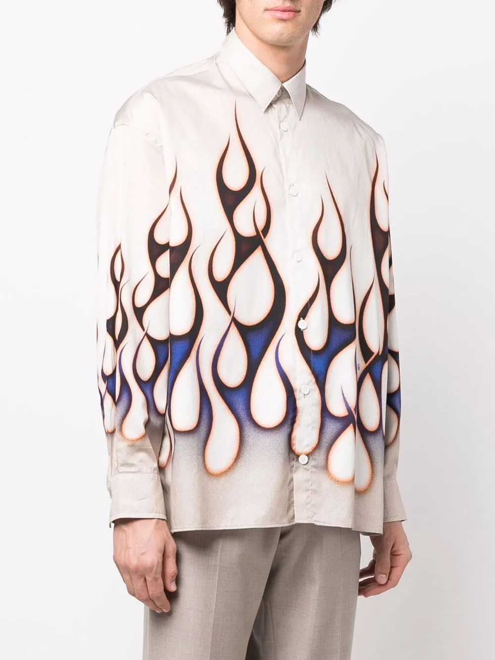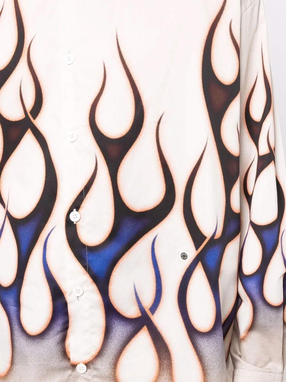 Estampado de llamas, cuello clásico, cierre con botones en la parte delantera, manga larga, dobladillo recto y borde rematado. Material: algodón orgánico.