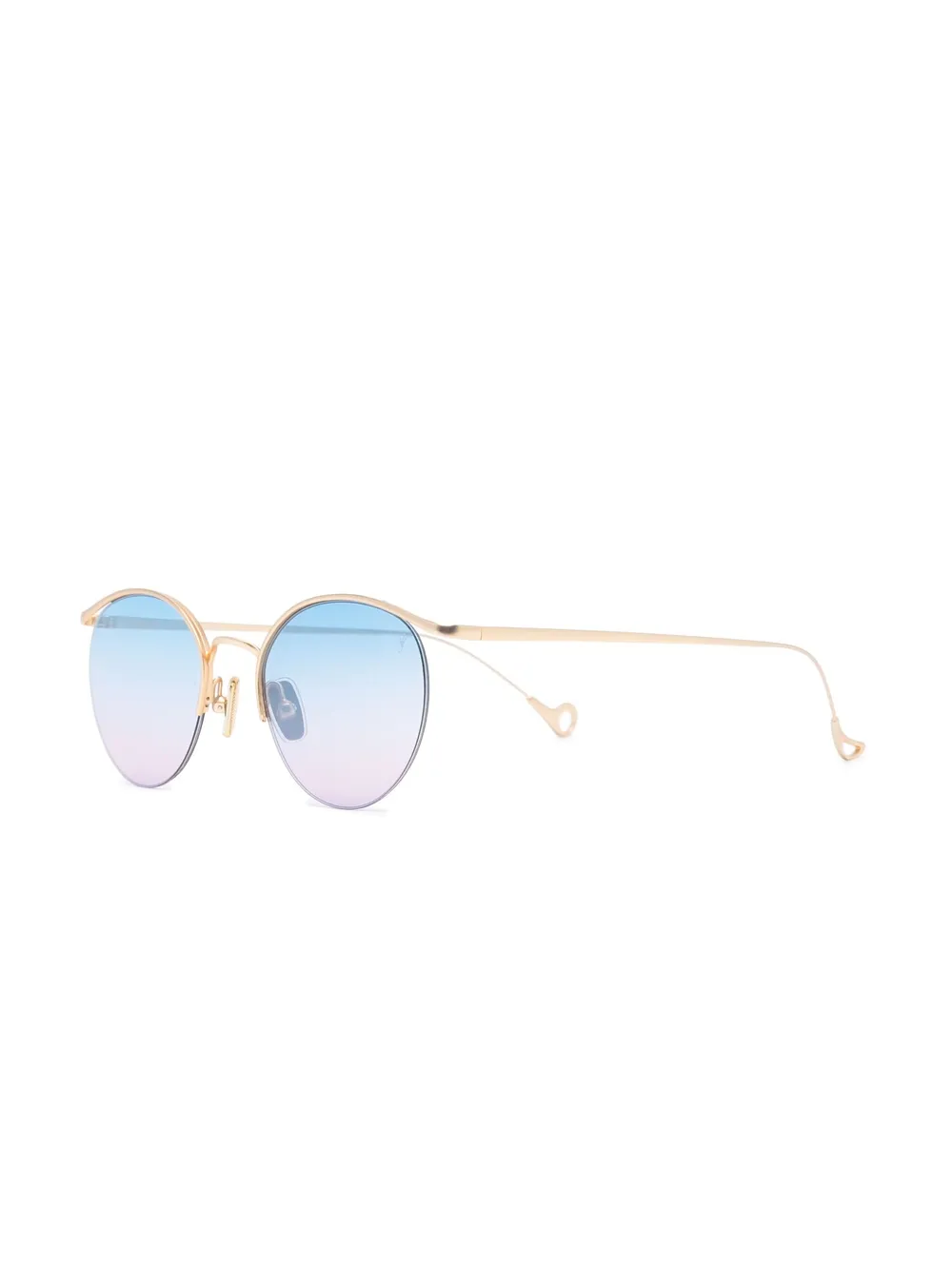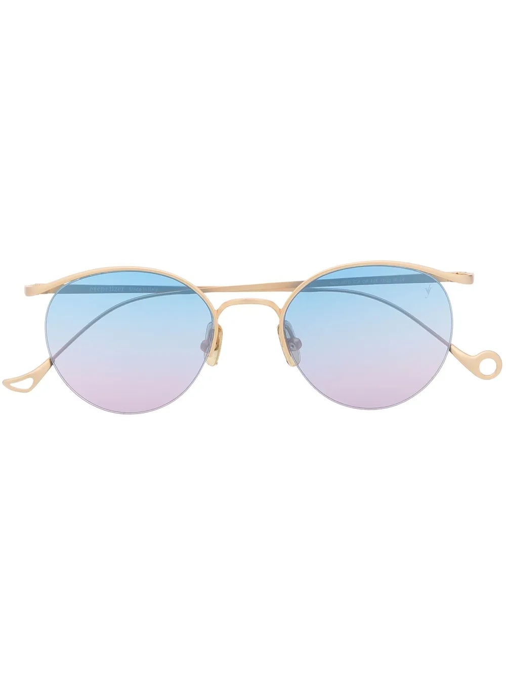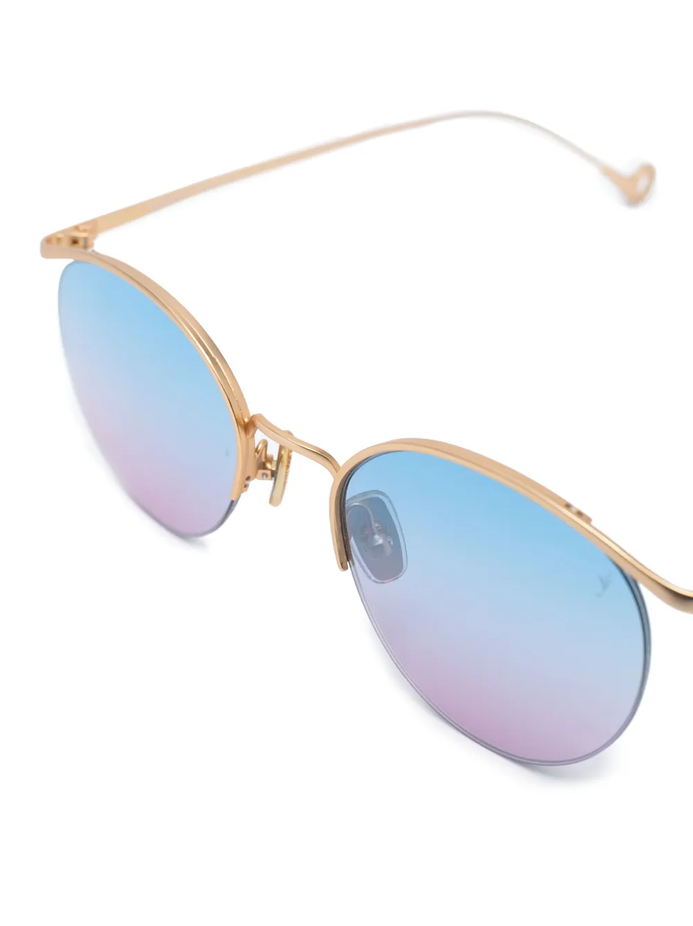 Dorado, titanio, lentes degradadas, almohadillas para la nariz, montura redonda, patillas rectas y puntas curvadas.