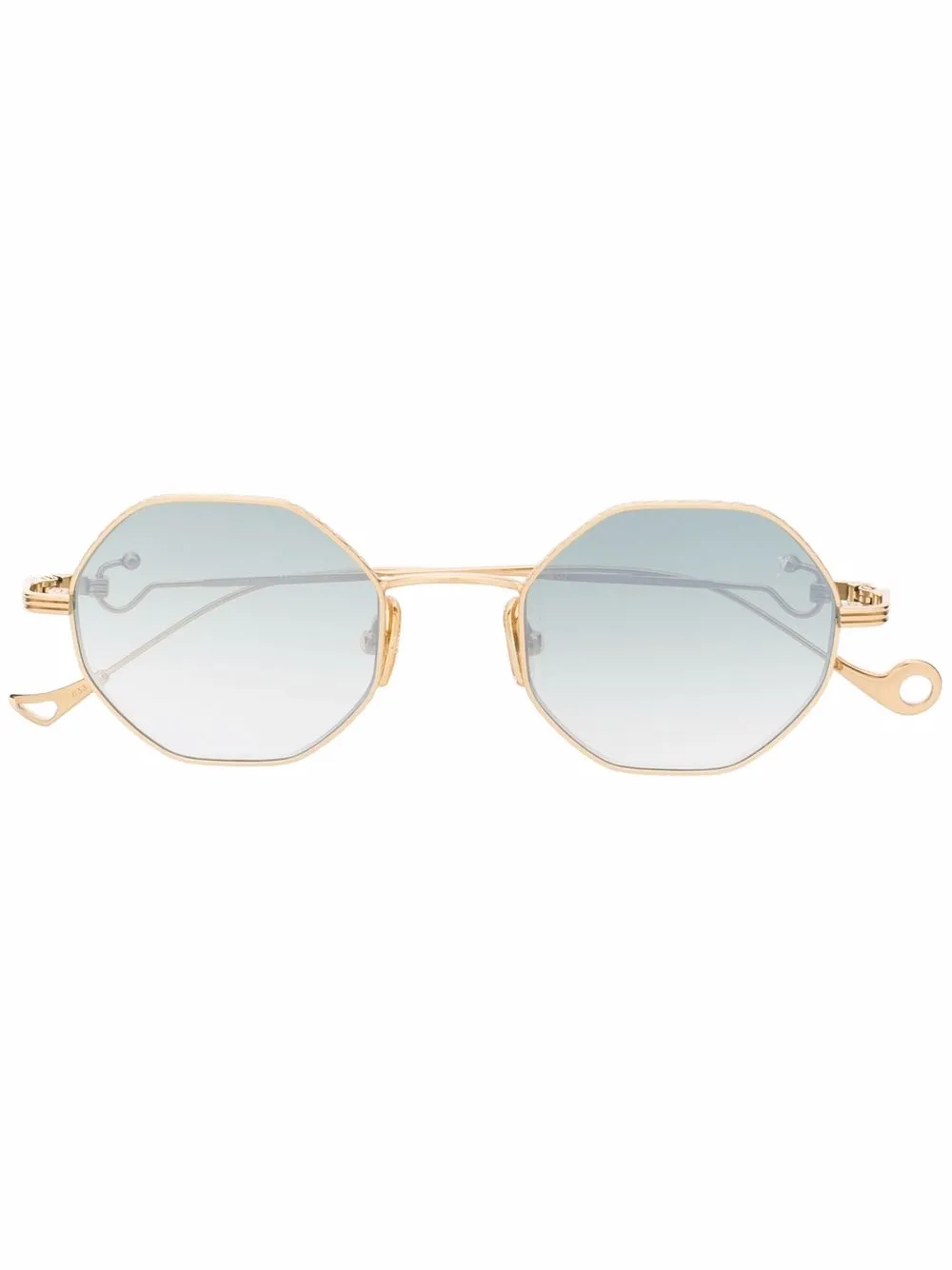 Montura geométrica, lentes de color azul, patillas rectas y puntas curvadas. Estas gafas vienen con un estuche de protección..