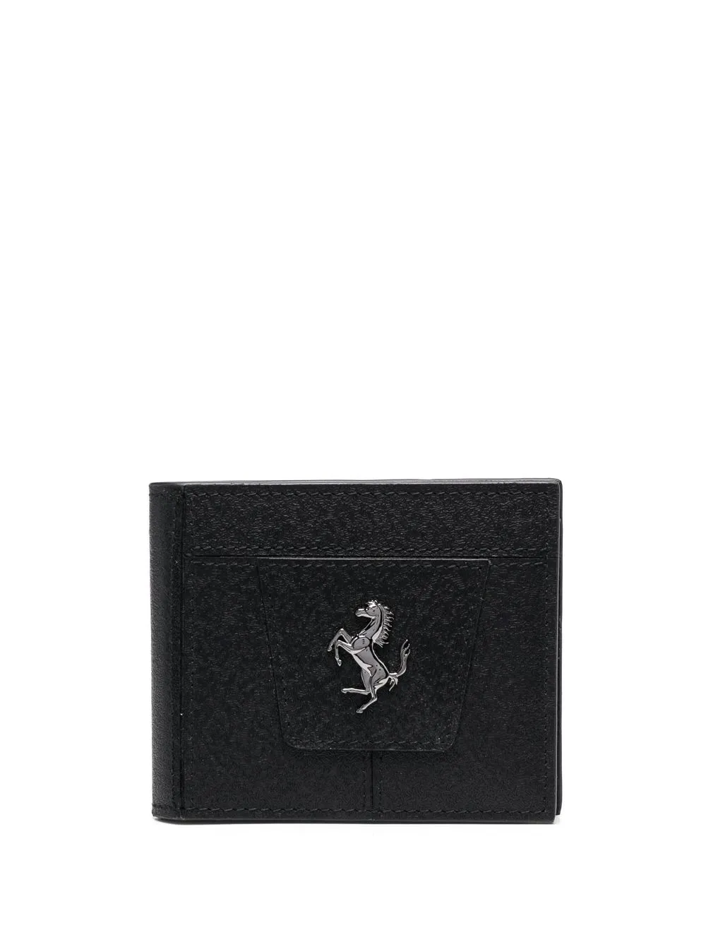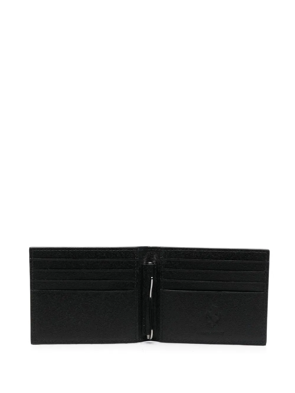 Negro, cuero, placa del logo, diseño plegable, clip para billetes y compartimentos internos para tarjetas.