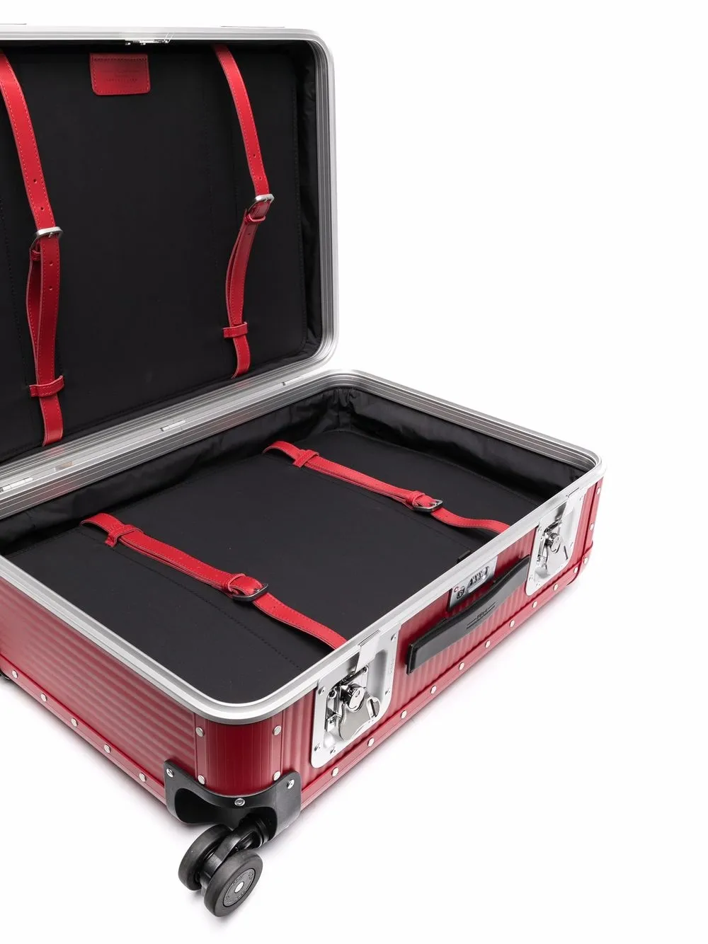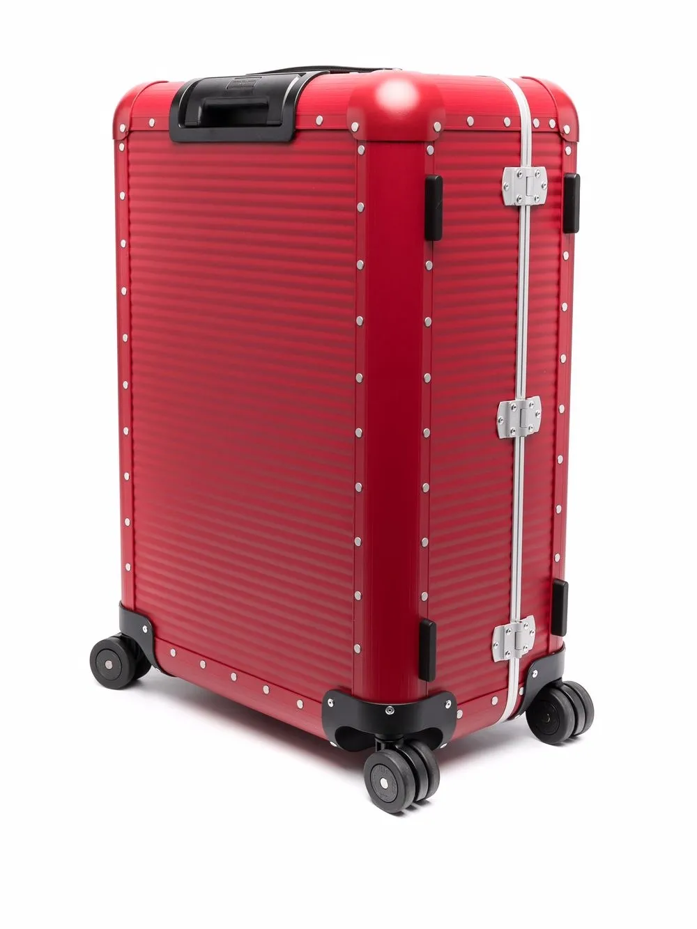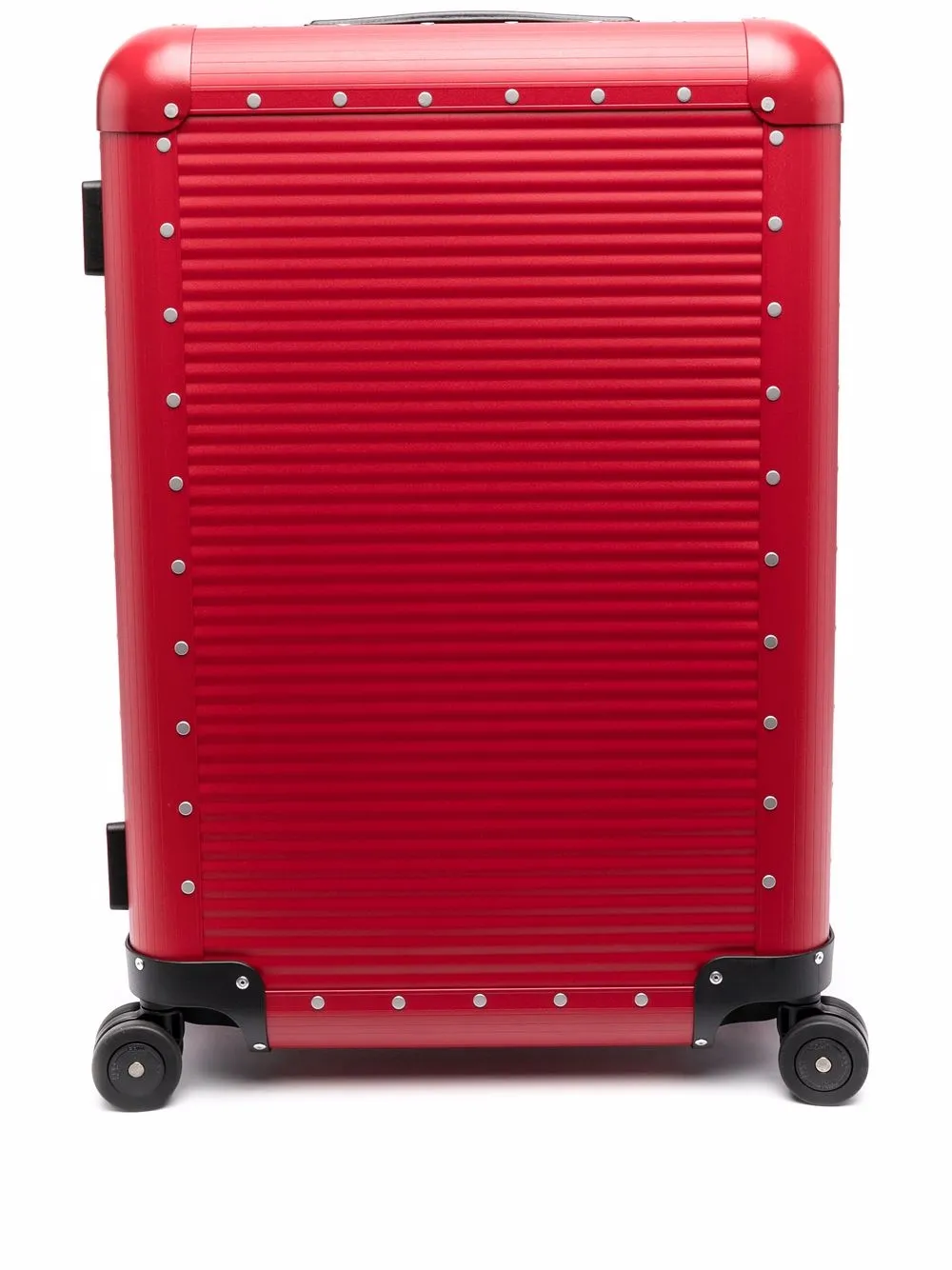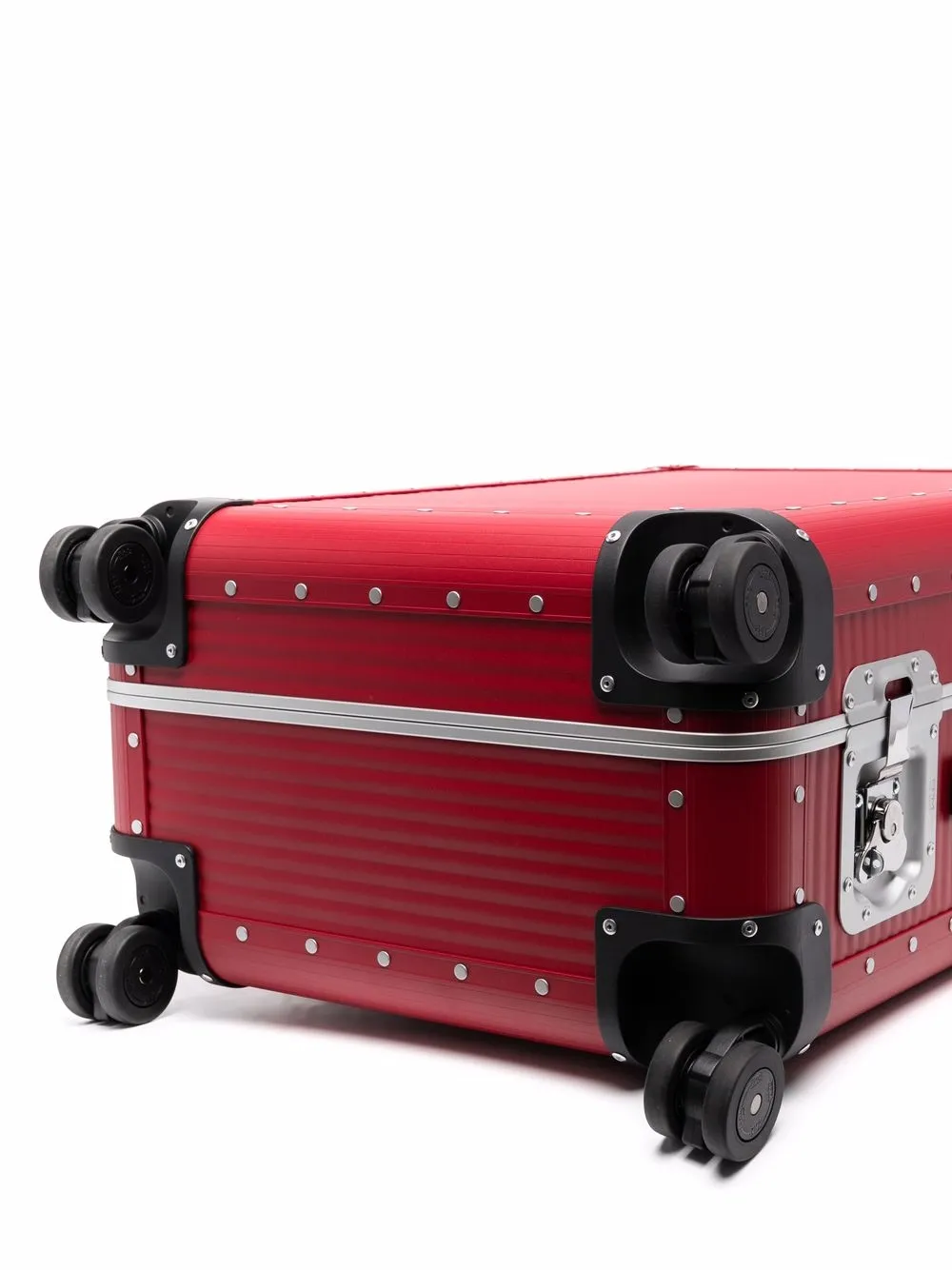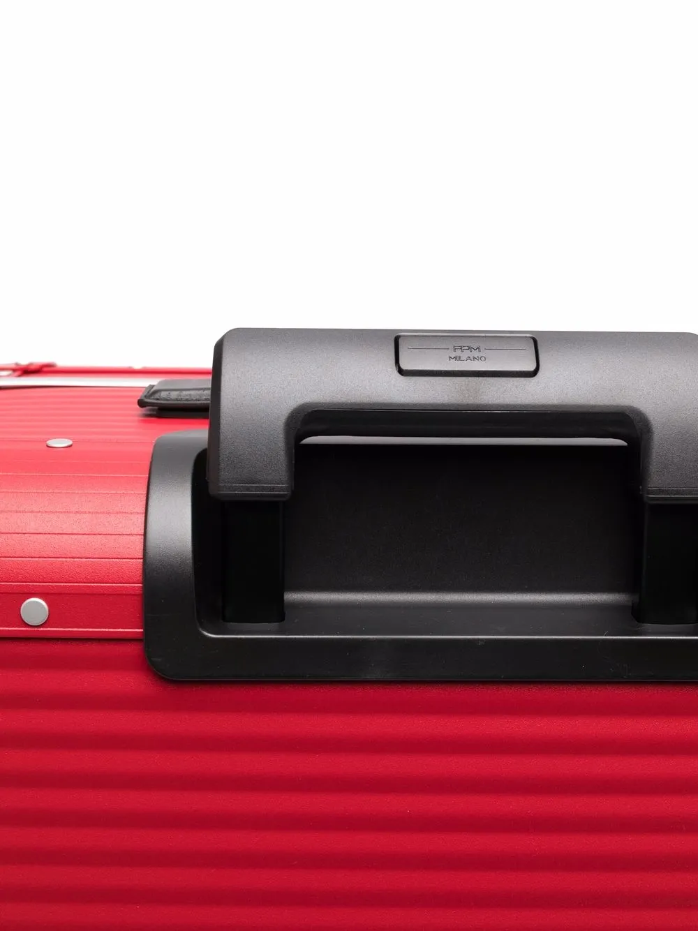 Maleta Bank Spinner 68 de FPM Milano con aluminio, detalle de canalé, detalles en tono plateado, asas laterales planas, cuatro ruedas, rojo cereza, cerradura TSA incorporada, dos cierres grandes de mariposa, cinturones internos hechos a mano, forro acolchado removible y asa superior.