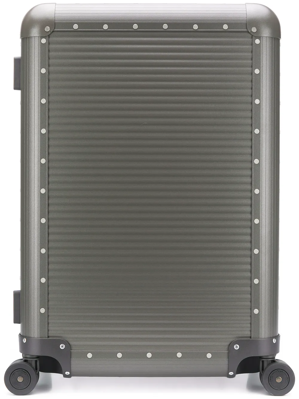 Maleta de viaje con apliques en piel de becerro de color gris de FPM – Fabbrica Pelletterie Milano con cierre con cremallera en el contorno, asa superior y ruedas en la base.