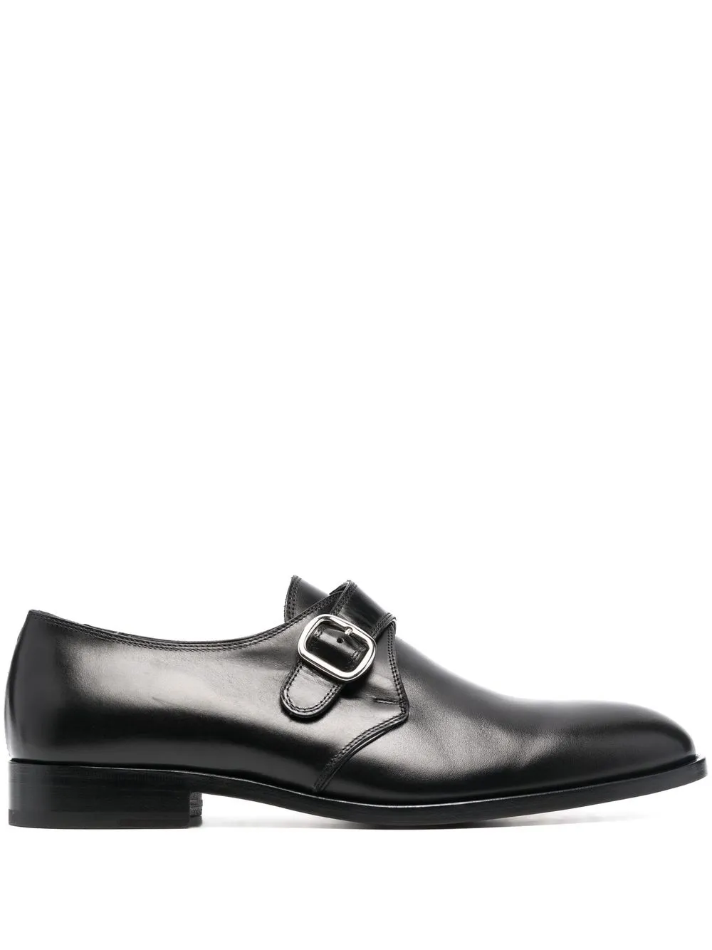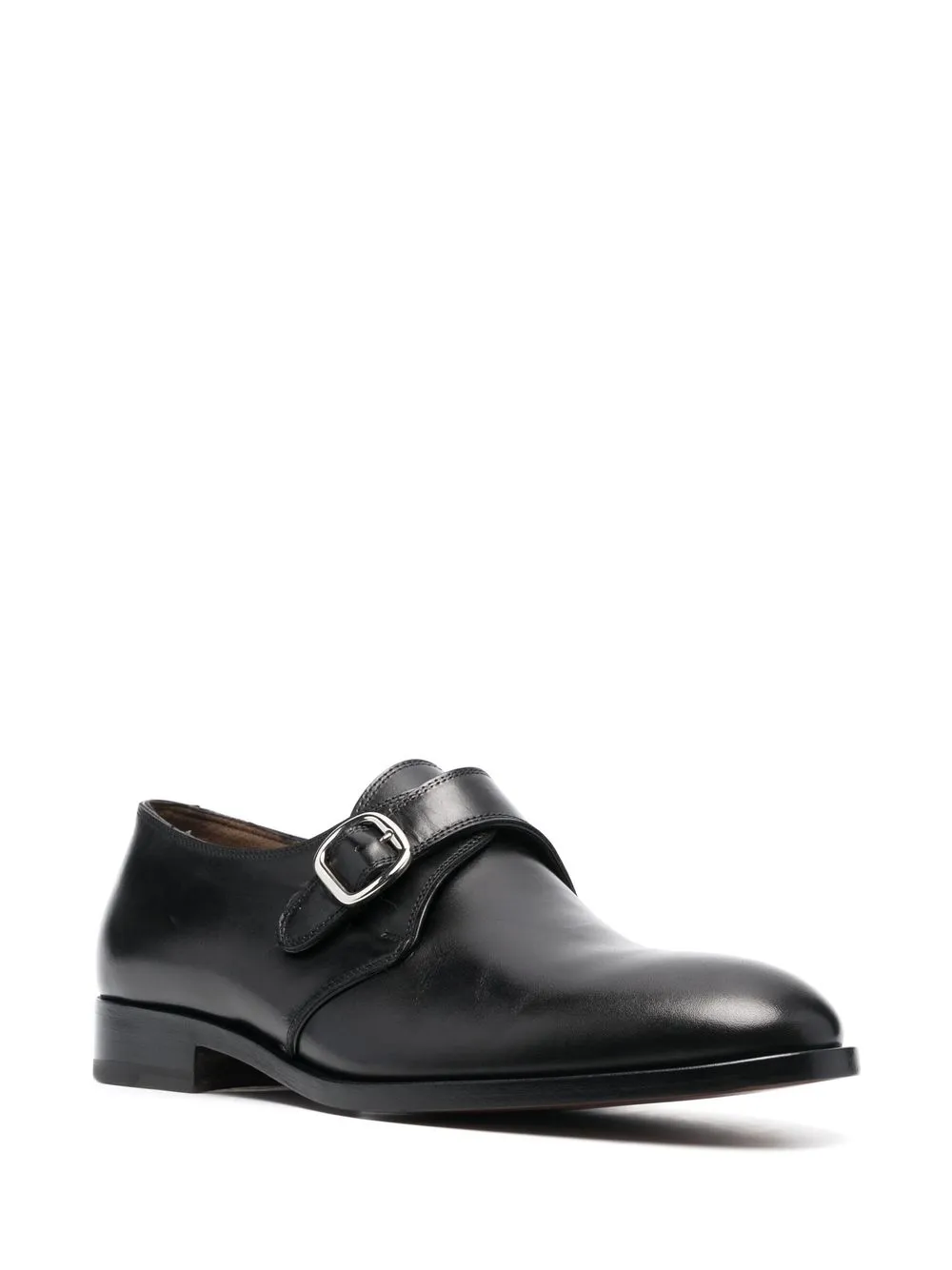 Negro, piel de becerro, acabado pulido, acabado en tono plateado, puntera de almendra, cierre con hebilla en la parte delantera, plantilla de piel con logo y tacón cuadrado bajo.
