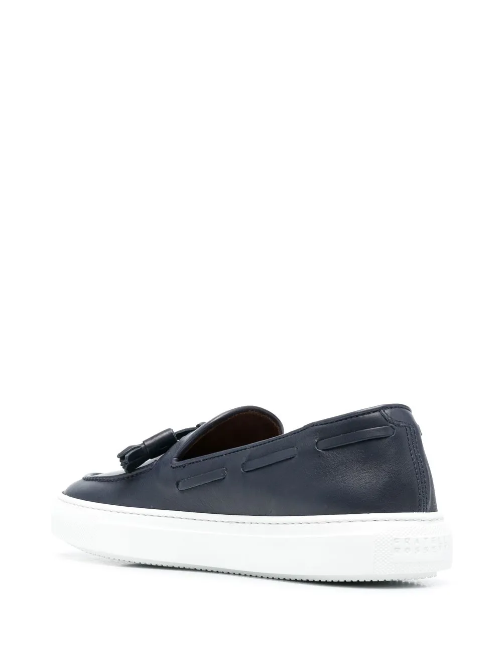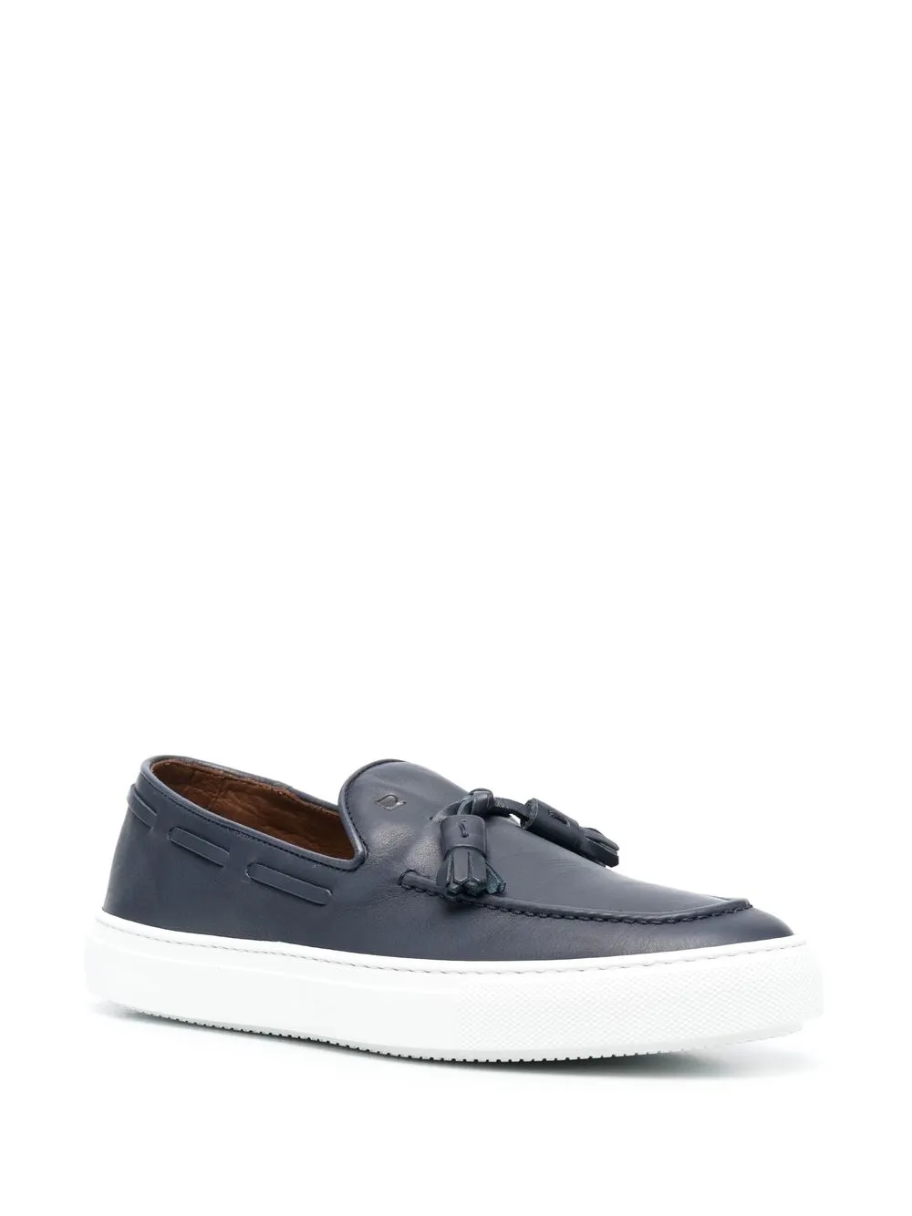 Azul marino, blanco, piel de becerro, detalle de borla, costuras del mismo tono, plantilla de piel con logo, puntera redonda, suela plana de goma y estilo slip-on