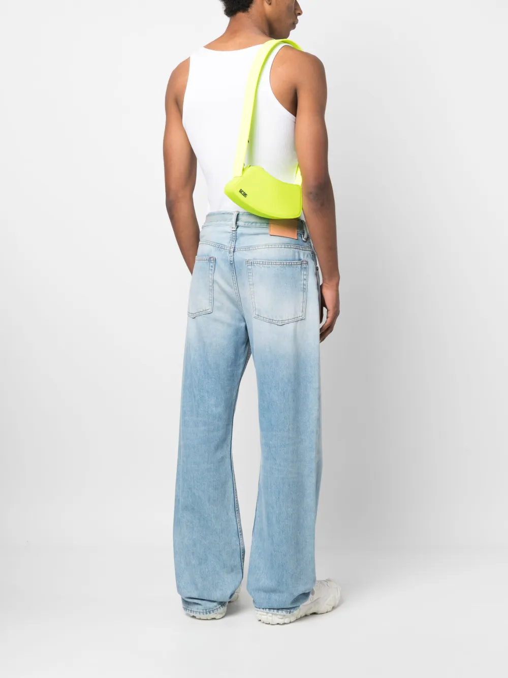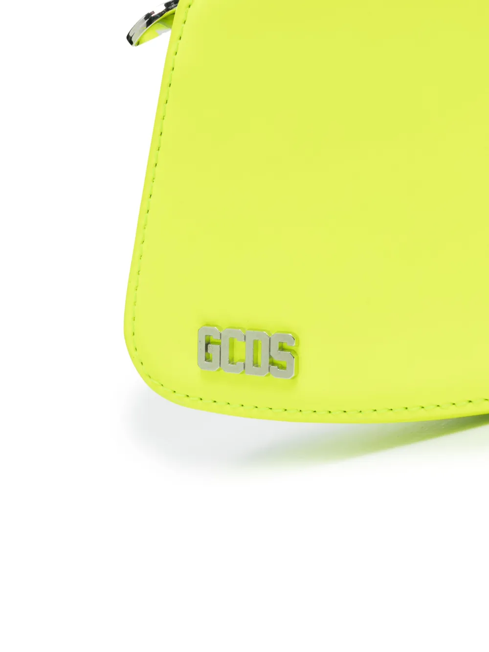Amarillo fluorescente, piel de becerro, placa del logo en tono plateado, parche del logo en el interior, logo en relieve en el interior, cierre con cremallera en el tope, correa de hombro removible y compartimento principal.