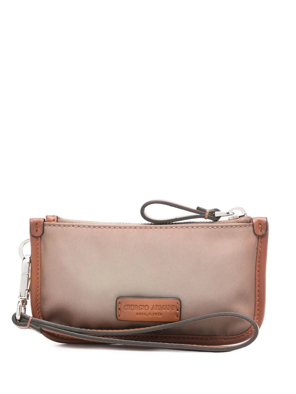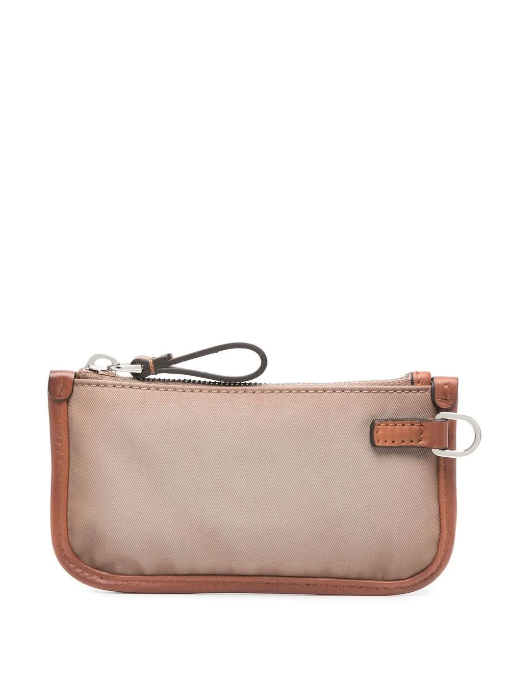 Marrón, ribete de cuero, parche del logo en la parte delantera, cierre con cremallera en el tope, correa de muñeca removible y bolsillo interno.