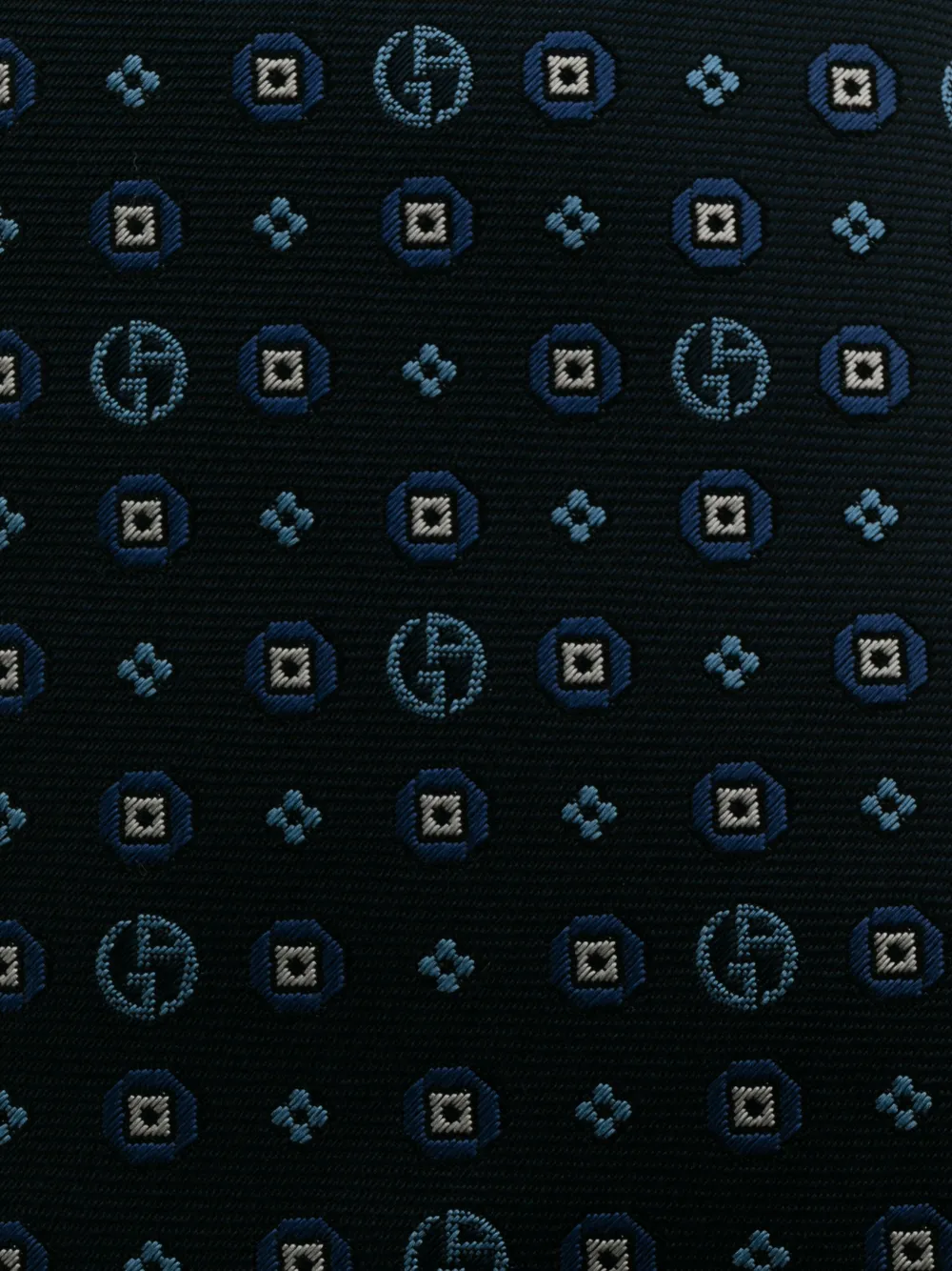 Azul marino, azul claro, seda, acabado satinado, diseño en jacquard, estampado de cuadrilóbulo, autocierre y diseño ajustable.