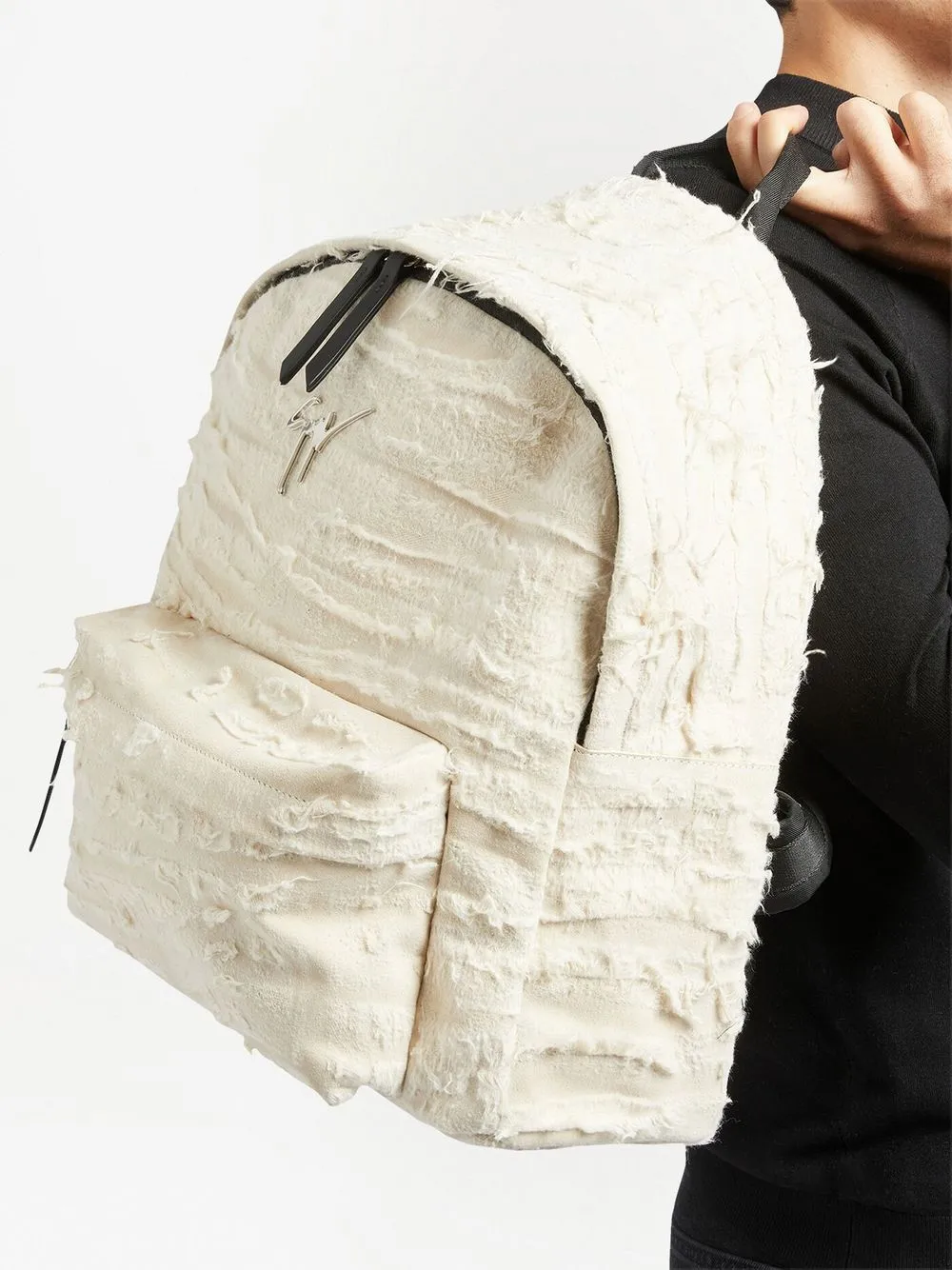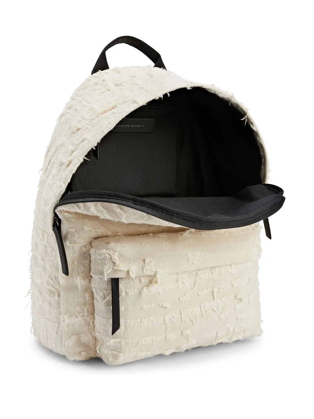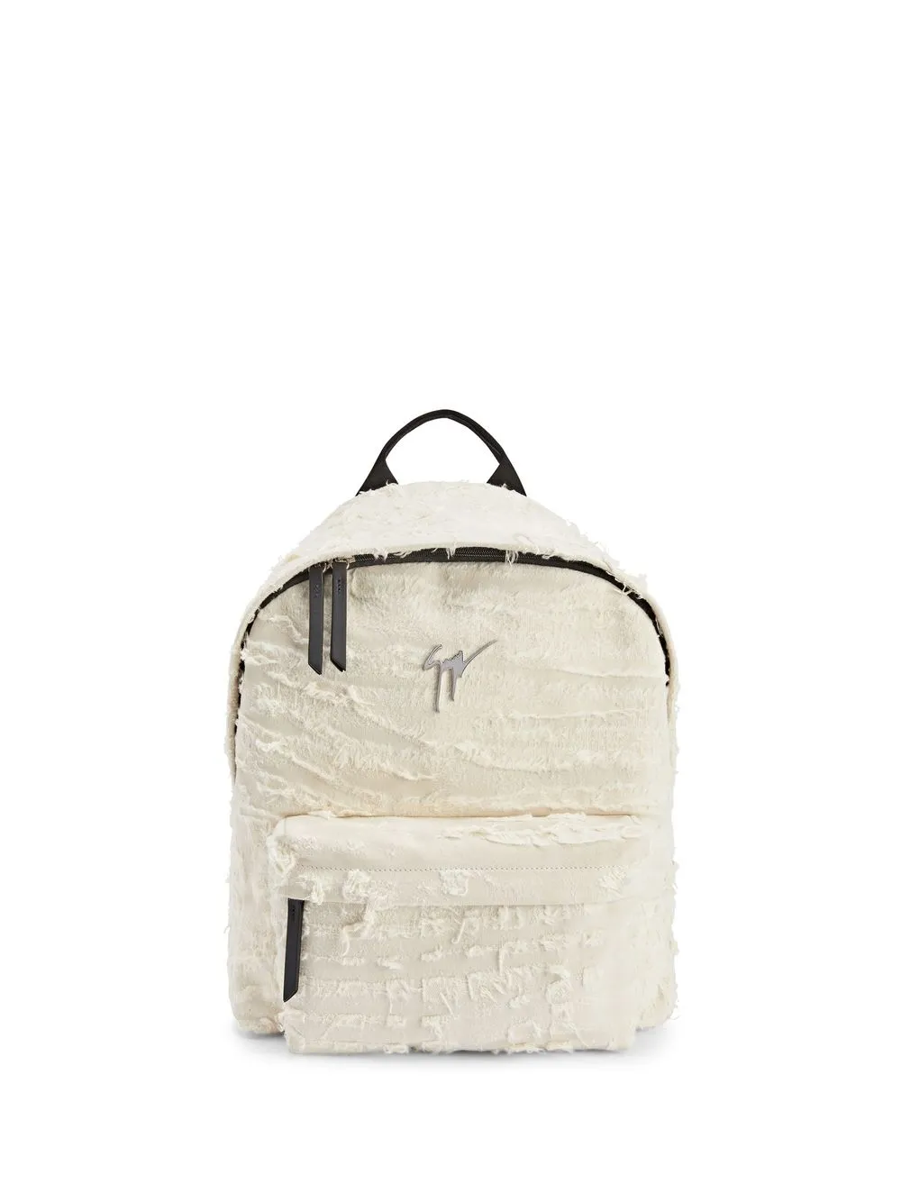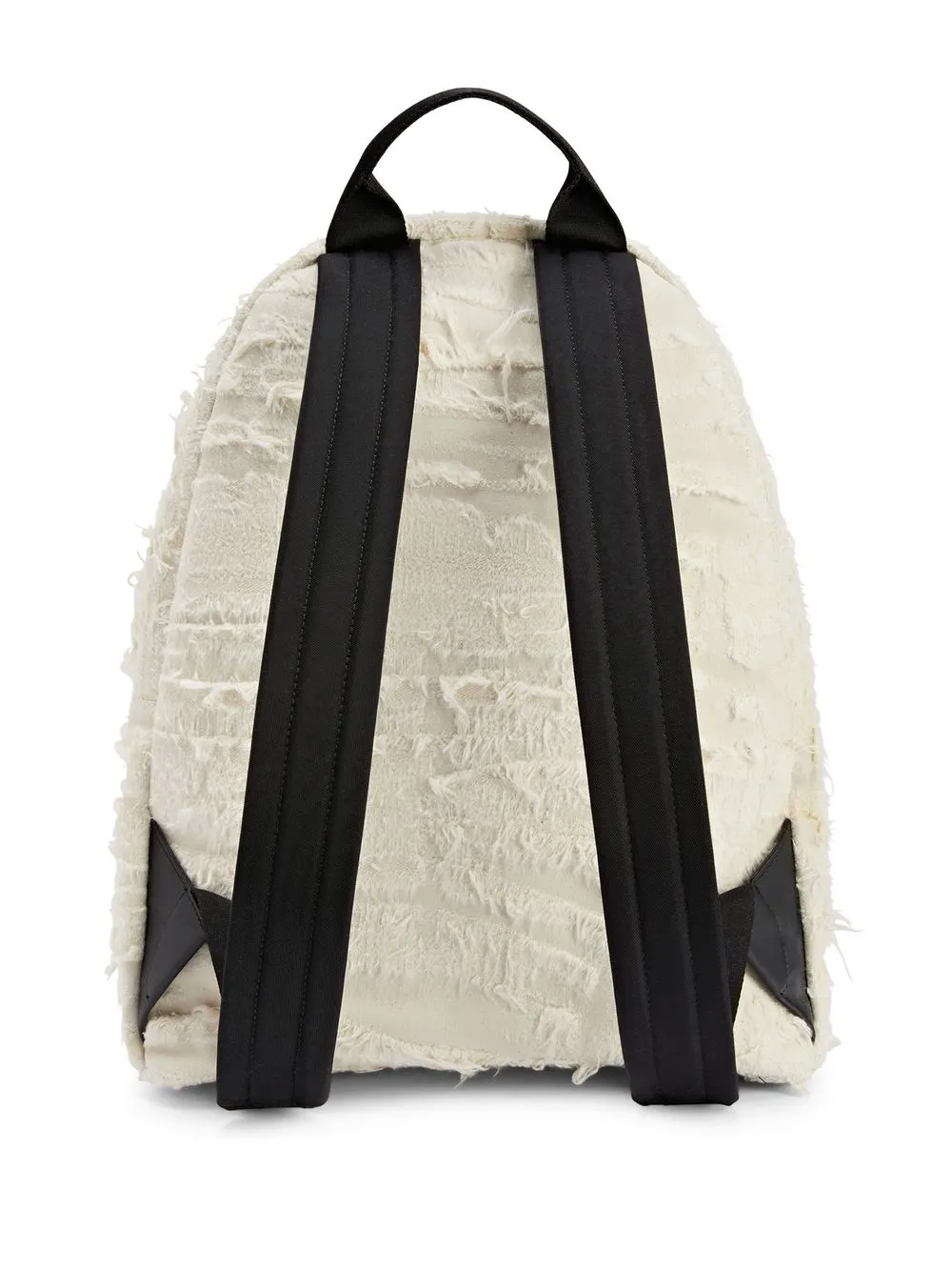 Blanco roto, cuero, efecto envejecido, placa del logo, cierre con cremallera en el tope, compartimento principal, bolsillo interno con cremallera, bolsillo con cremallera en la parte delantera, asa plana en la parte superior y correas de hombro ajustables.