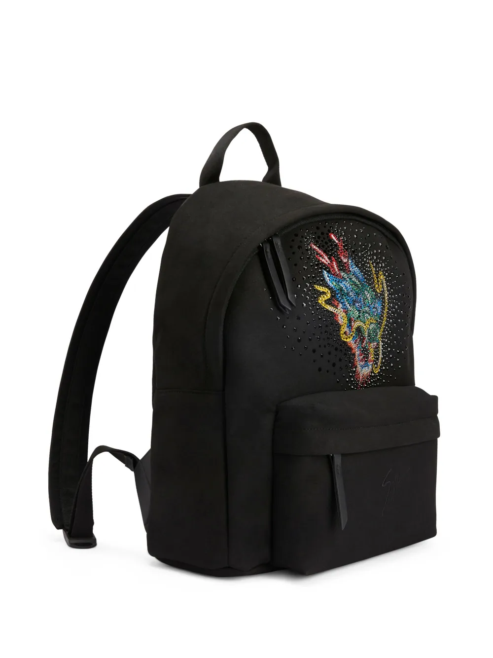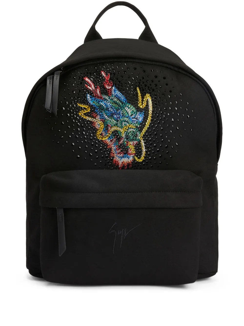 Negro y multicolor, detalles de strass, logo bordado en la parte delantera, parche del logo en el interior, cierre con cremallera en el contorno, dos correas ajustables para los hombros, asa en la parte superior, dos bolsillos laterales abiertos, bolsillos con cremallera en la parte delantera y compartimento principal.