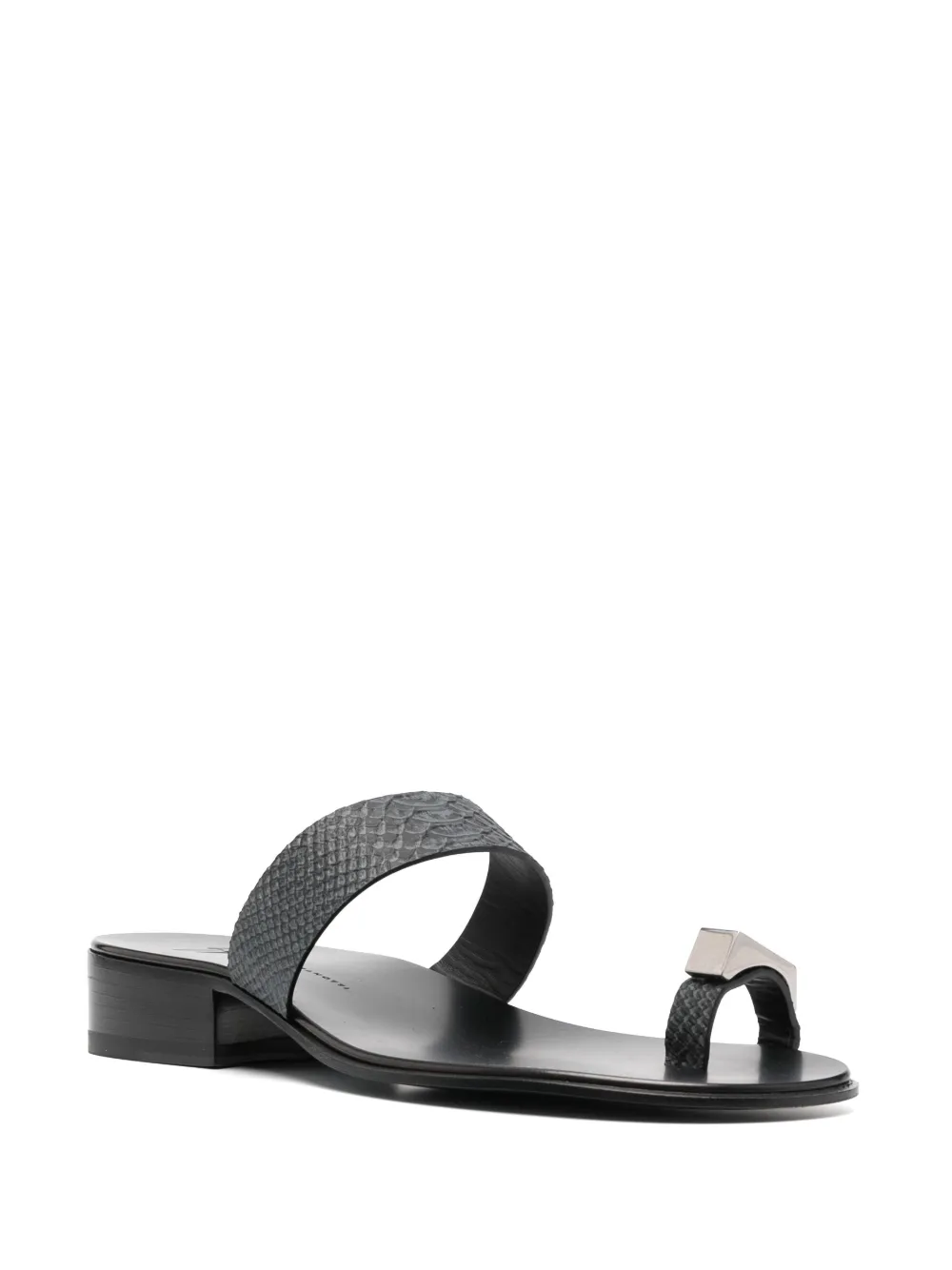 Negro, piel de becerro, acabado en tono plateado, efecto de piel de serpiente, puntera redonda, plantilla con logo y suela plana de goma.
