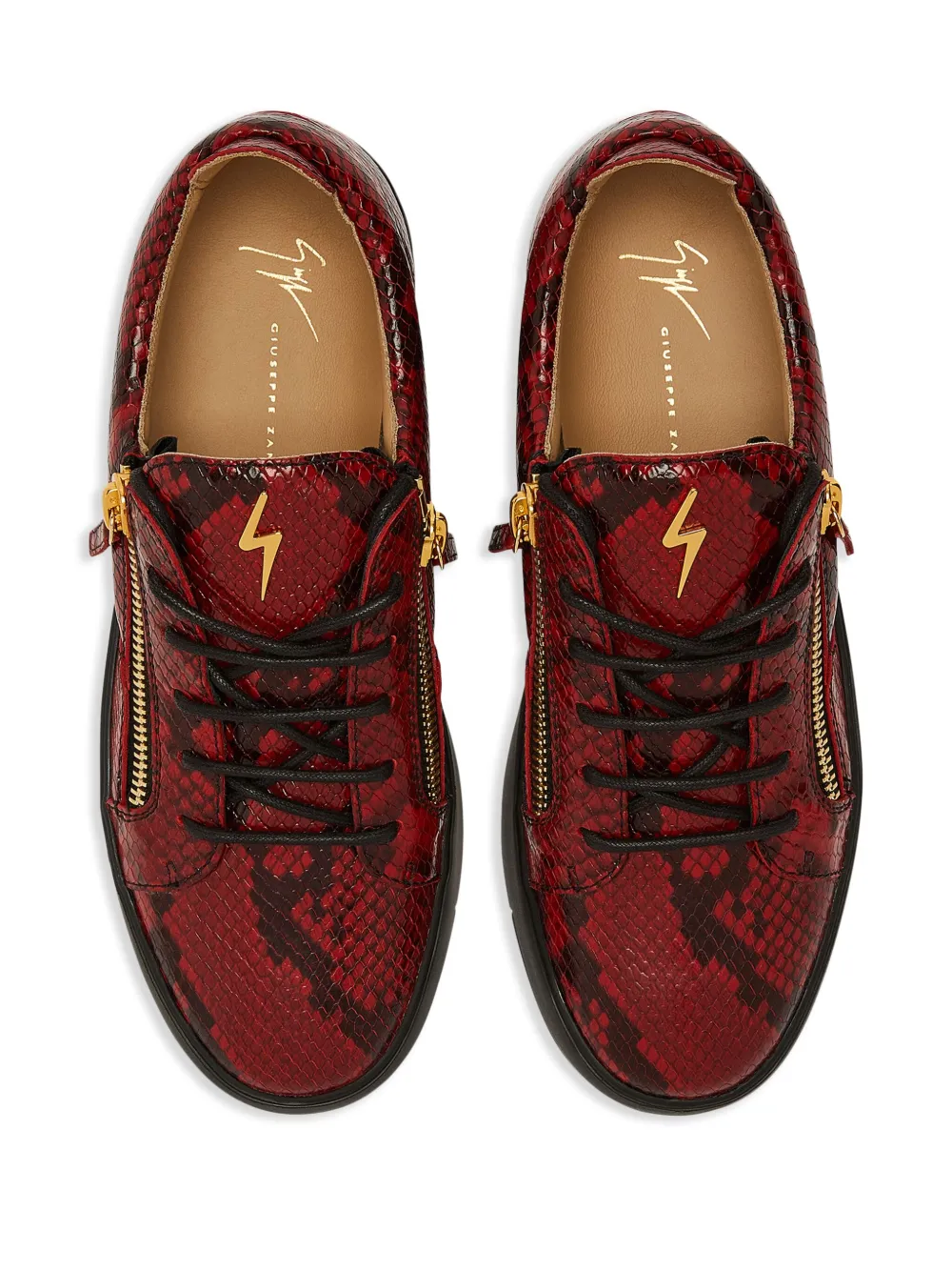 Rojo oscuro, negro, piel de becerro, efecto de piel de serpiente, puntera redonda, cierre lateral con cremallera, lengüeta en la parte posterior, cierre con cordones en la parte delantera, suela dentada de goma y plantilla con logo.