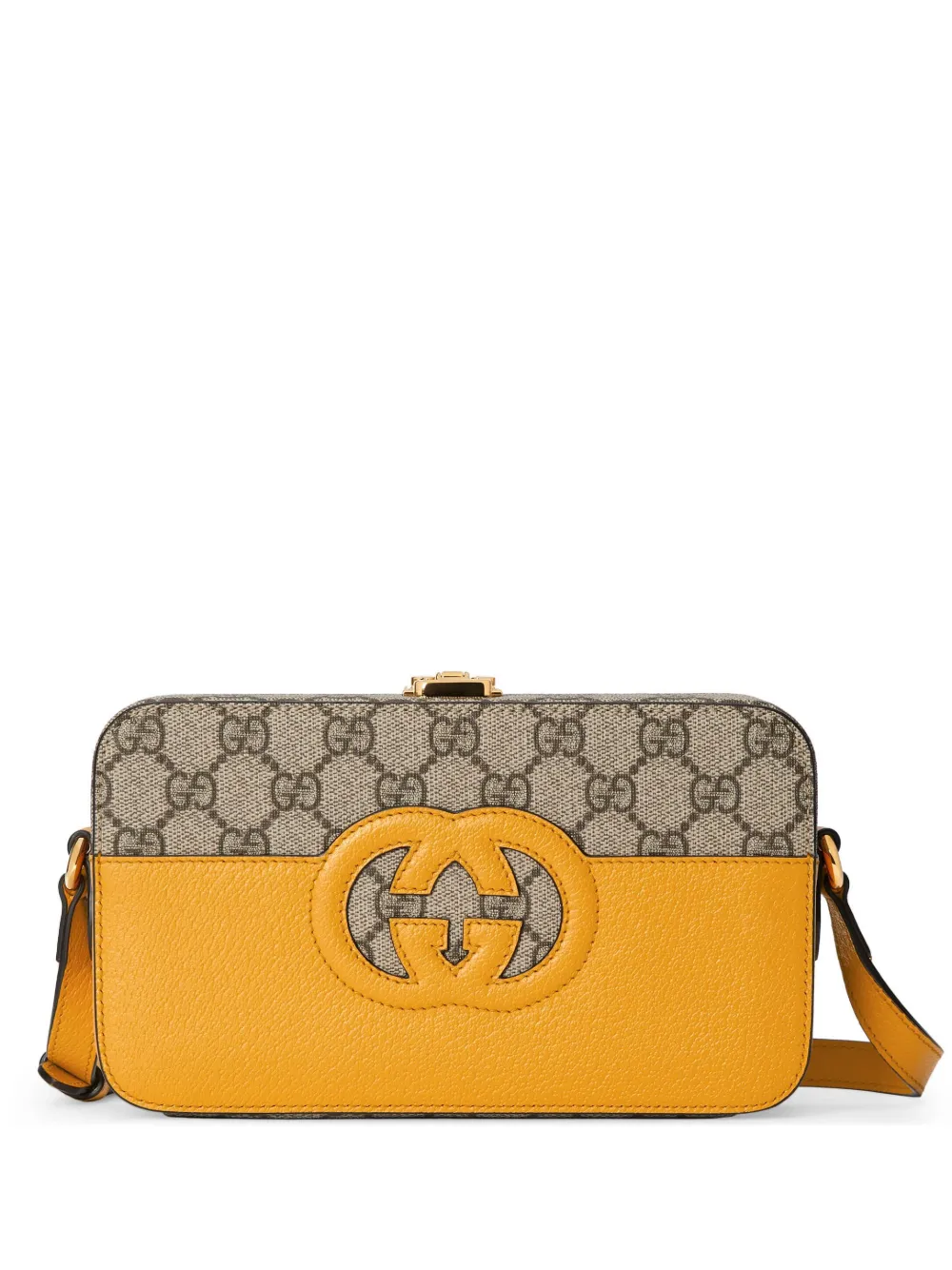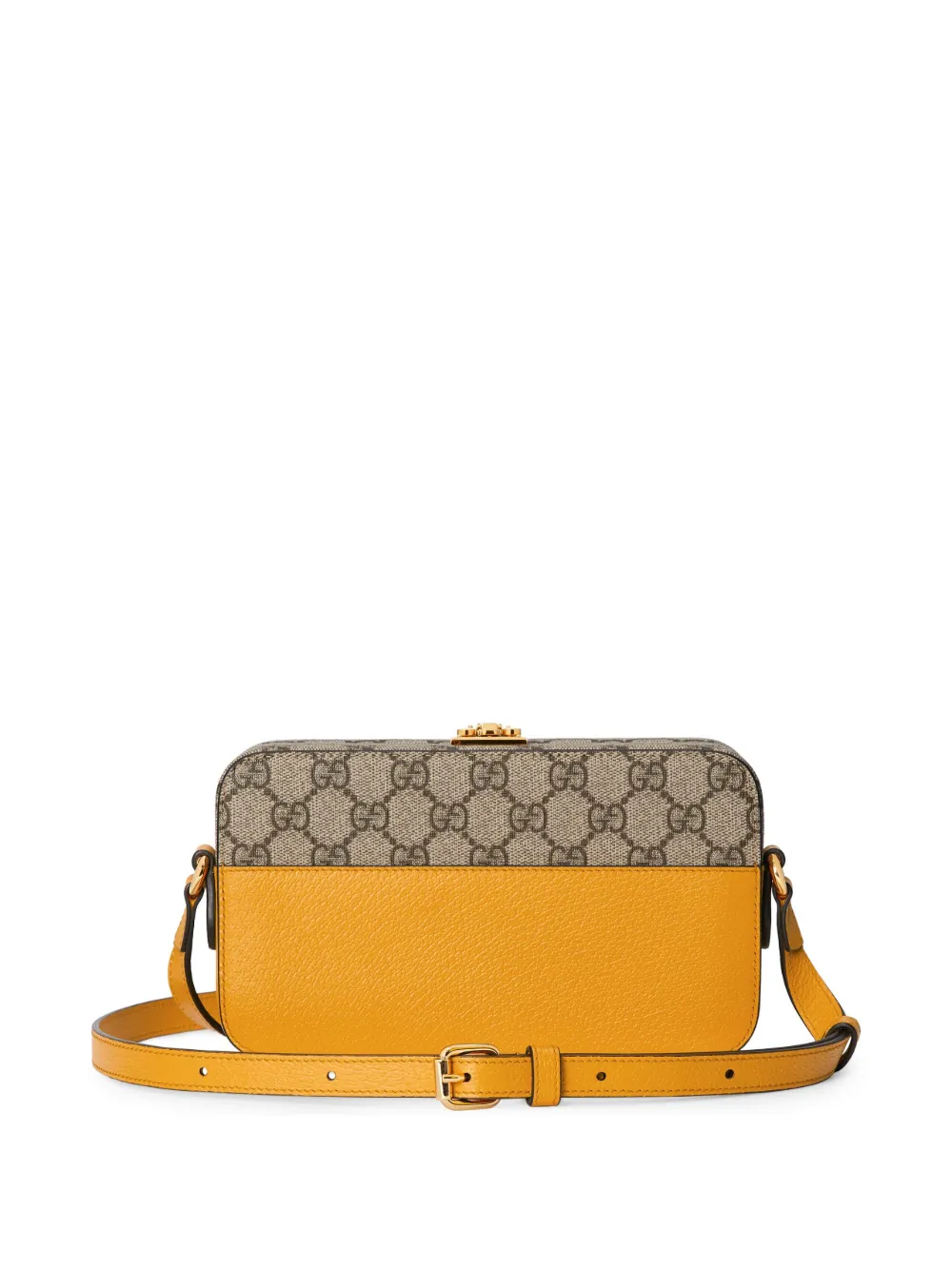 Albaricoque, multicolor, cuero, textura granulada, estampado GG Supreme, paneles con diseño colour block, detalle de aberturas, logo GG entrelazado característico, acabado en tono dorado, forma rectangular rígida, cierre de presión, correa de hombro ajustable y bolsillo interno con solapa.