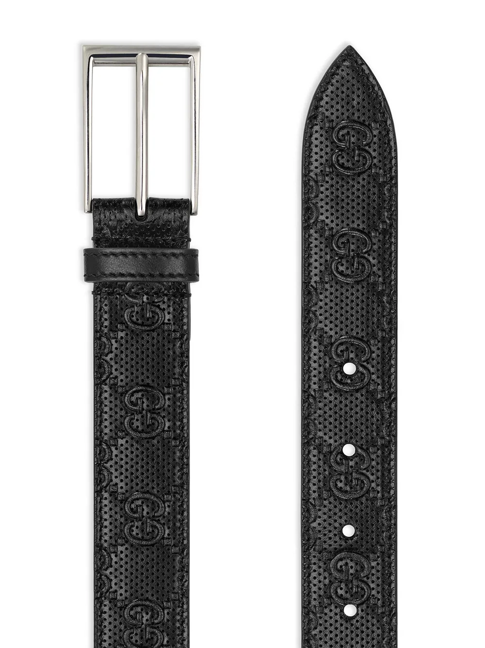Logo GG entrelazado característico, agujeros perforados, trabillas, cierre con hebilla en tono plateado y diseño ajustable. Material: cuero.