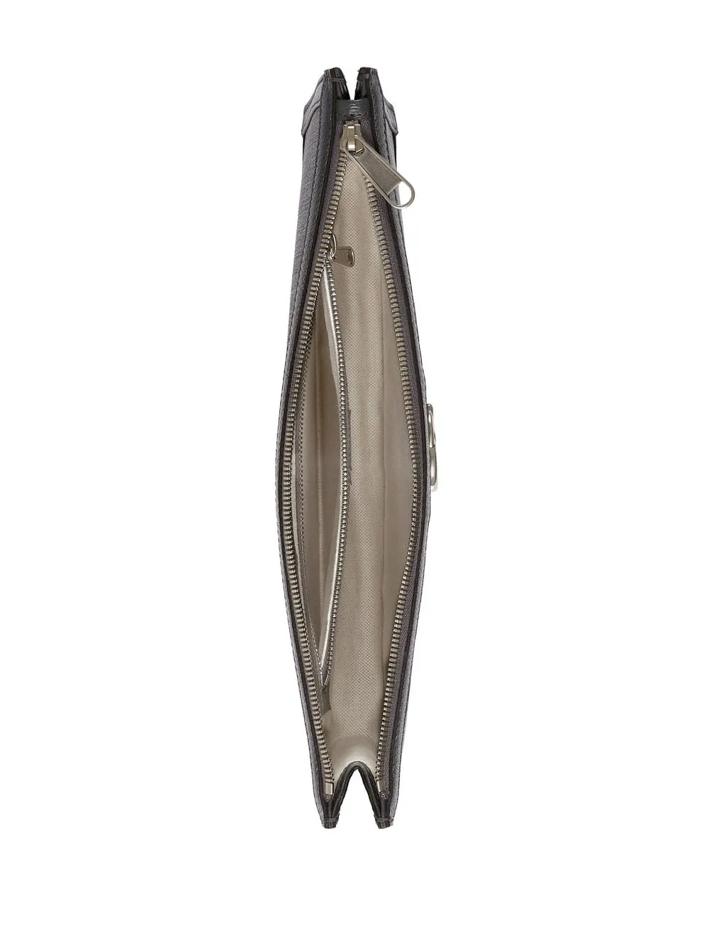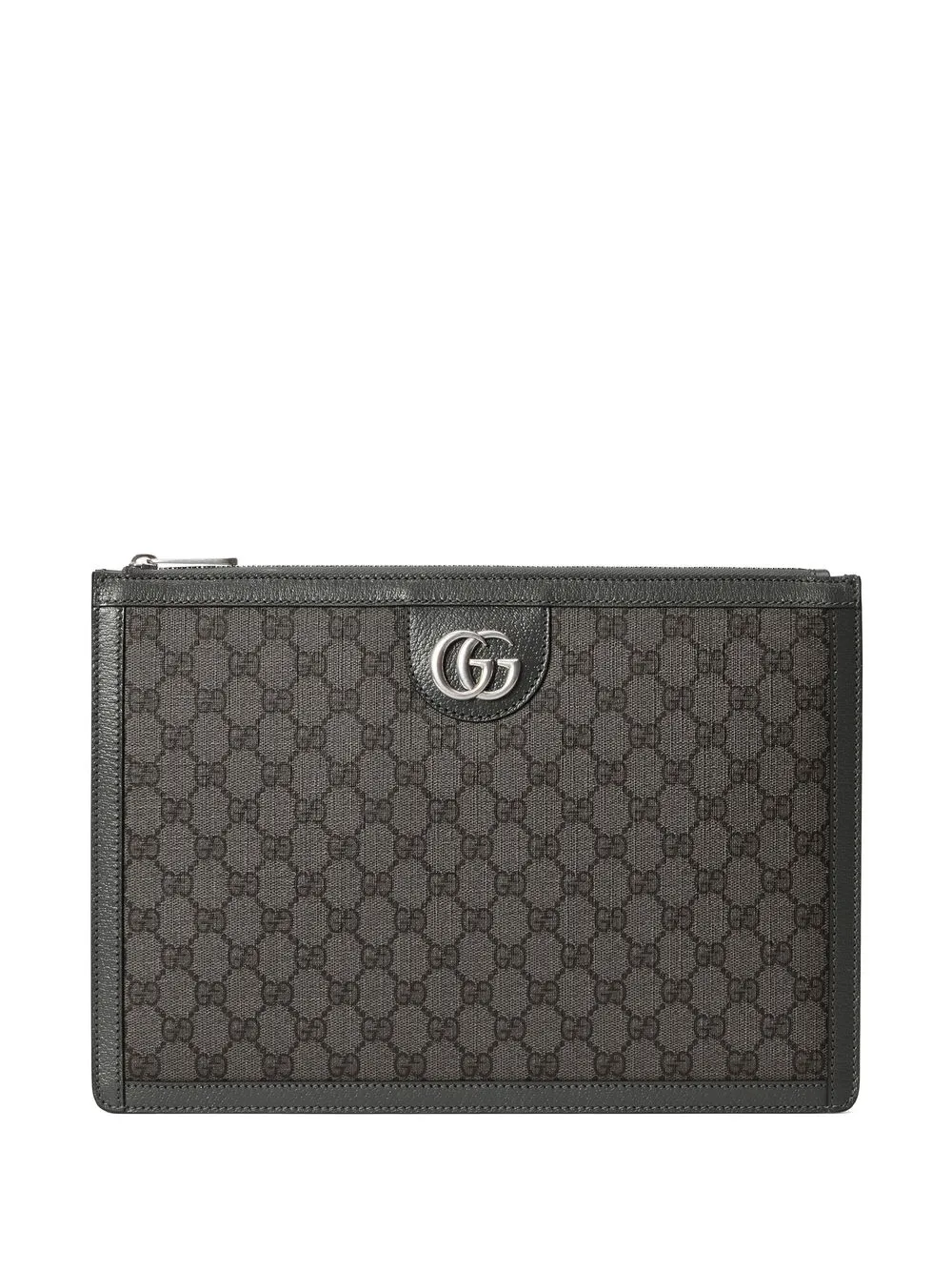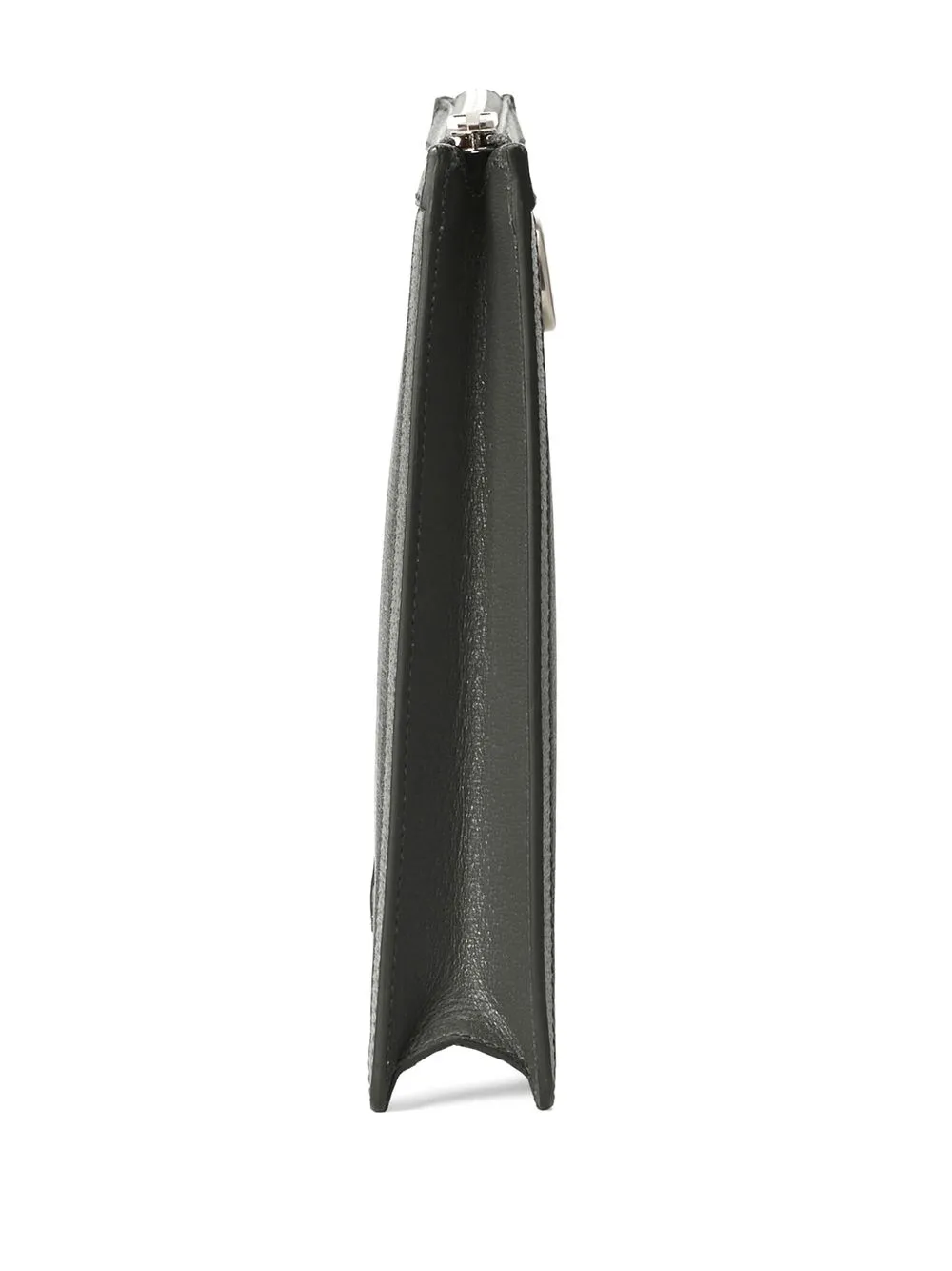 Gris, cuero, logo Double G característico, estampado clásico GG, acabado en tono plateado, cierre con cremallera en el tope y bolsillo interno con cremallera.