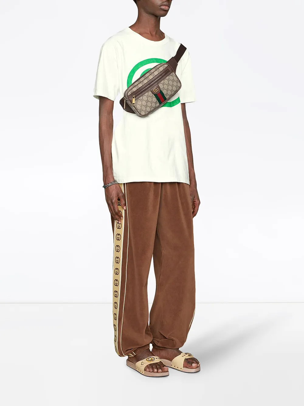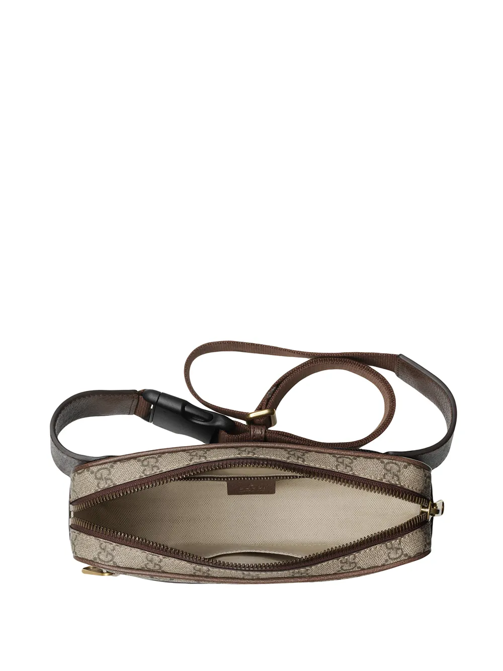 Riñonera Ophidia GG en lona y mezcla de lino y algodón de color marrón de Gucci con motivo Gucci Supreme, detalle Web característico de la marca en verde y rojo y bolsillo con cremallera en la parte delantera.