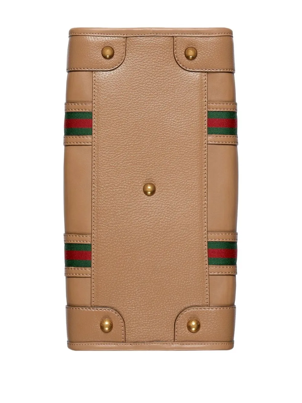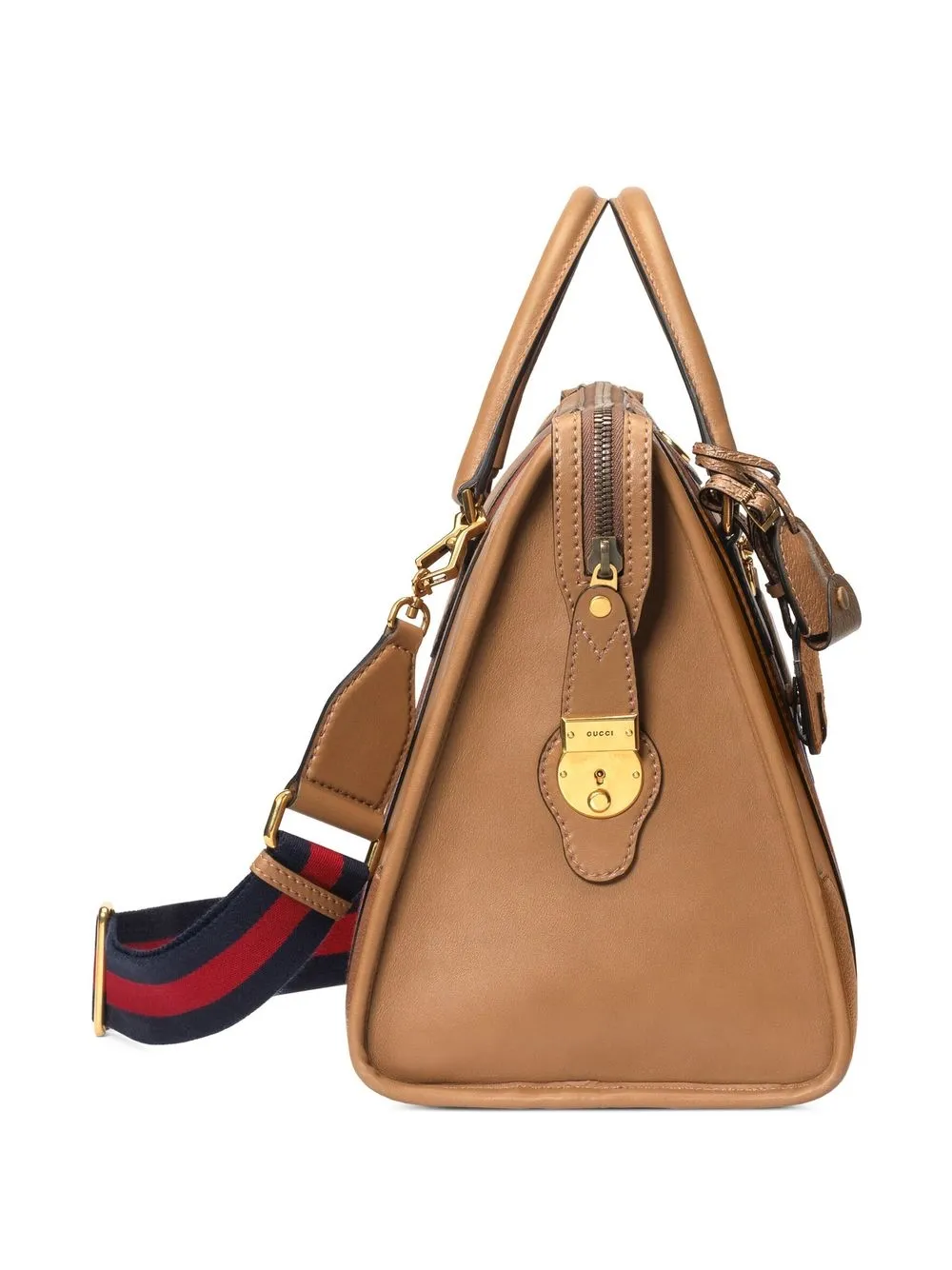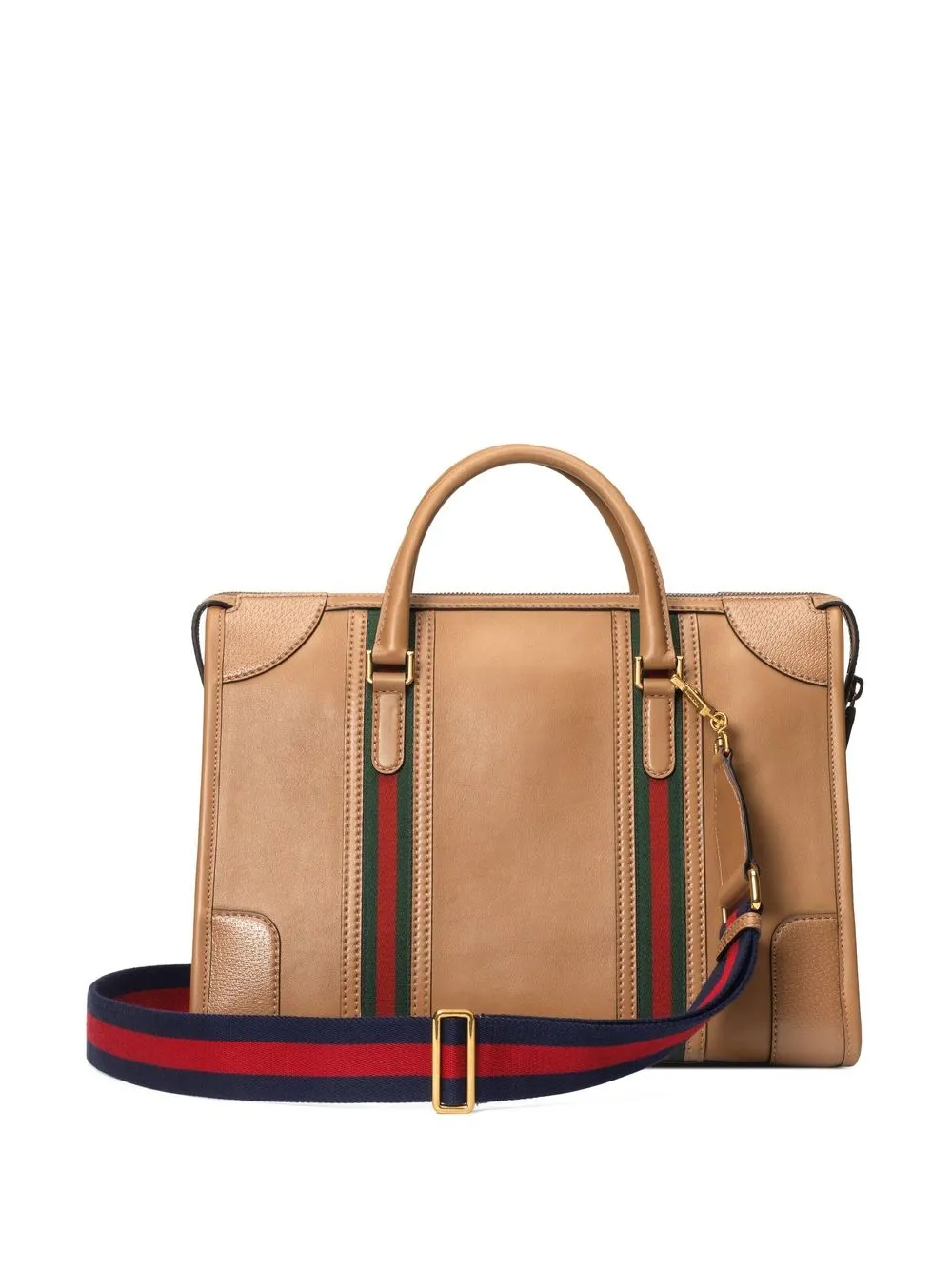 Marrón, cuero, logo Double G característico, ribete con tribanda Web, etiqueta de cuero, dos asas en la parte superior, correa ajustable y removible para el hombro, cierre con cremallera en el tope y base de apoyo de metal.