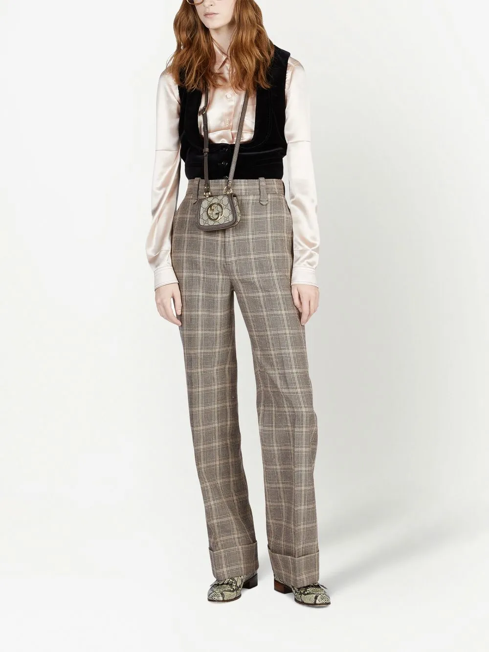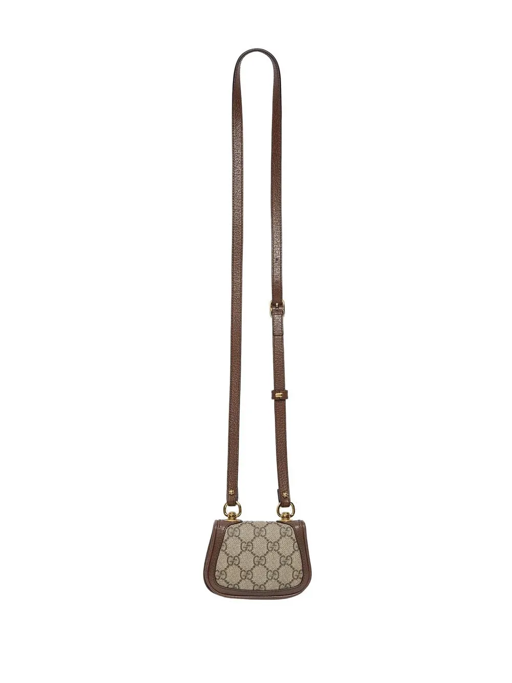 Marrón, beige, lona y cuero, estampado GG Supreme, acabado en tono dorado, logo GG entrelazado característico, parte superior plegable con botón de presión, forro de algodón y correa de hombro ajustable.