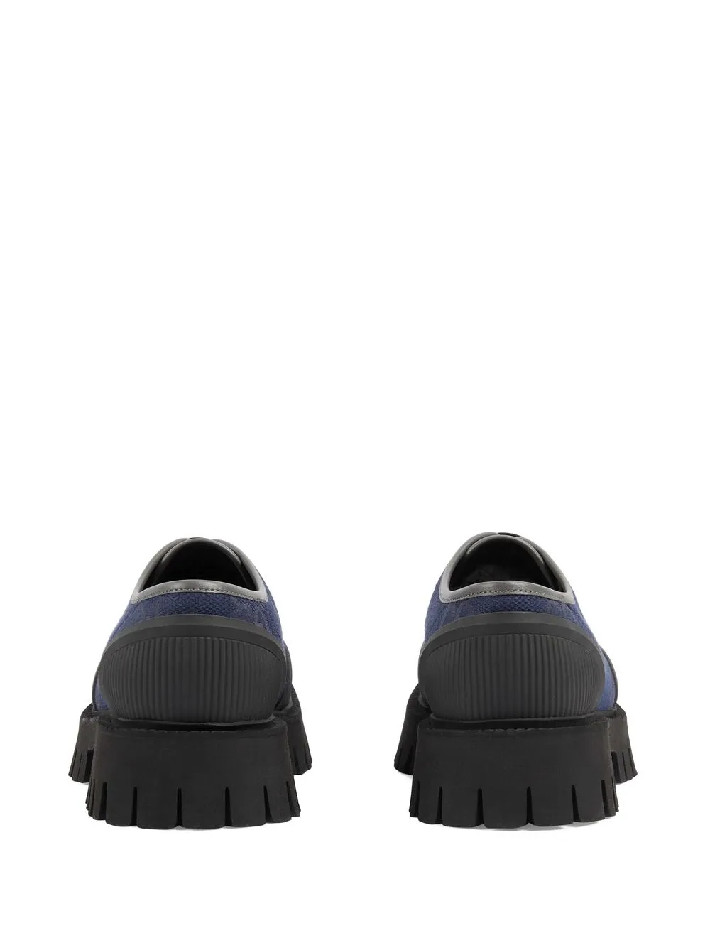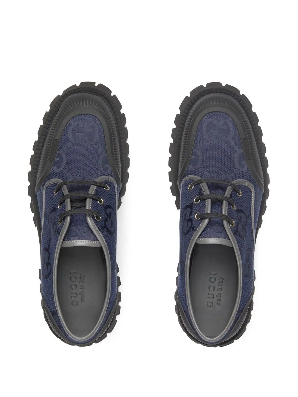 Azul marino, negro, lona y cuero, lona Maxi GG, puntera de goma, puntera de almendra, cierre con cordones en la parte delantera, plantilla con logo, tacón bajo y suela gruesa de goma dentada.