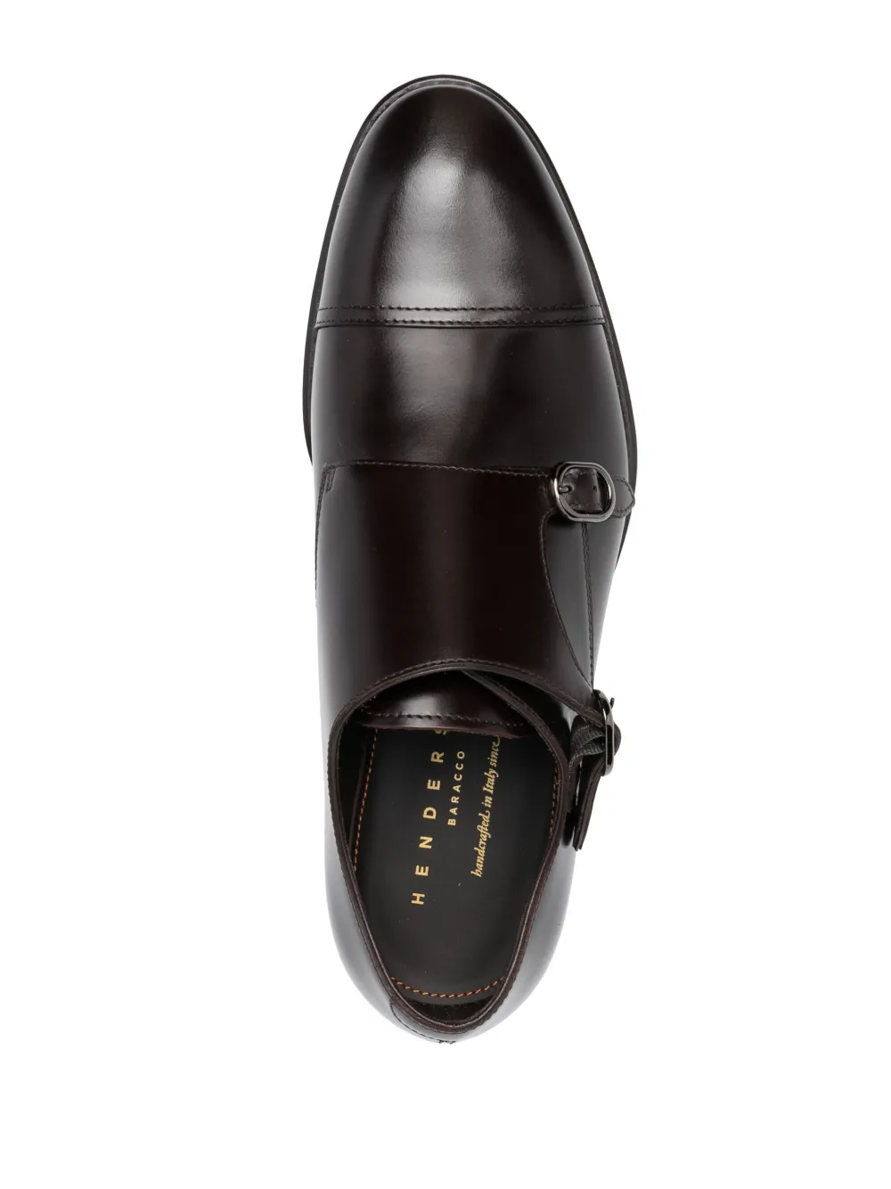 Marrón, piel de becerro, grano suave, acabado en tono plateado, plantilla con logo, puntera de almendra, cierre lateral con hebilla y suela plana de cuero.