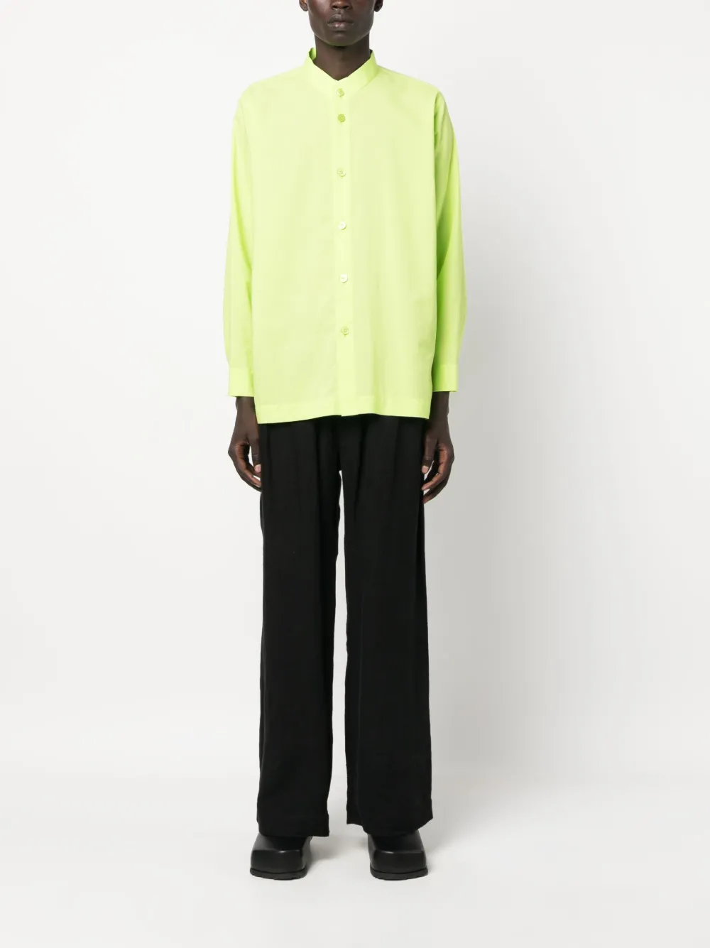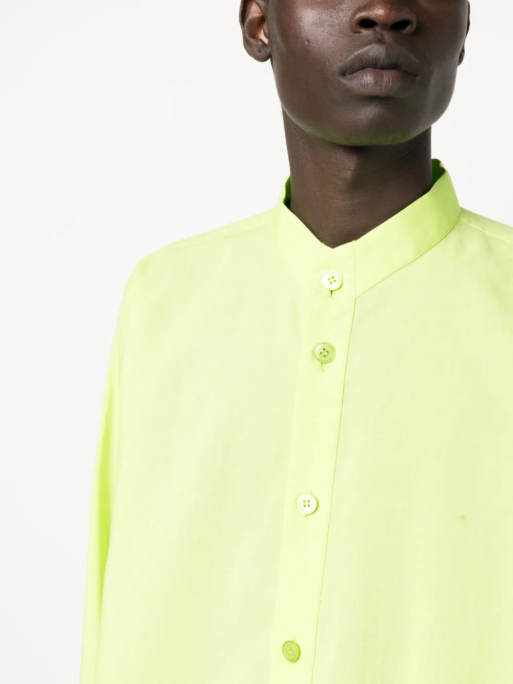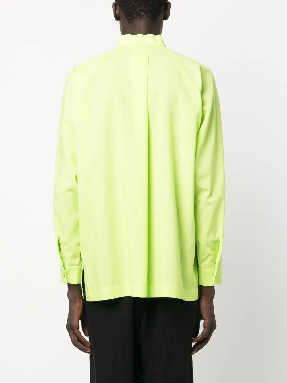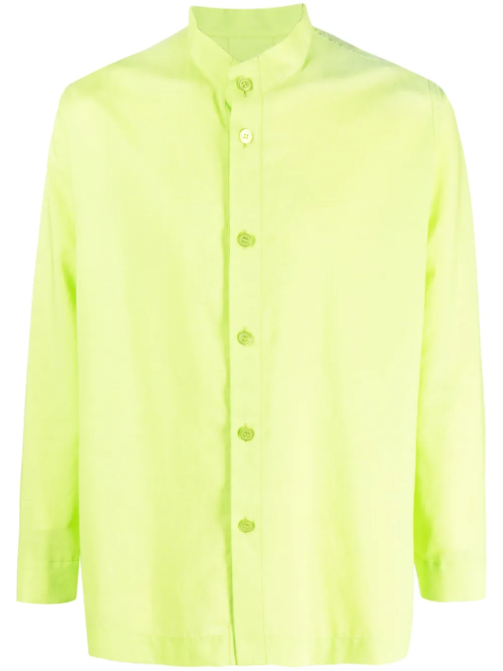 Verde claro, cuello mao, cierre con botones en la parte delantera, manga larga, puños con botón y dobladillo recto.