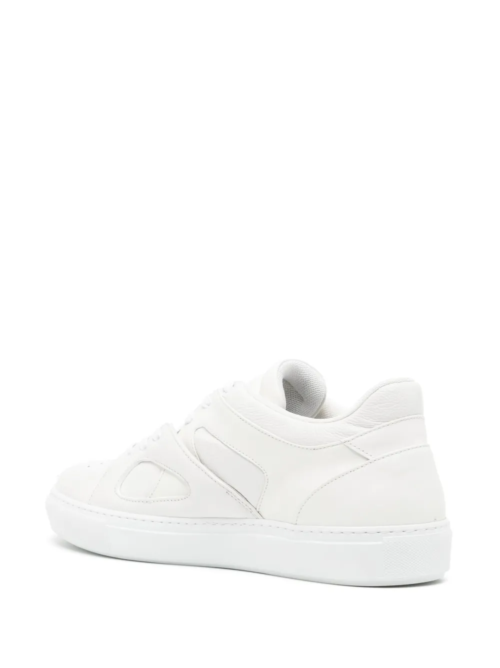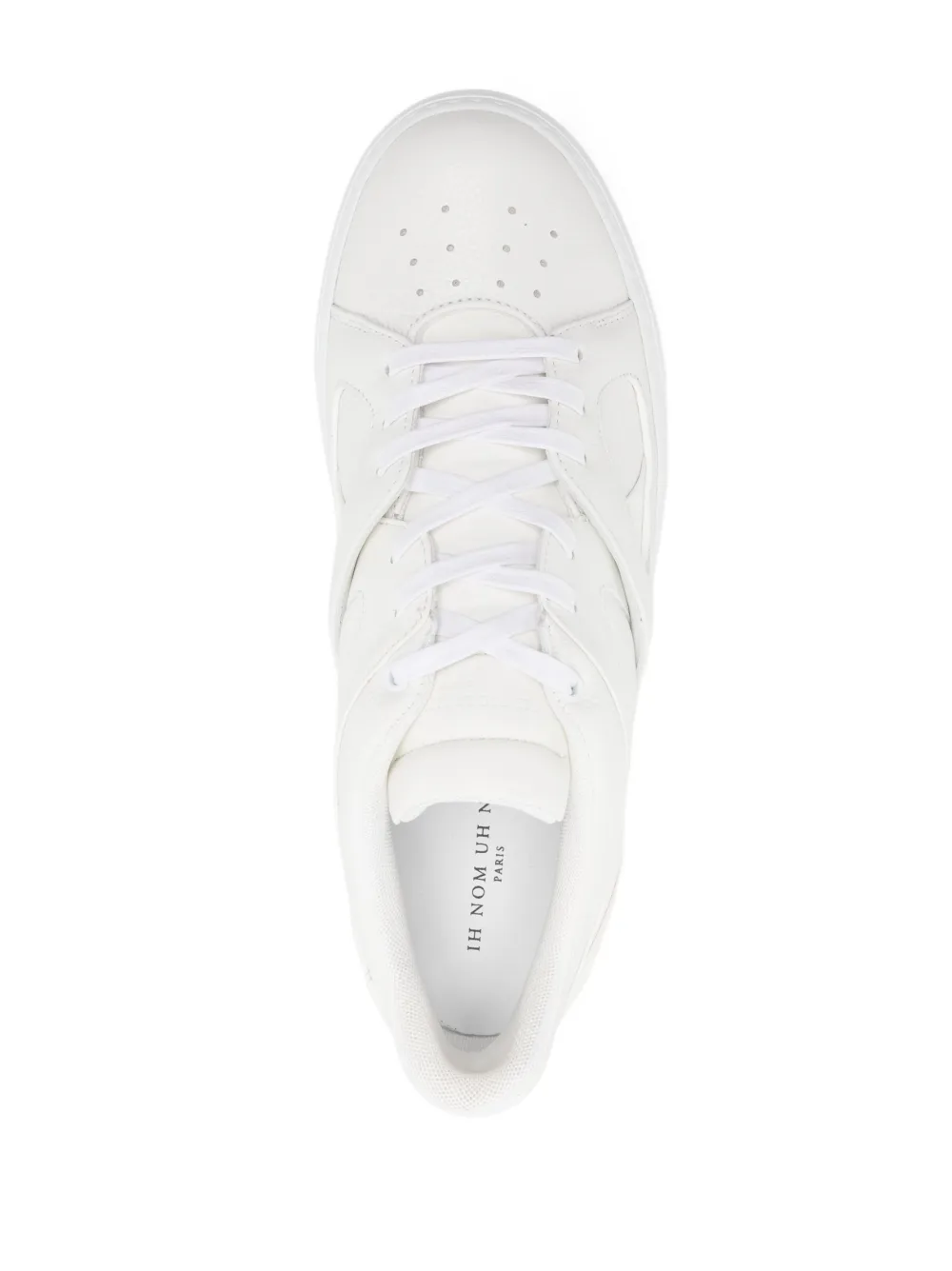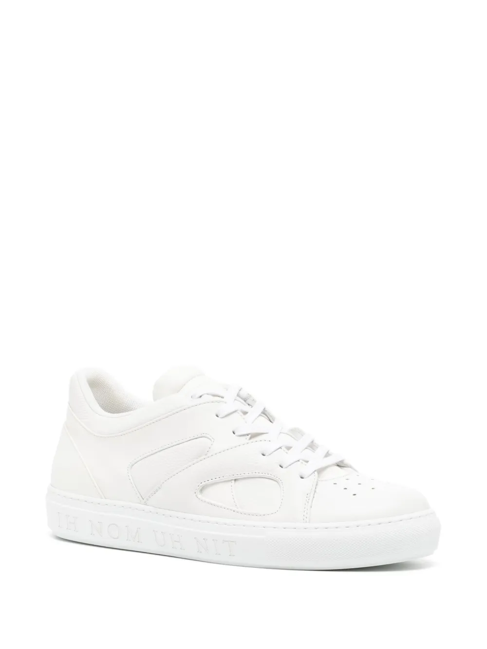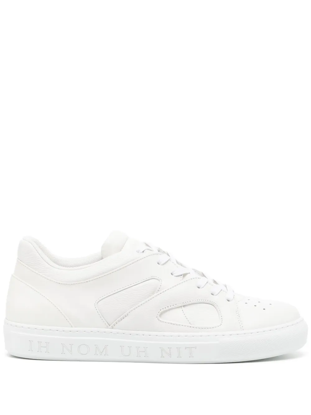 Blanco roto, cuero, efecto texturizado, diseño de paneles, logo grabado en el lateral, logo en relieve en la lengüeta, detalle de perforaciones, puntera redonda, cierre con cordones en la parte delantera, plantilla con logo y suela plana de goma.