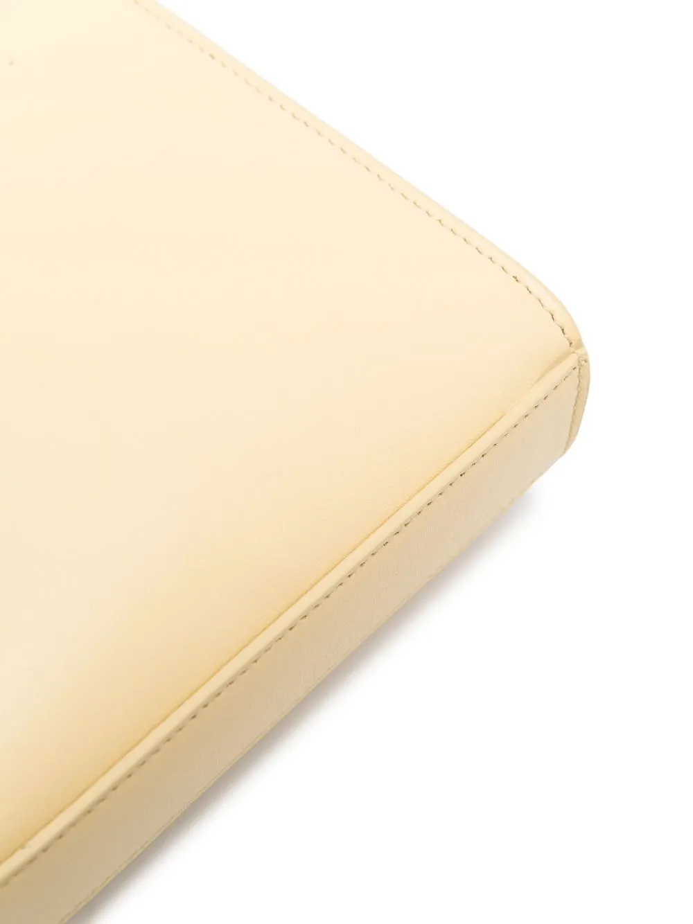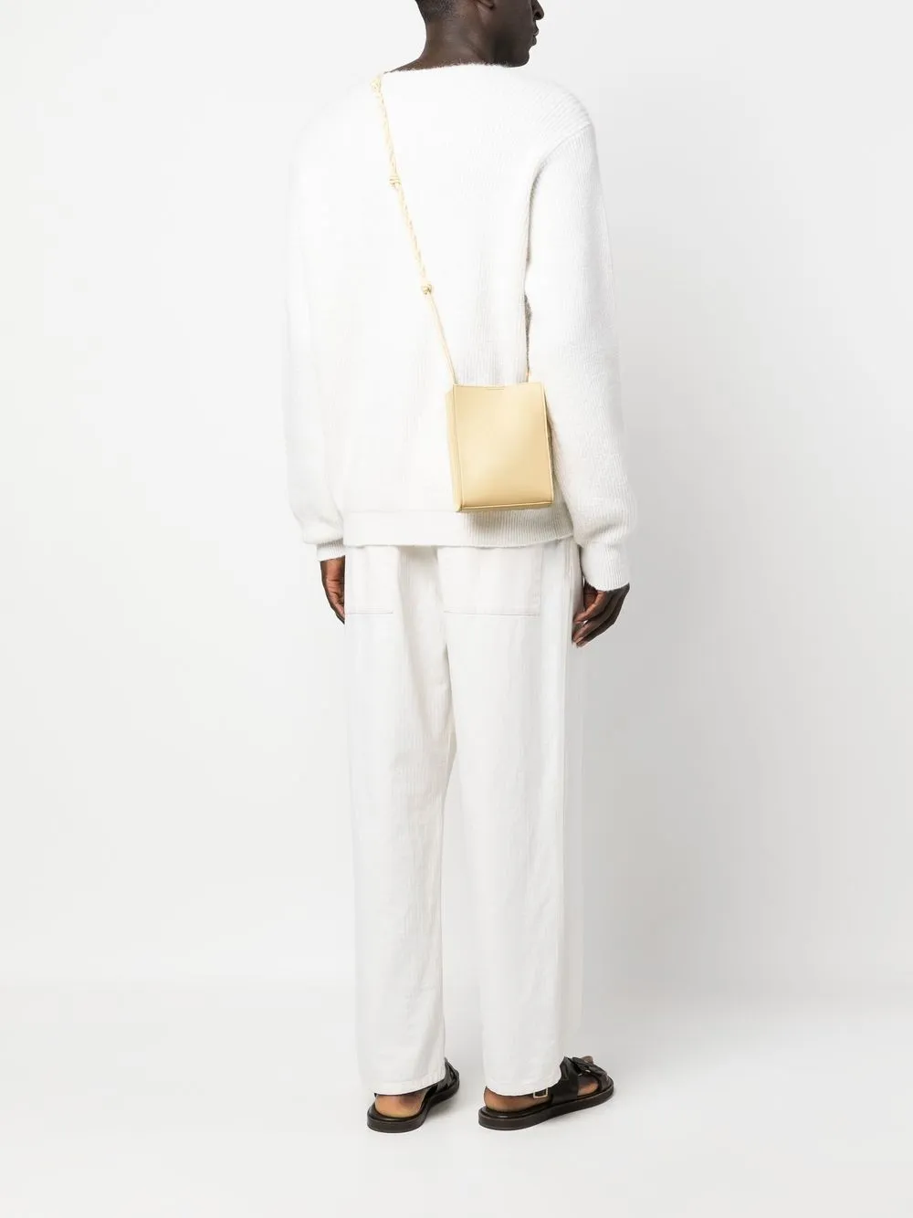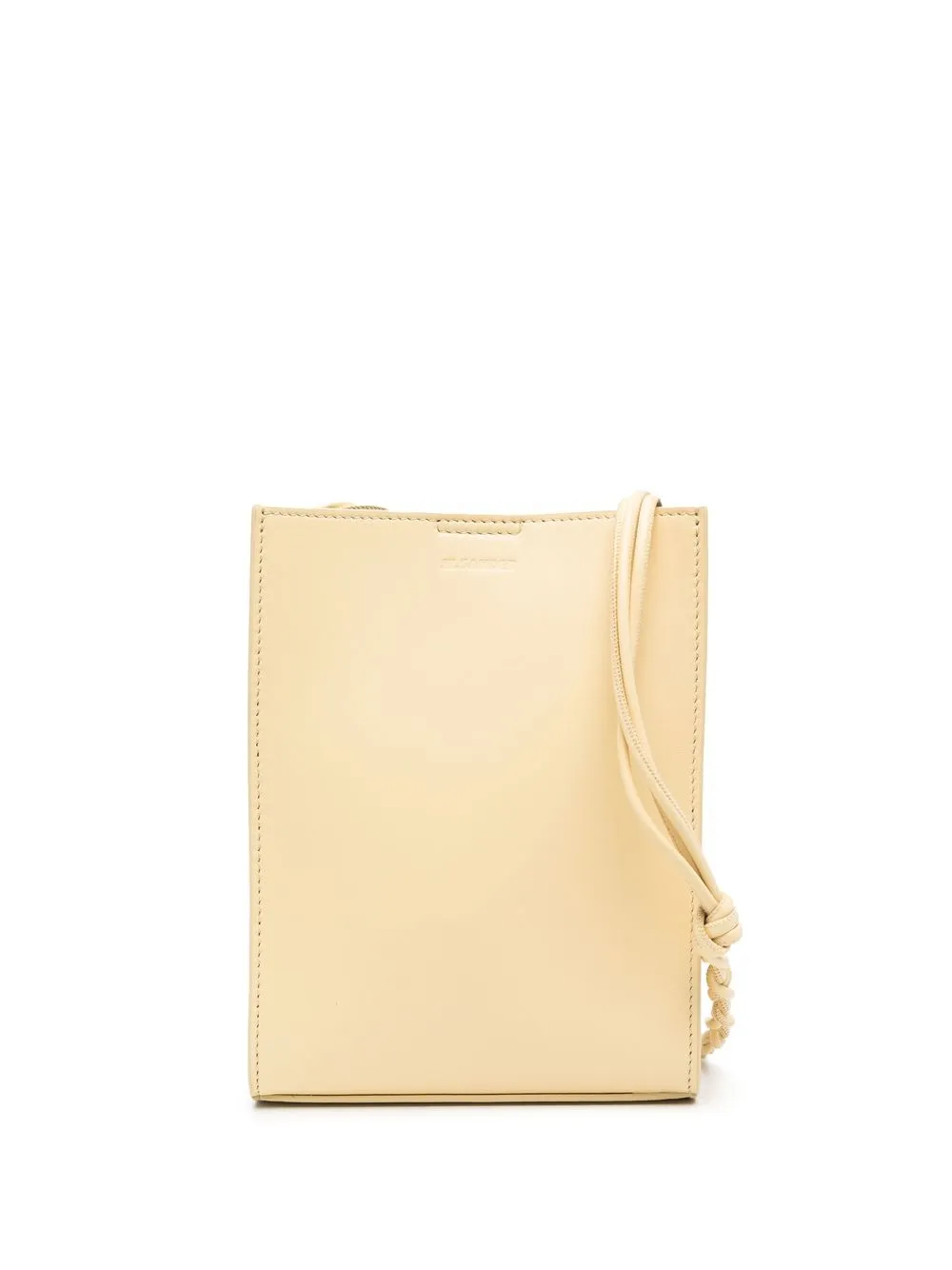 Piel de becerro, detalle de nudo, logo grabado en la parte delantera, dos correas para el hombro trenzadas, cierre magnético oculto y compartimento principal.