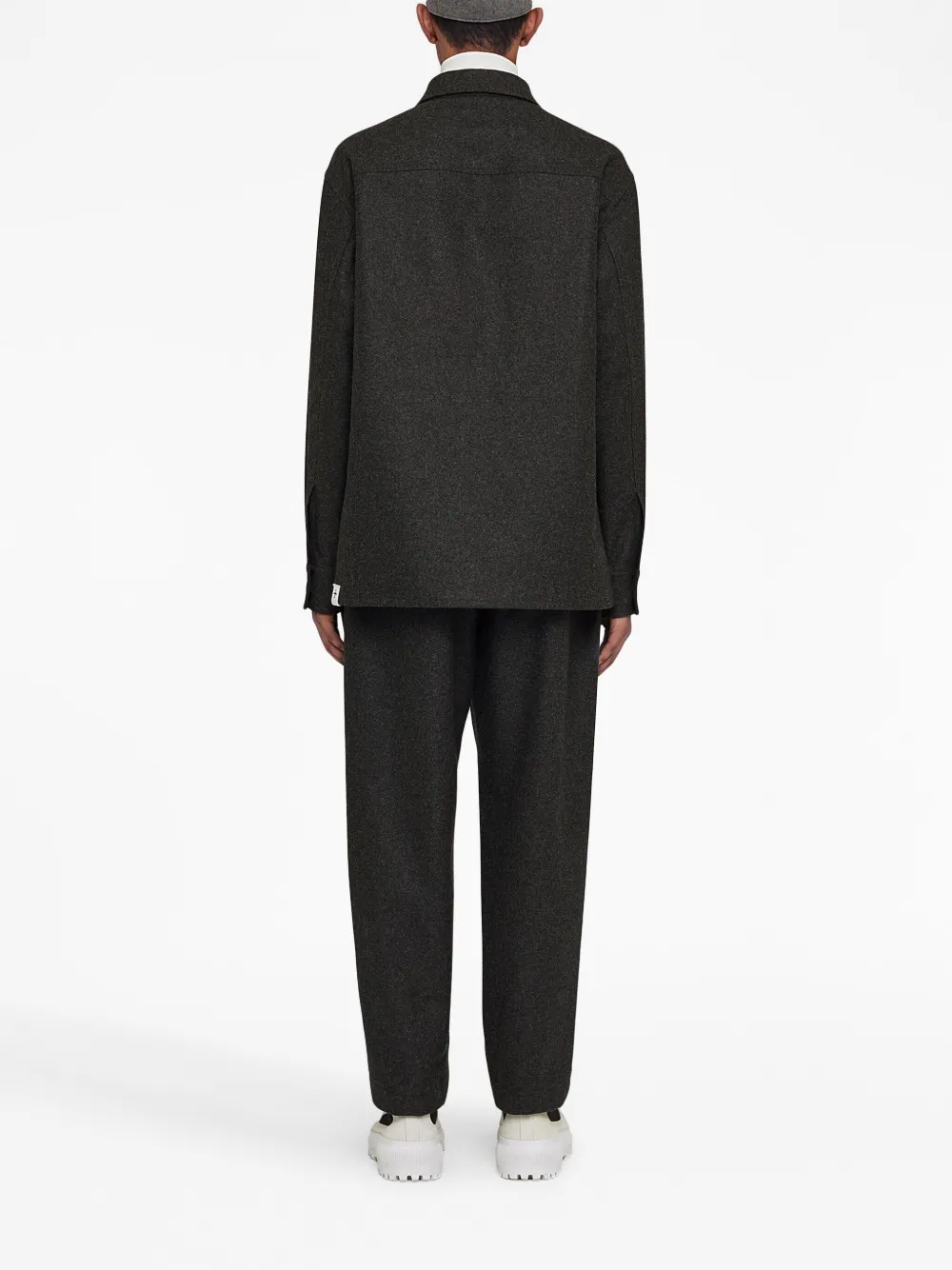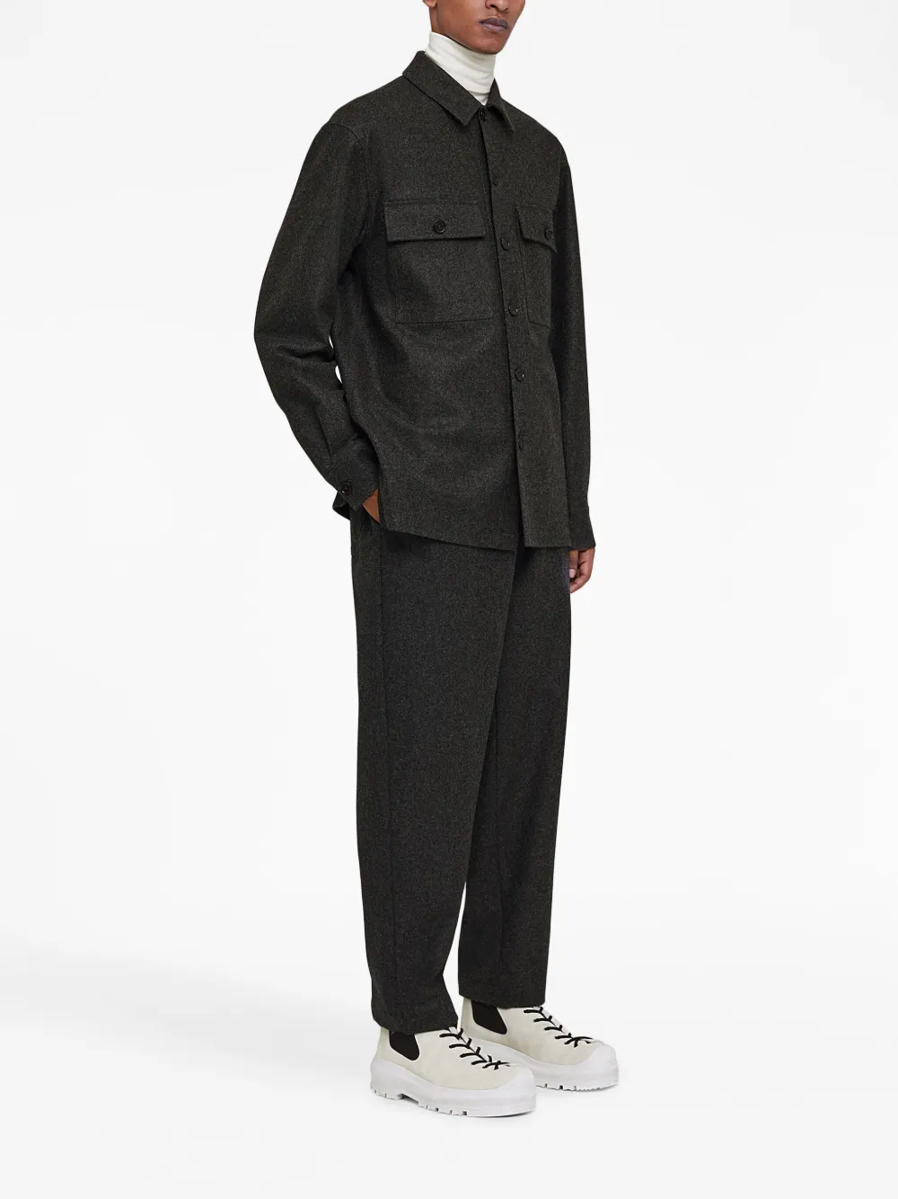 Gris oscuro, lana virgen, cuello clásico, cierre con botones en la parte delantera, dos bolsillos con botón en el pecho, manga larga, puños con botón y dobladillo recto.