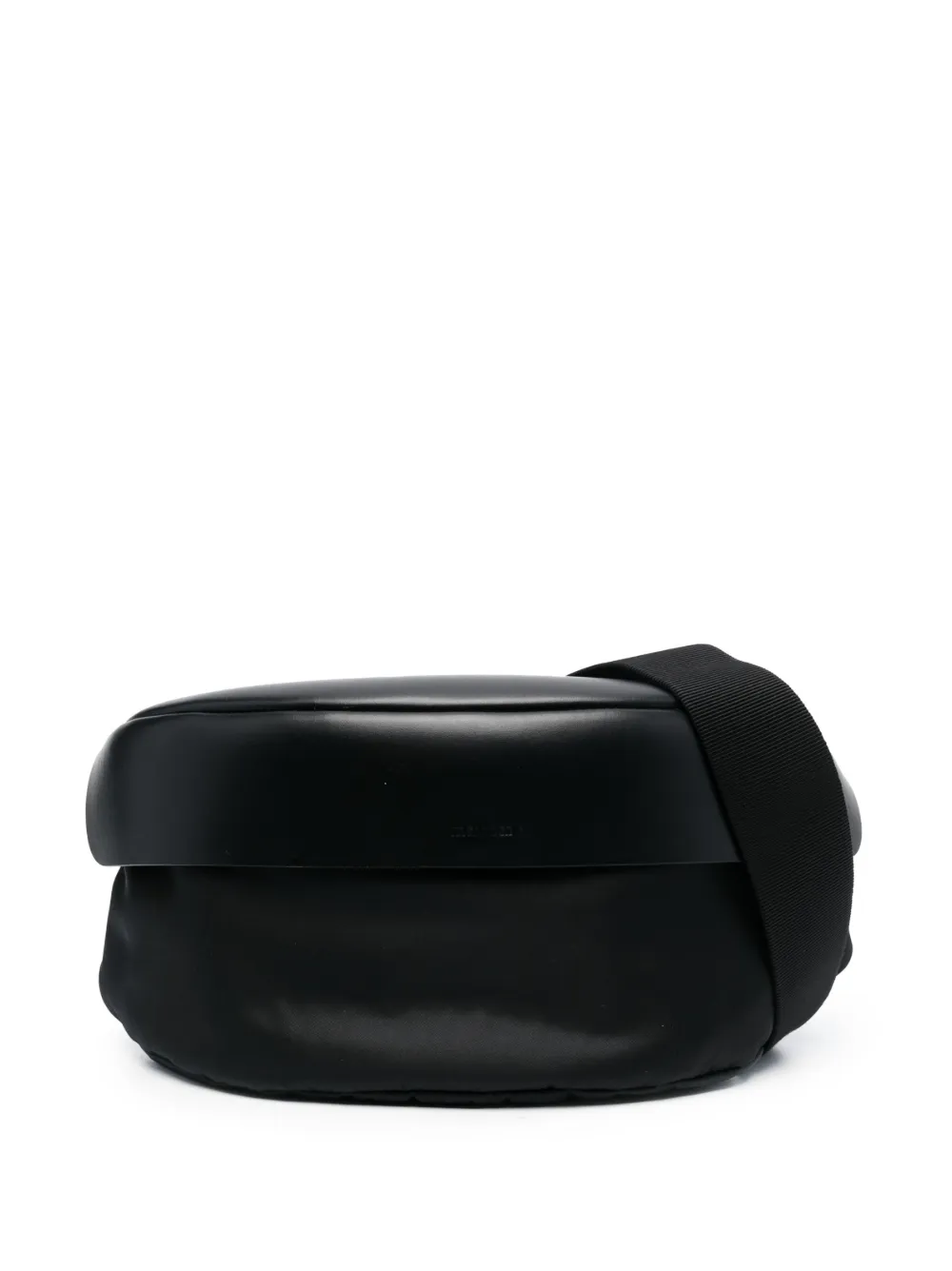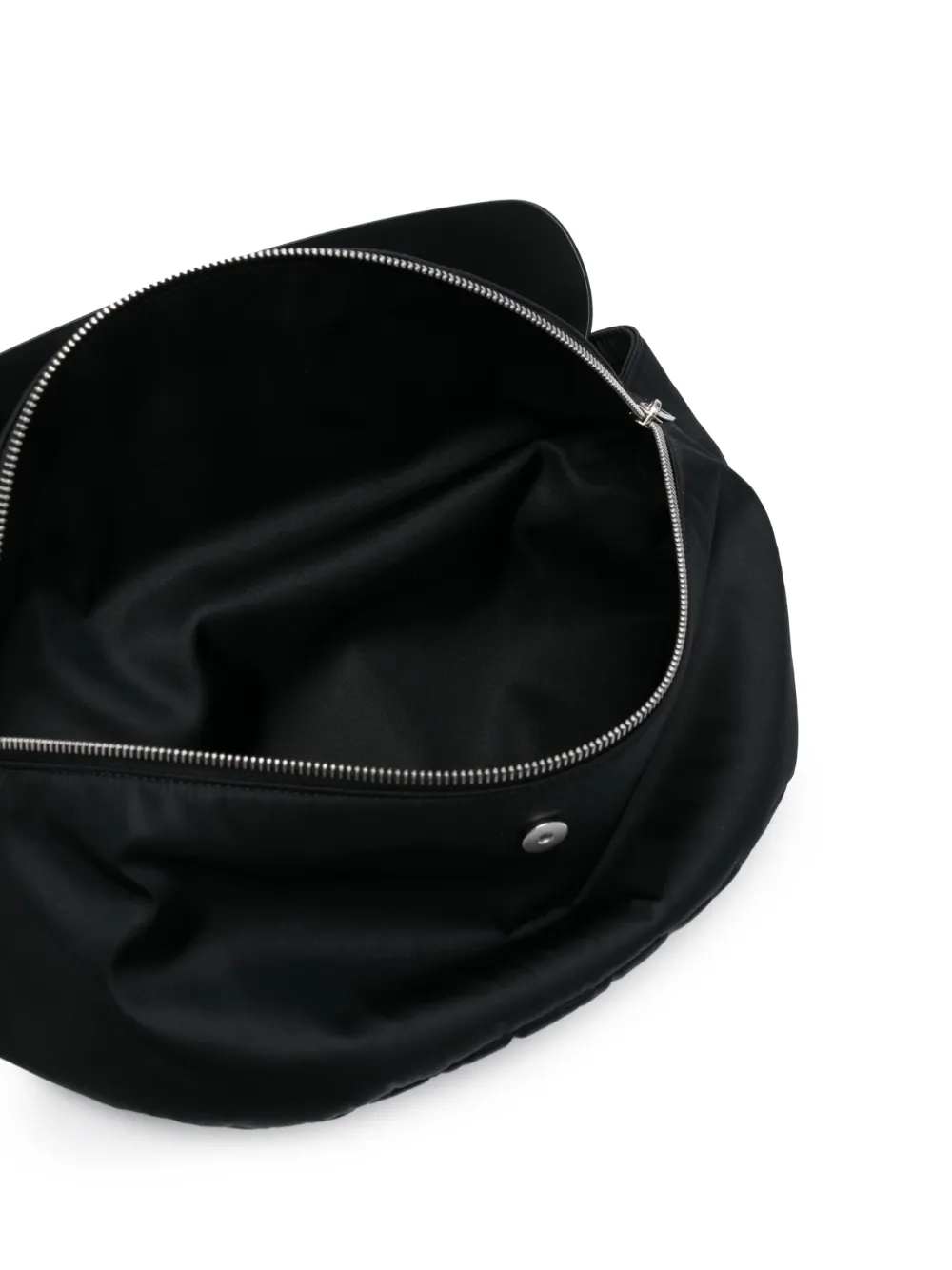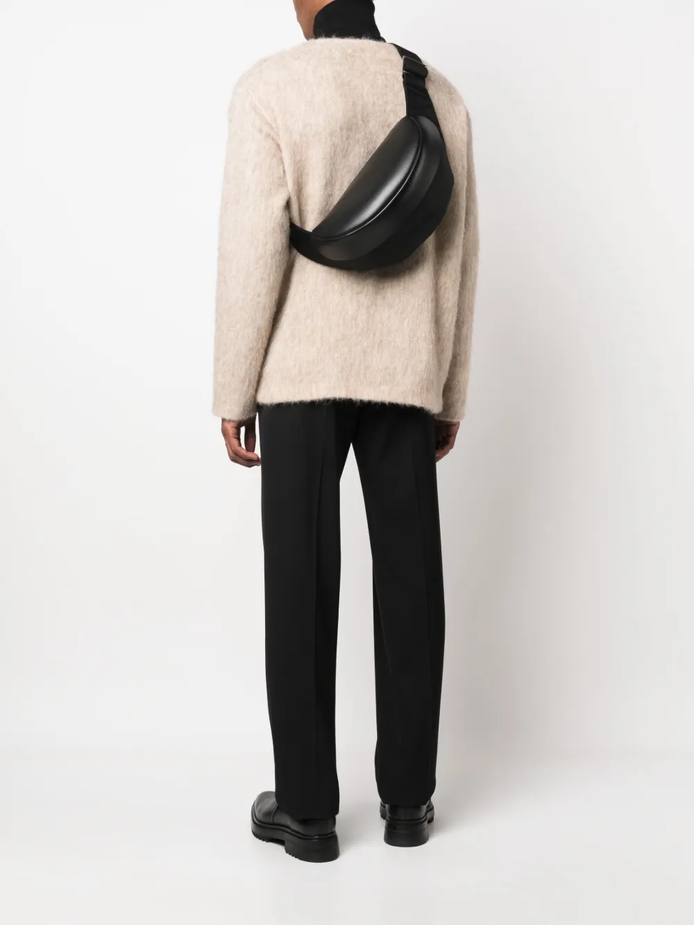Negro, piel de becerro, parte superior plegable con botón de presión, cierre con cremallera oculta en el tope, correa de hombro ajustable y compartimento principal.