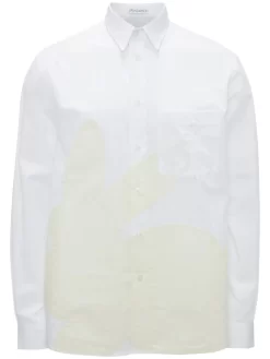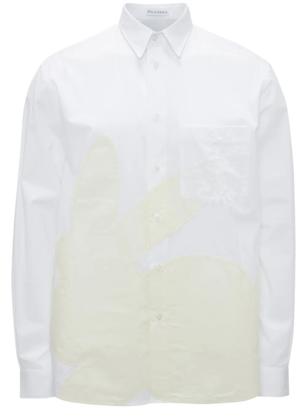 Blanco óptico, algodón, estampado gráfico en la parte delantera, logo bordado en el pecho, detalle de pliegues, cuello clásico, cierre con botones en la parte delantera, manga larga, puños con botón, bolsillo de parche en el pecho y dobladillo redondeado.