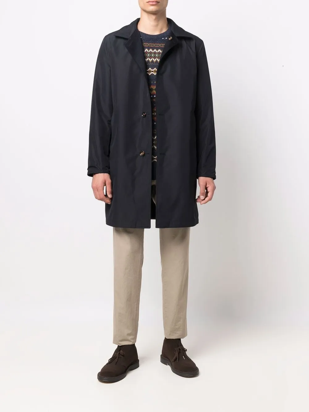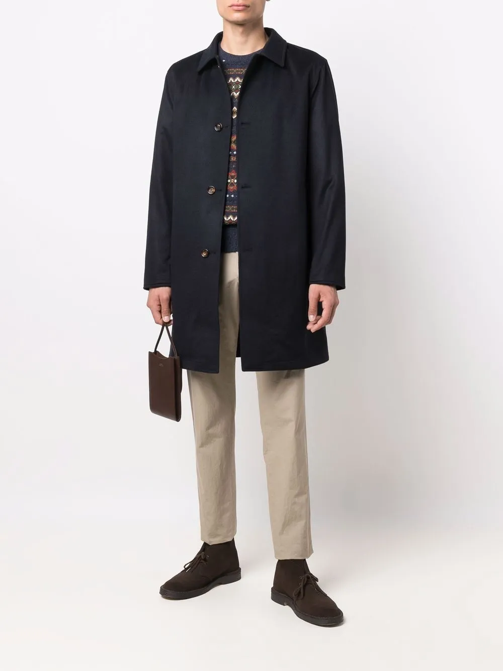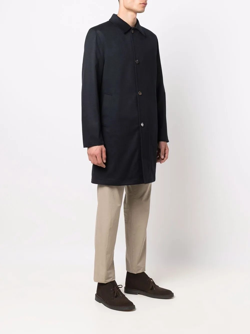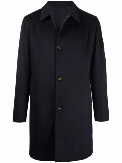 Reversible, cuello recto de pico, cierre con botones en la parte delantera, manga larga, dos bolsillos laterales abiertos y largura media. Material: Cachemira.