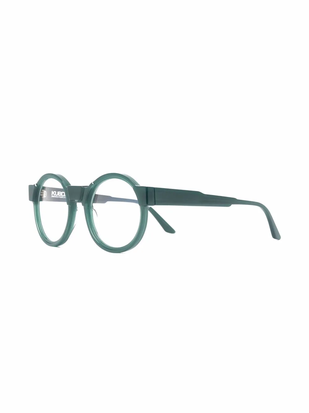 Montura redonda, patillas rectas y puntas curvadas. Material: acetato