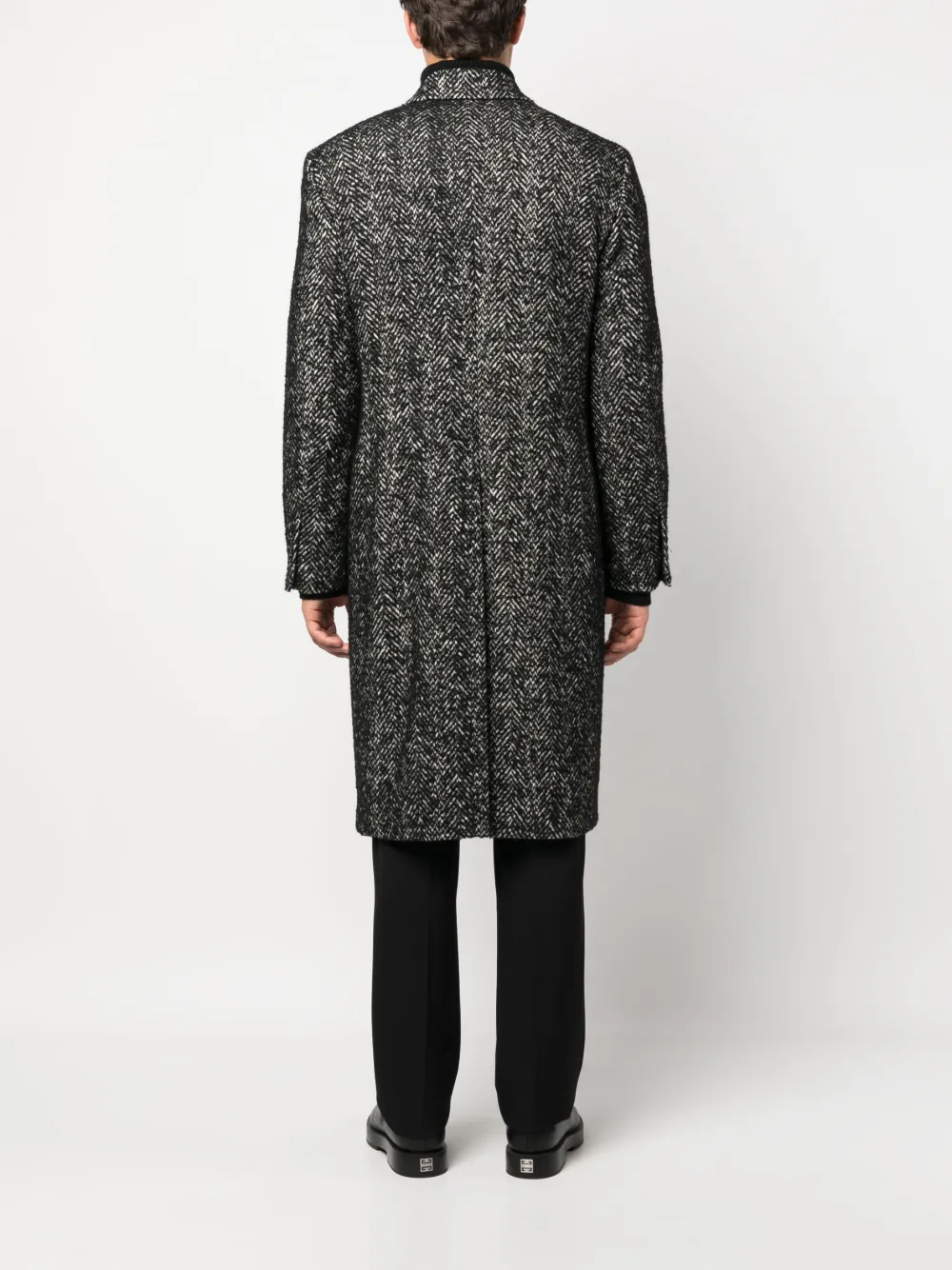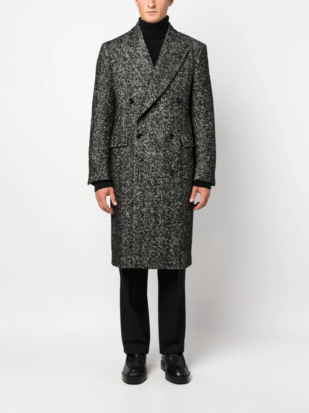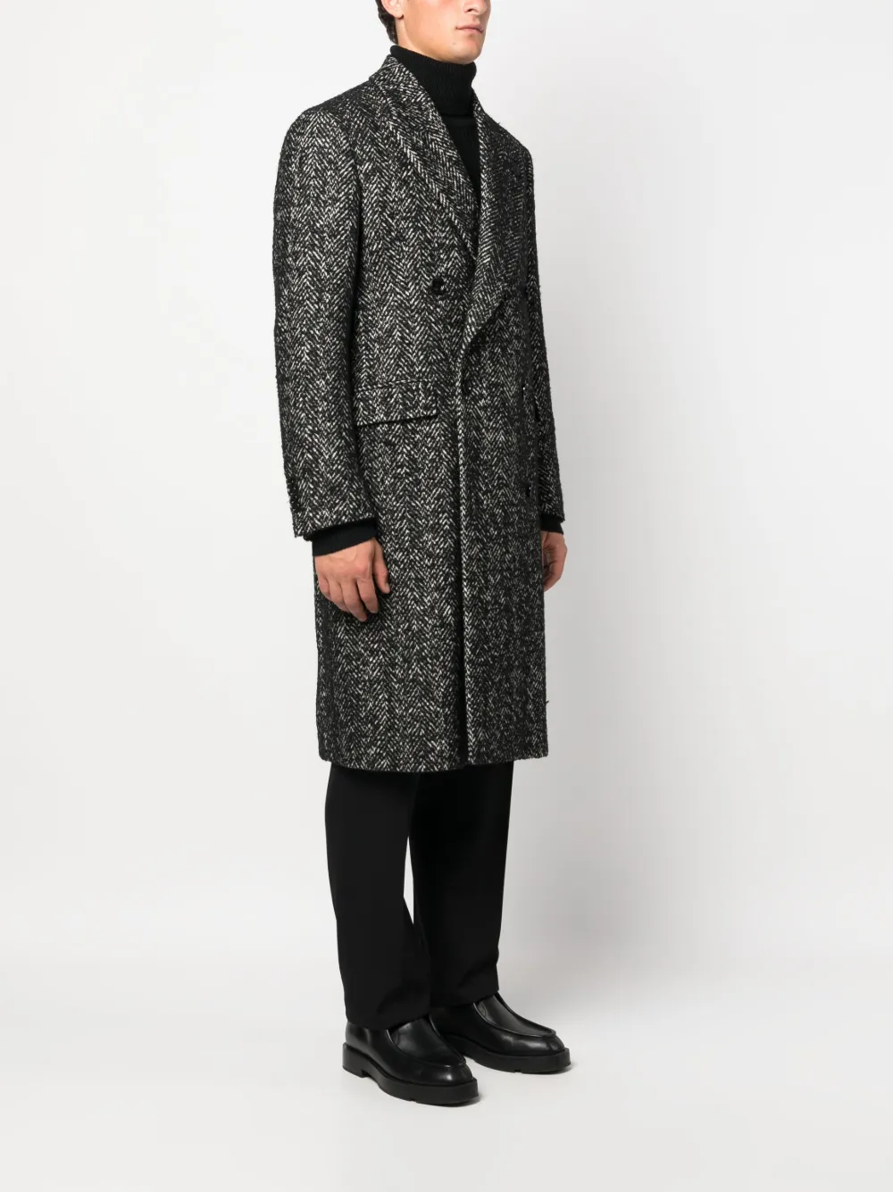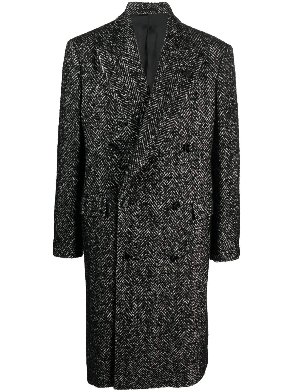double-breasted wool-blend coat from LARDINI featuring black, wool blend, chevron knit, brooch detail, wide peak lapels, double-breasted button fastening, long sleeves, buttoned cuffs, two side flap pockets, central rear vent and knee-length.