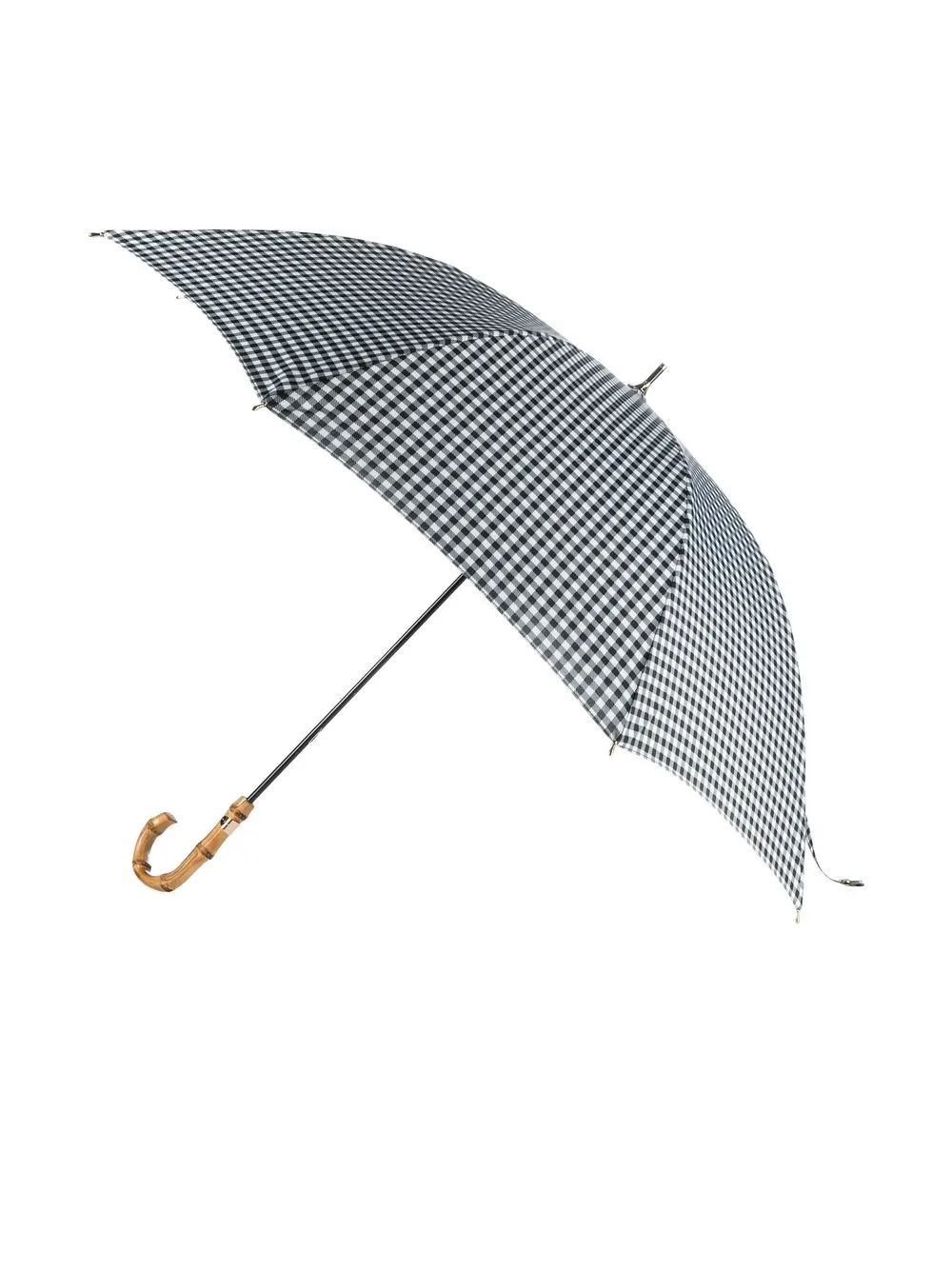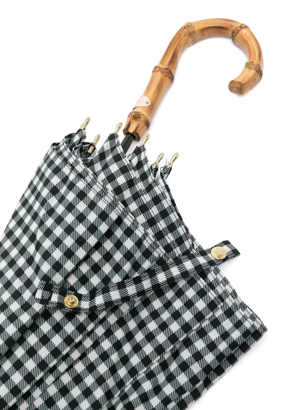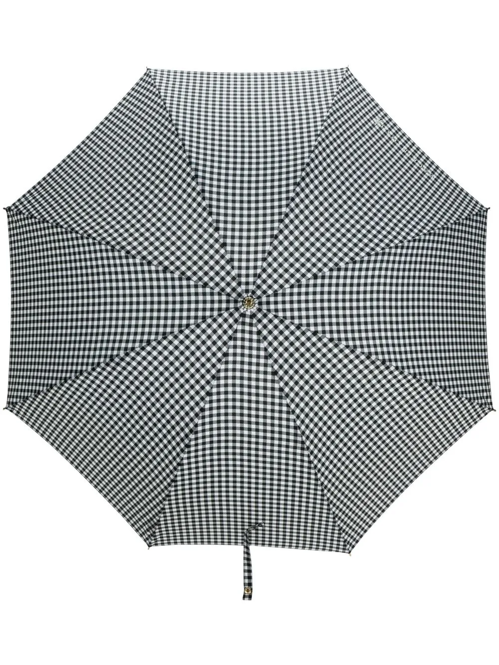 Negro y blanco, estampado a cuadros, acabado en tono dorado, placa del logo, botones con logo grabado, estampado del logo en la parte delantera, etiqueta del logo, mango esculpido, cierre con botones de presión y estuche.