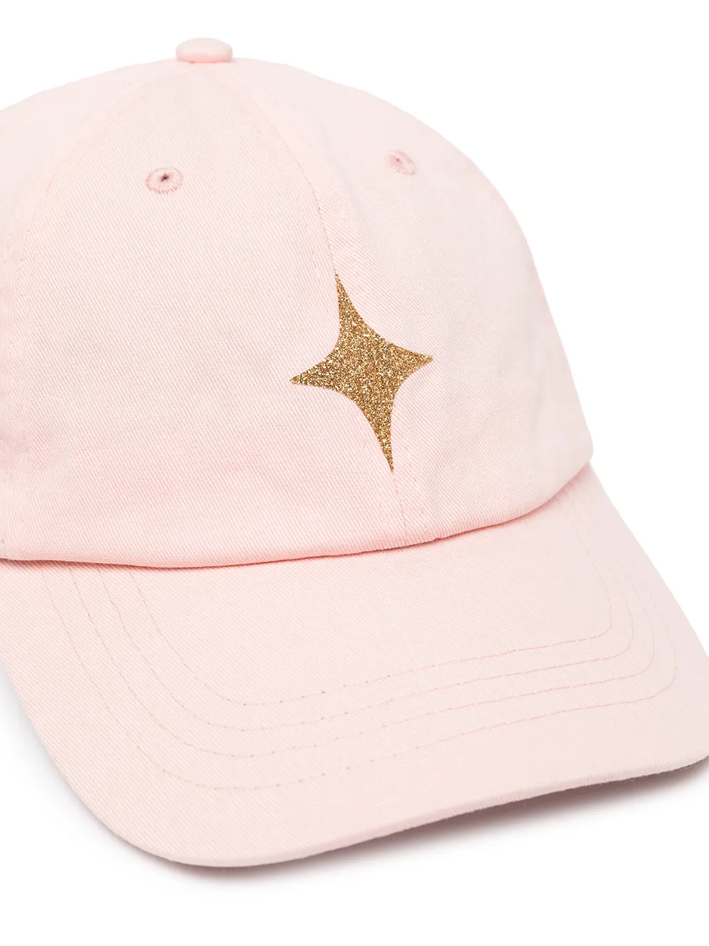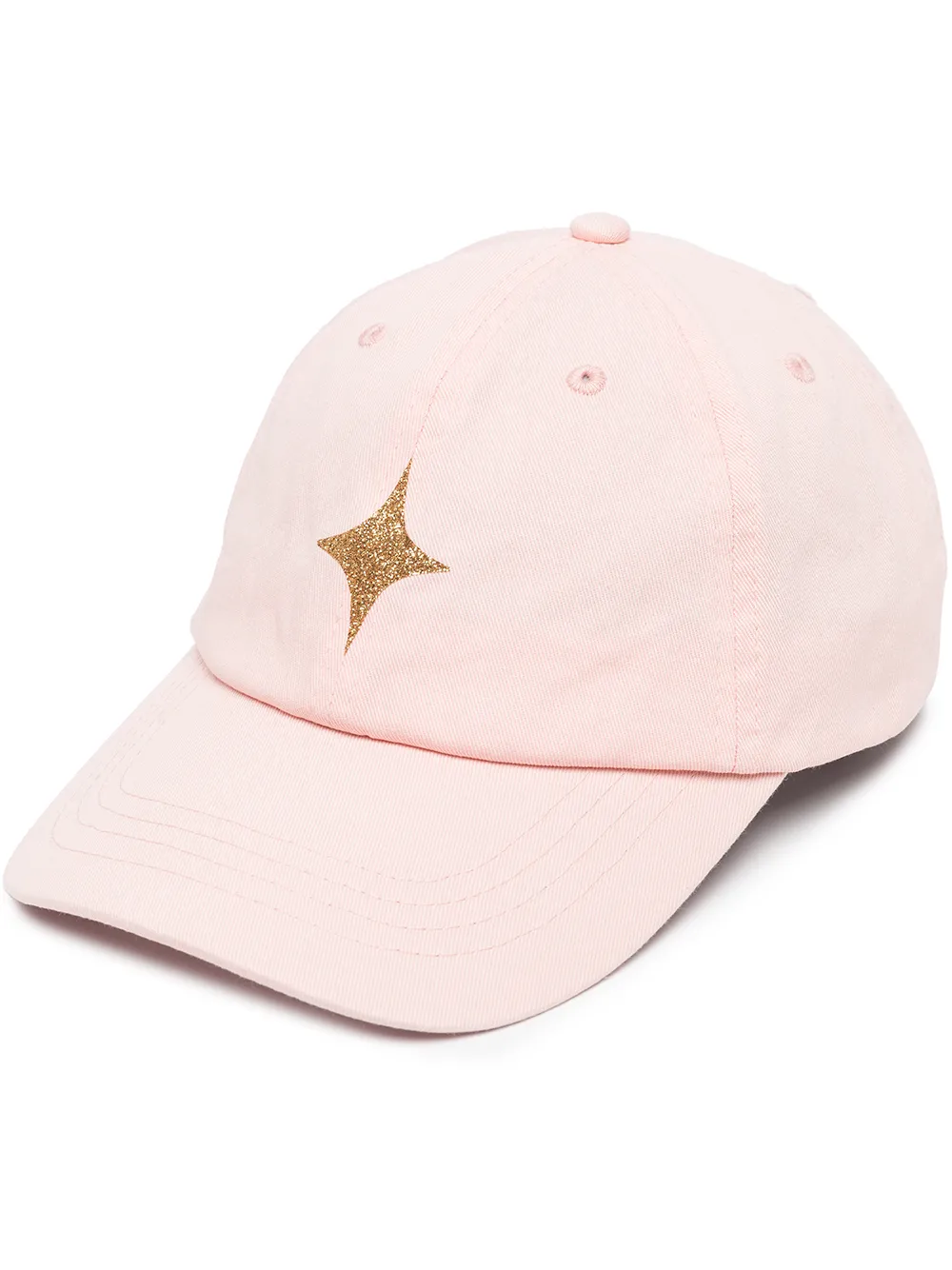 Detalle brillante, estampado de estrella, visera curva y correa ajustable en la parte posterior. Material: algodón.