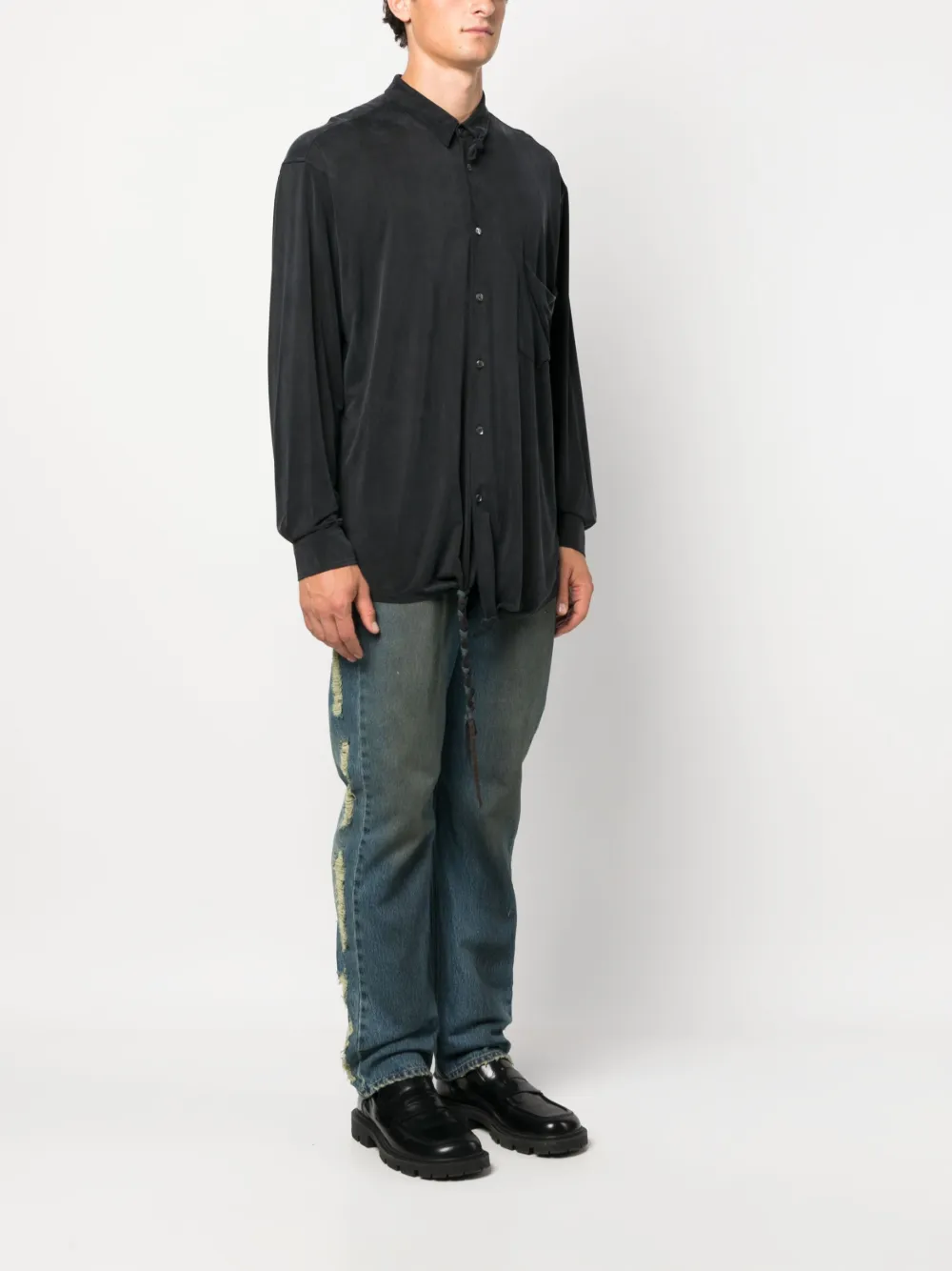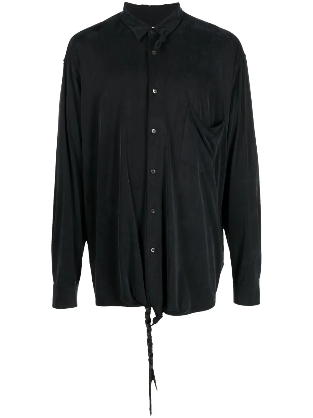 Freakkettone button-up shirt from MAGLIANO featuring black, stretch-design, draped design, straight-point collar, front button fastening, long sleeves, buttoned cuffs, chest patch pocket, curved hem and drawstring hem.