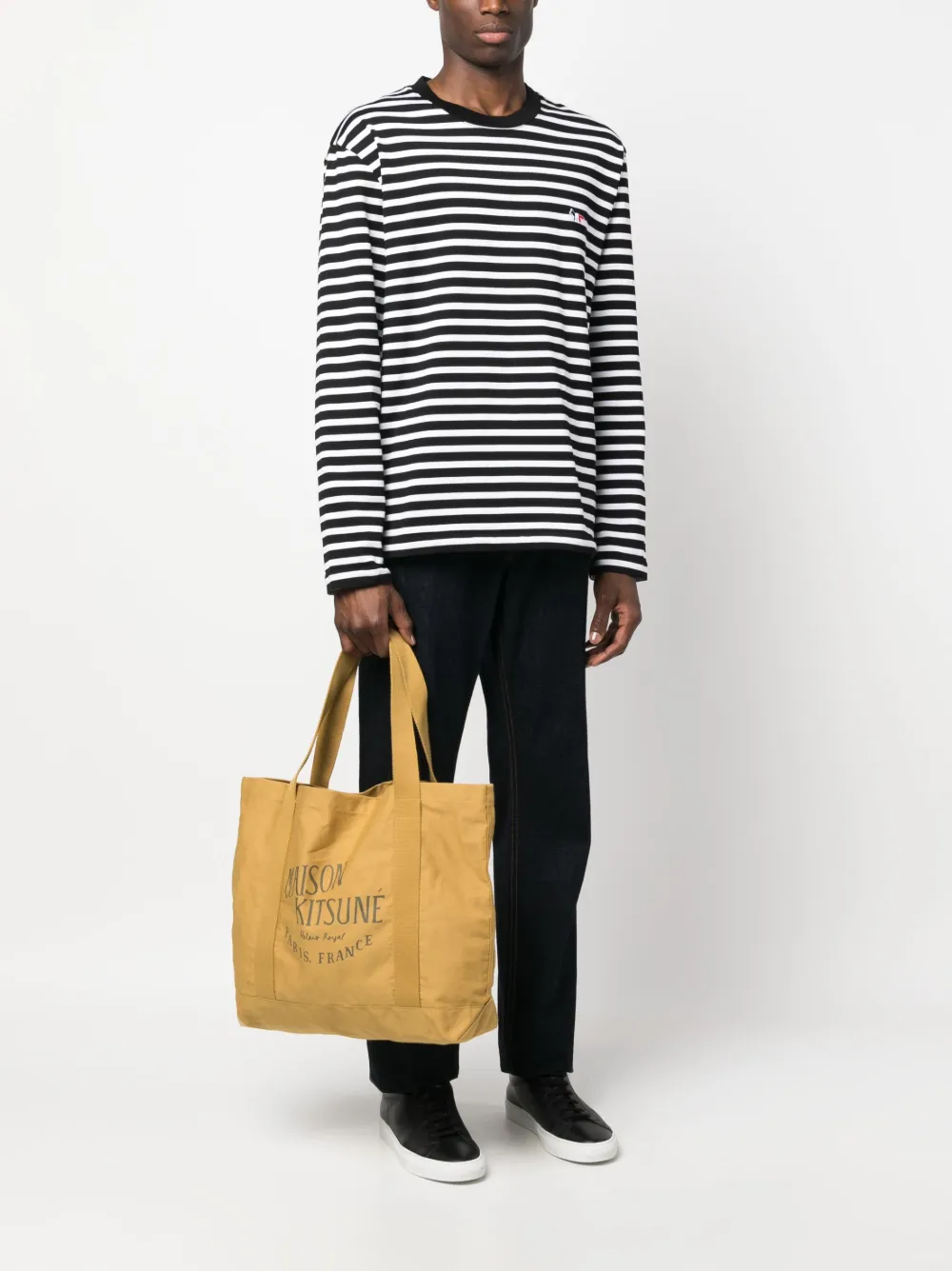 Amarillo mostaza, algodón, lona, ligero, estampado del logo en la parte delantera, dos asas planas en la parte superior, abierto en el tope, compartimento principal, bolsillo interno, etiqueta interna con logo y sin forro.
