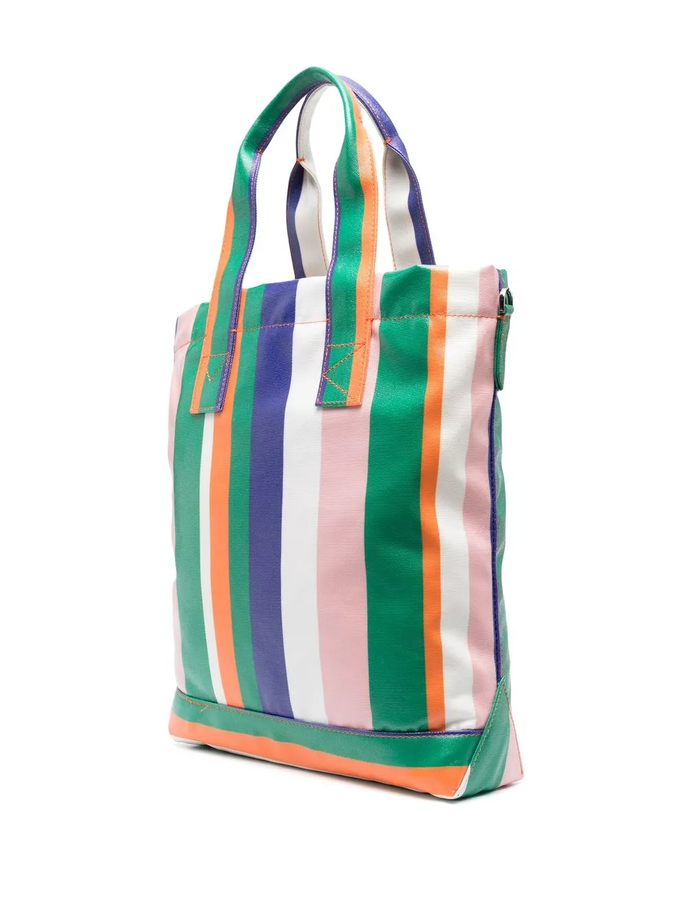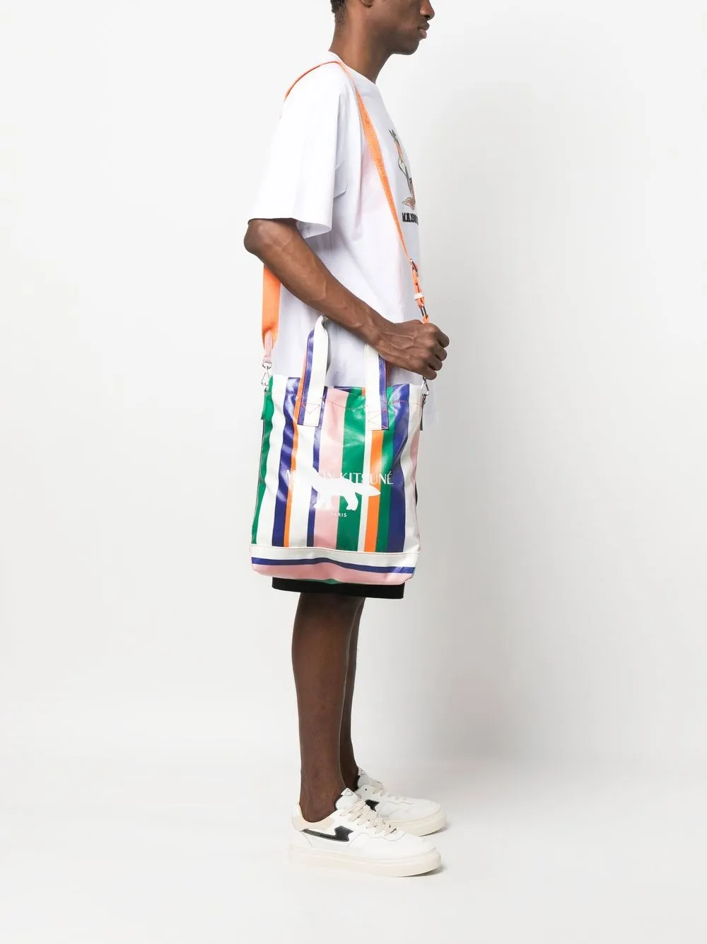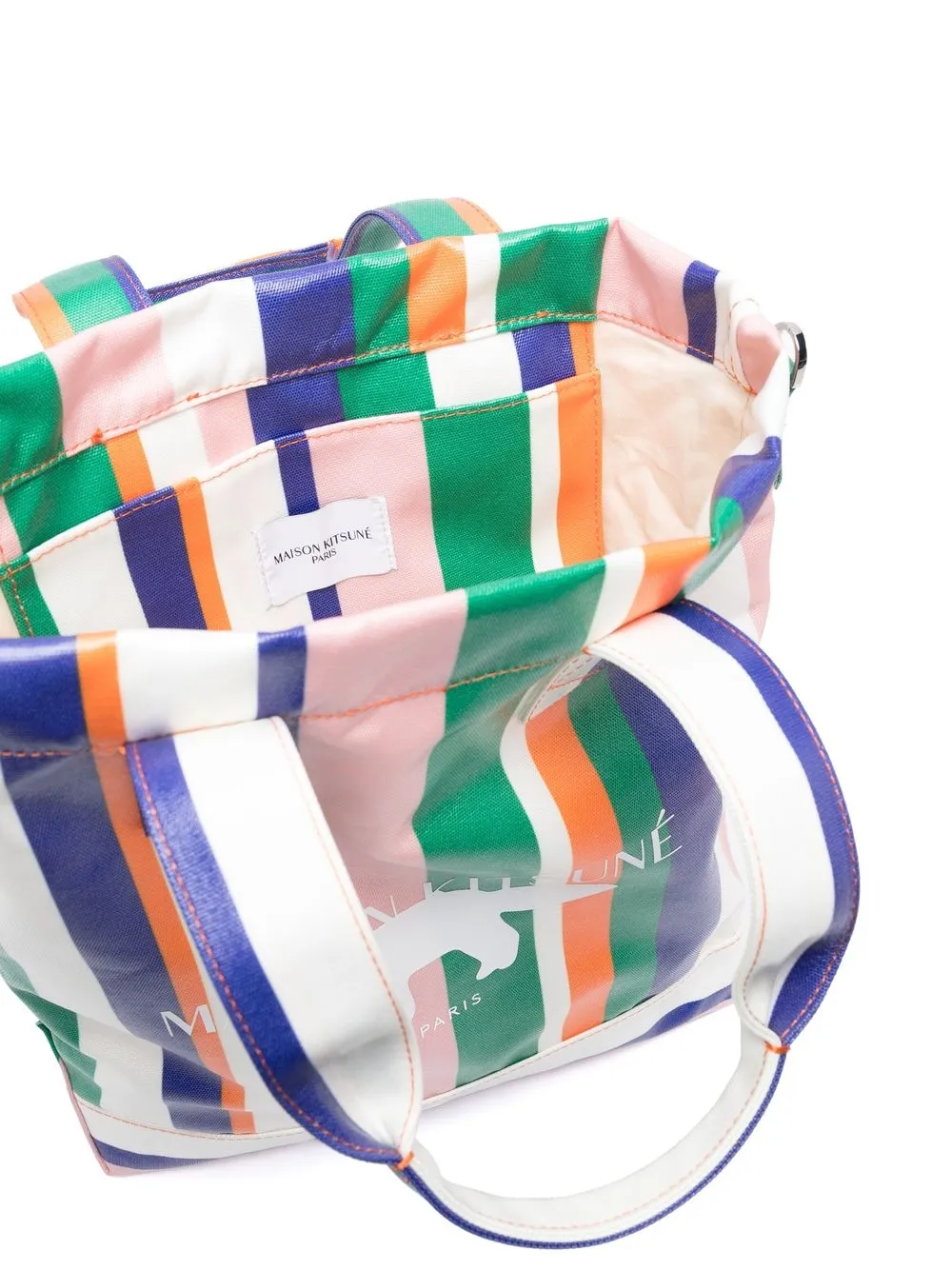 Naranja, multicolor, algodón, lona, motivo de rayas brillantes, motivo de zorro característico, estampado del logo en la parte delantera, correa ajustable y removible para el hombro y dos asas en la parte superior.