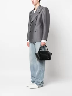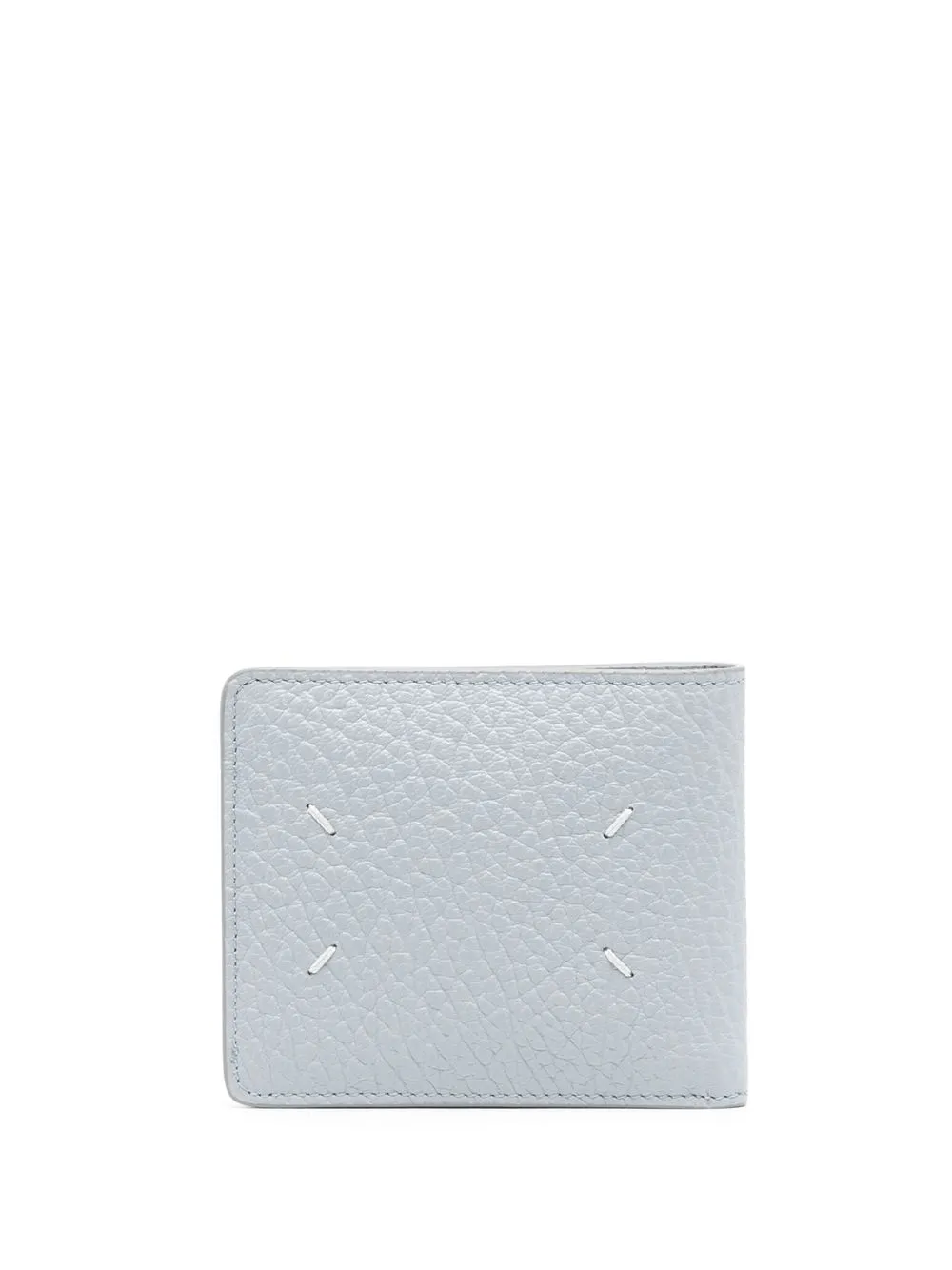Azul Alicia, piel de becerro, textura granulada, detalle de costura del logo, diseño plegable, compartimento para billetes, compartimentos internos para tarjetas y sello del logo en el interior.