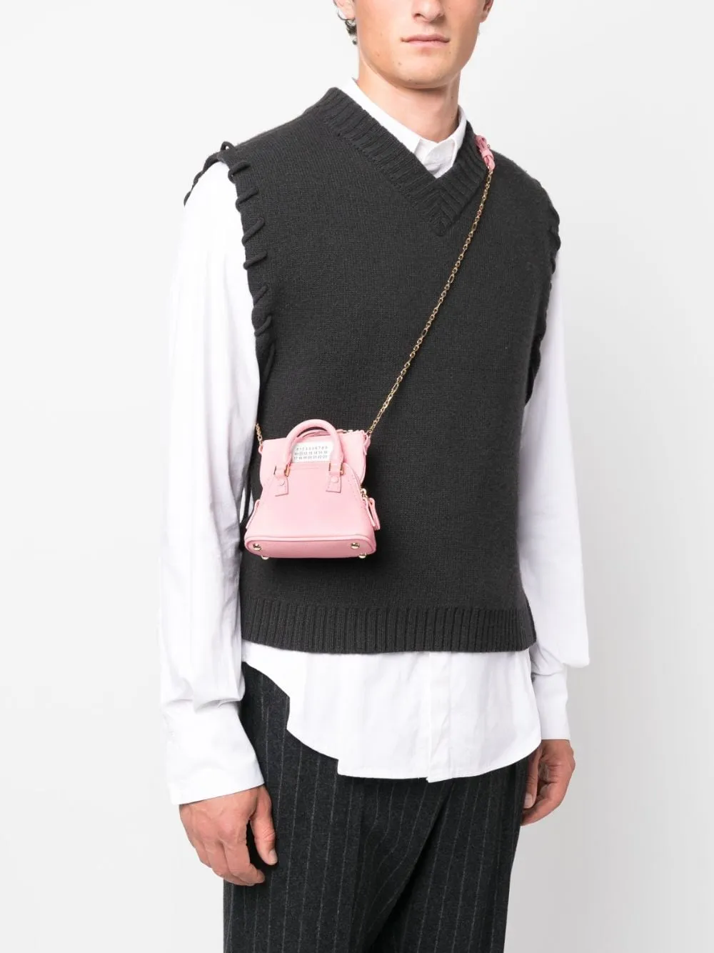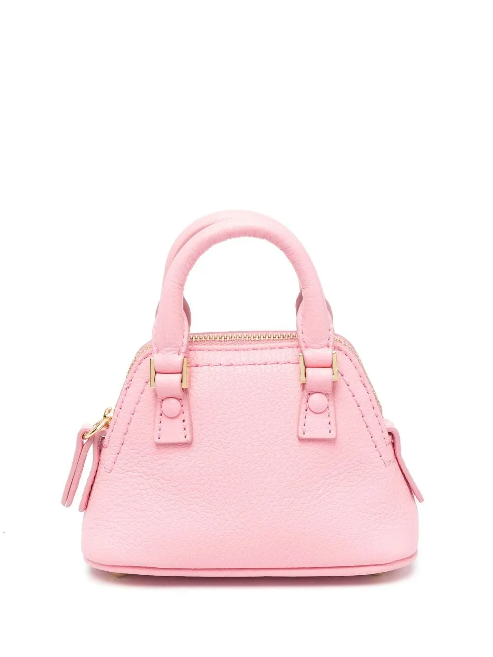Rosa, piel de becerro, piel de cabra, efecto texturizado, motivo característico de números, logo grabado en el interior, acabado en tono plateado, correa de cadena removible para el hombro, dos asas en la parte superior, cierre con cremallera en el tope y compartimento principal.