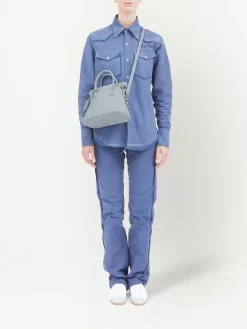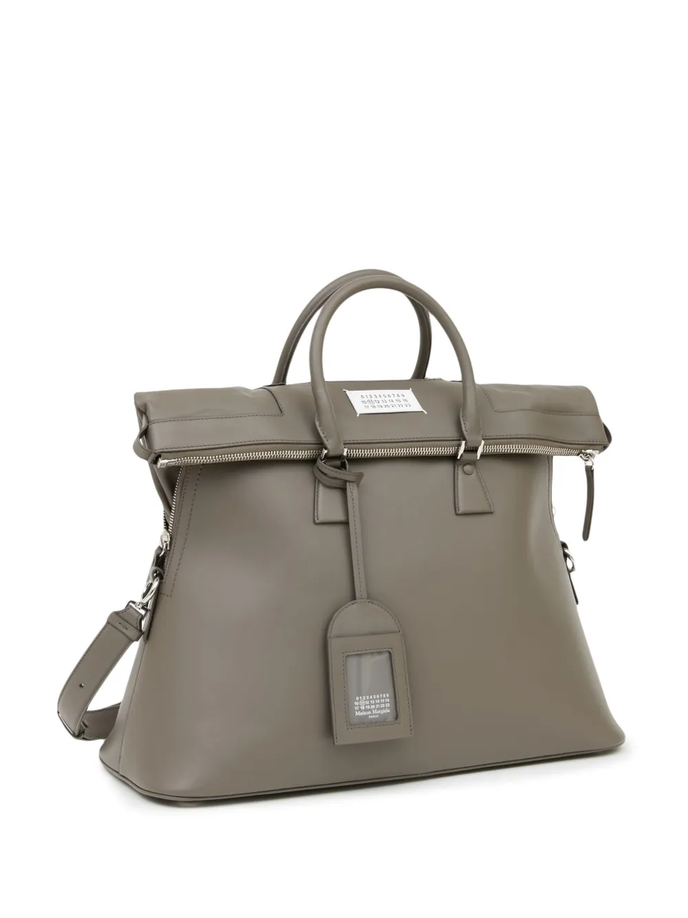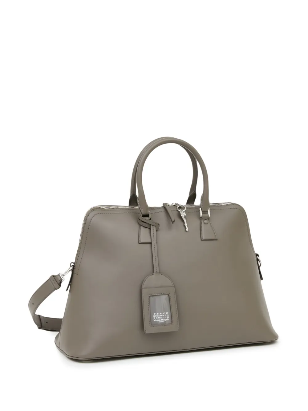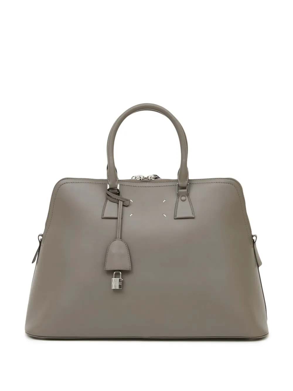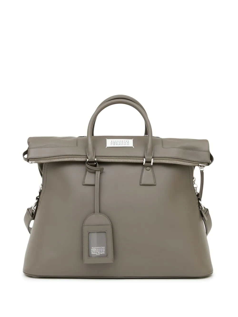 Gris, piel de becerro, motivo característico de números, detalle de costura del logo, etiqueta de cuero, cierre con cremallera en el tope, dos asas en la parte superior, correa ajustable y removible para el hombro y compartimento principal.