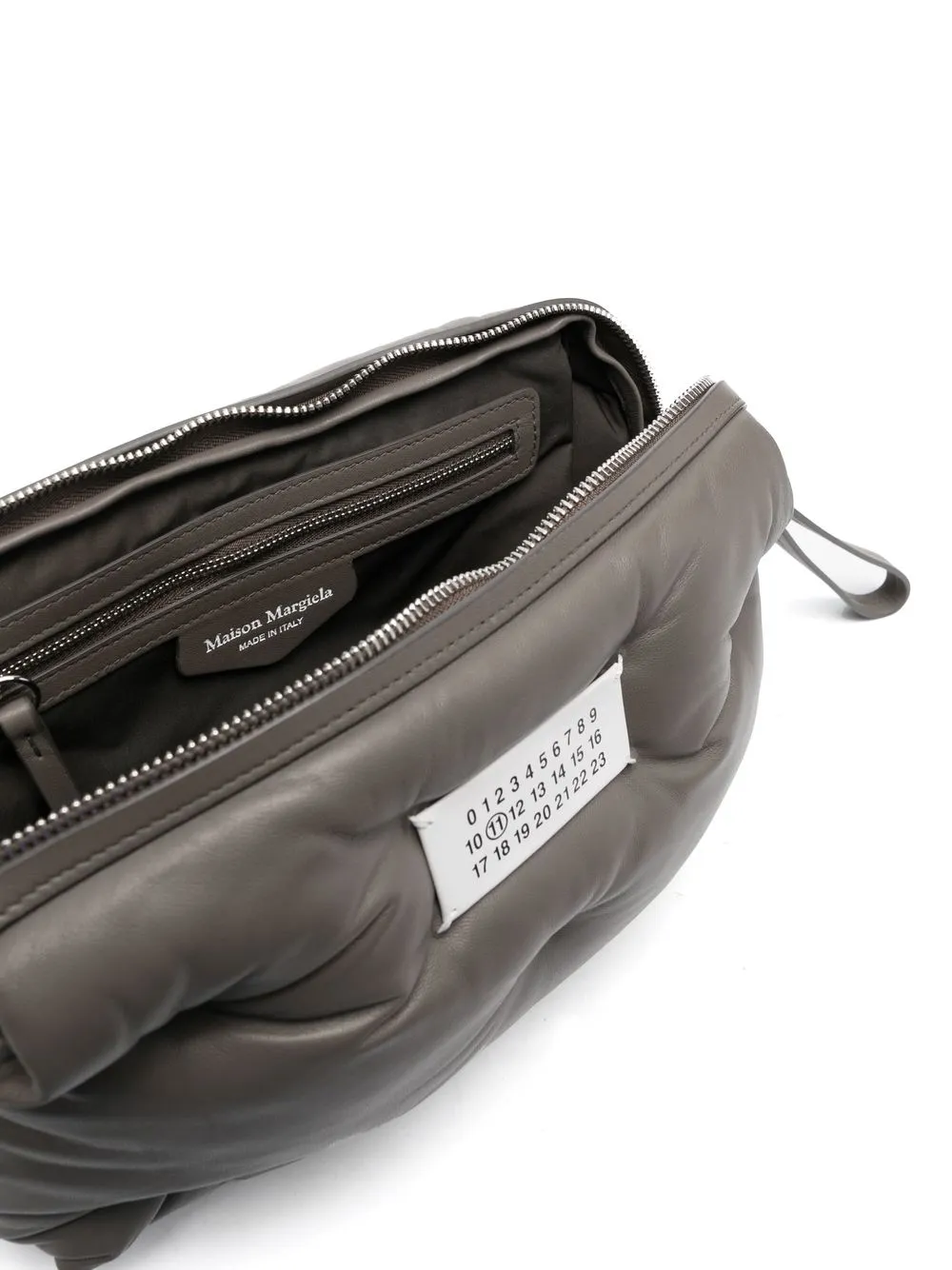 Gris frío, piel de becerro, parche de número en la parte delantera, diseño acolchado, cierre con cremallera en el tope y correa de hombro ajustable.