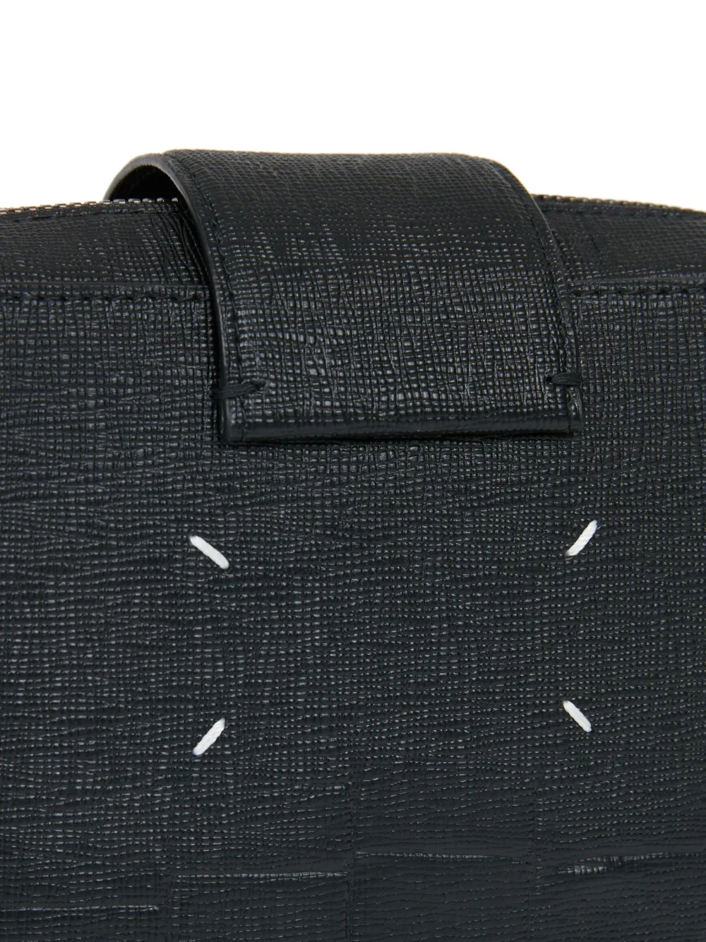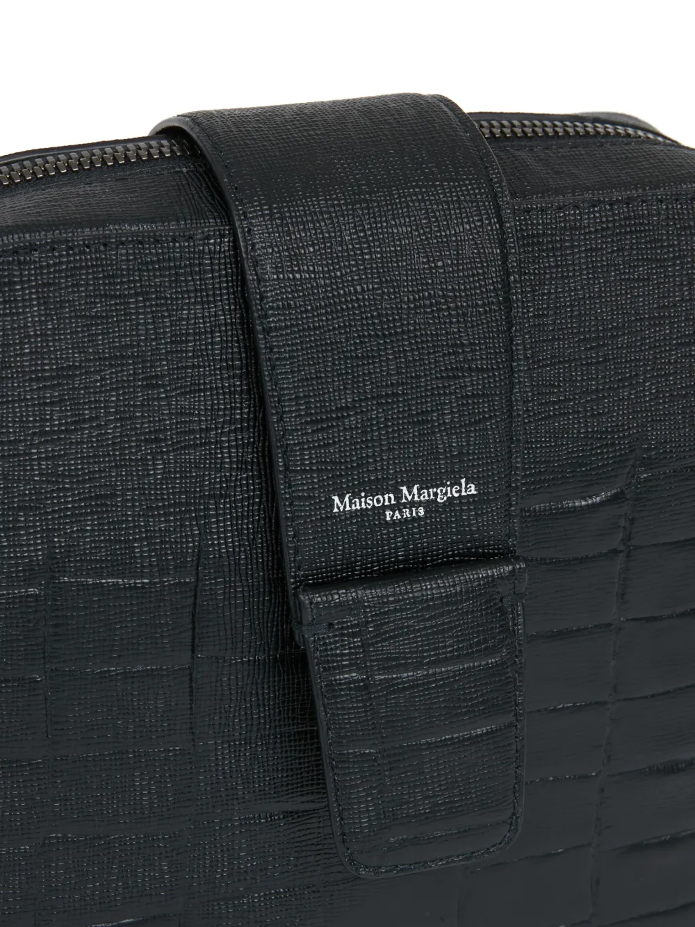 Negro, efecto de piel de cocodrilo en relieve, cierre con cremallera en el tope, correa de hombro removible y compartimento principal.