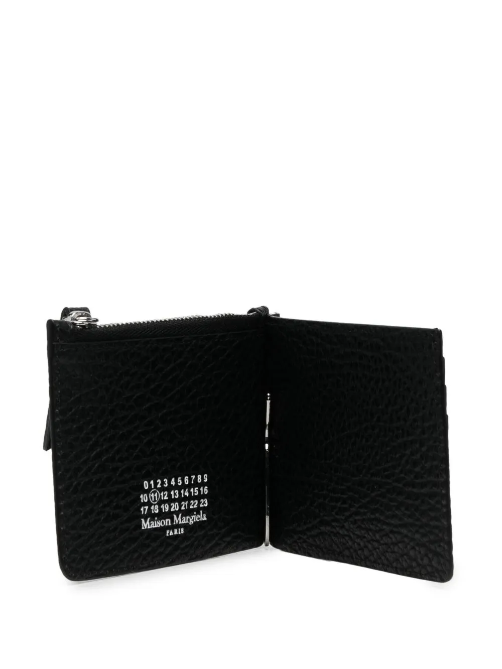 Textura granulada, diseño plegable, detalle de costura del logo, motivo característico de números, cierre con cremallera en el tope y compartimentos para tarjetas. Material: piel de bovino.