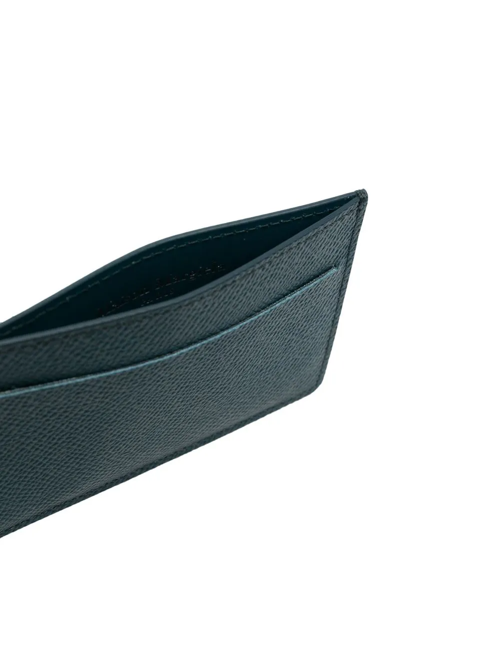 Azul, piel de becerro, detalle de costura del logo y compartimentos para tarjetas.